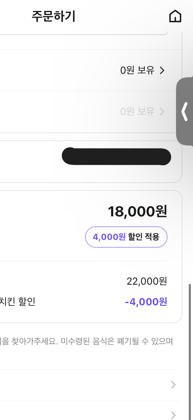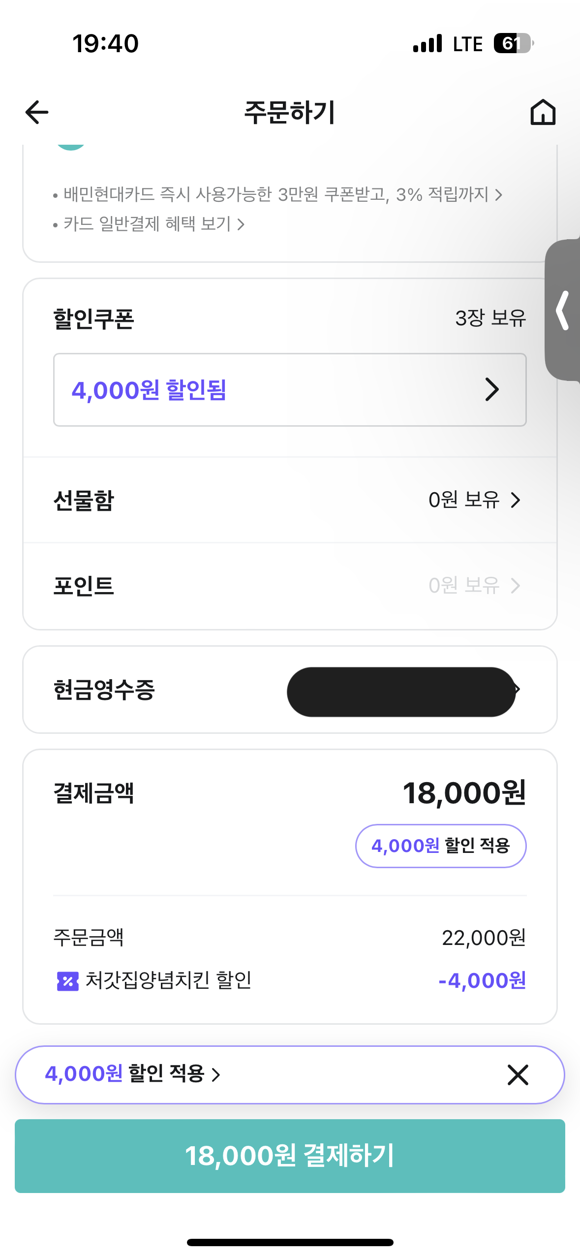 배달의 민족 앱에서 할인쿠폰 적용 시 큰 어려움 없이 적용 할 수 있습니다. 주문하기 버튼을 클릭하고 결제버튼 누르기전에 할인쿠폰 공간에 보시면 사용가능한 쿠폰 매수와 함께 정보가 있습니다. 클릭하시면 해당 되는 쿠폰을 적용 할 수 있습니다. 고물가 고금리로 인해 치킨 가격이 올라 22000원에 먹을뻔 했으나 신규 오픈 가게라 그런지 4천원 할인 받아 18000원에 결제했습니다.