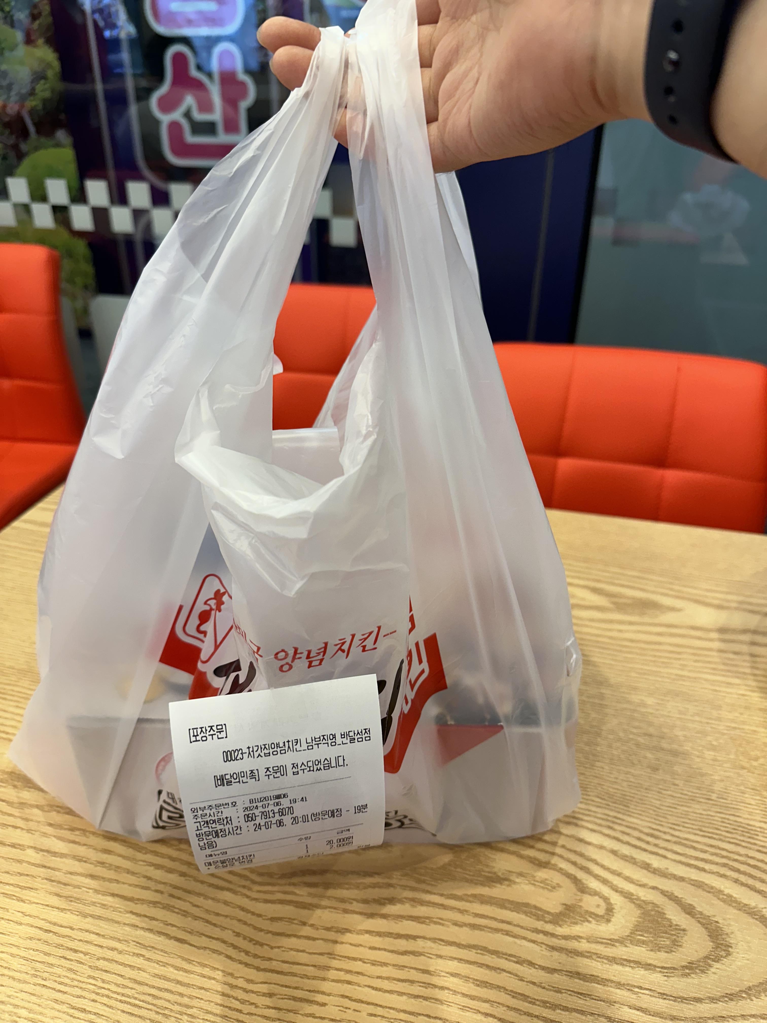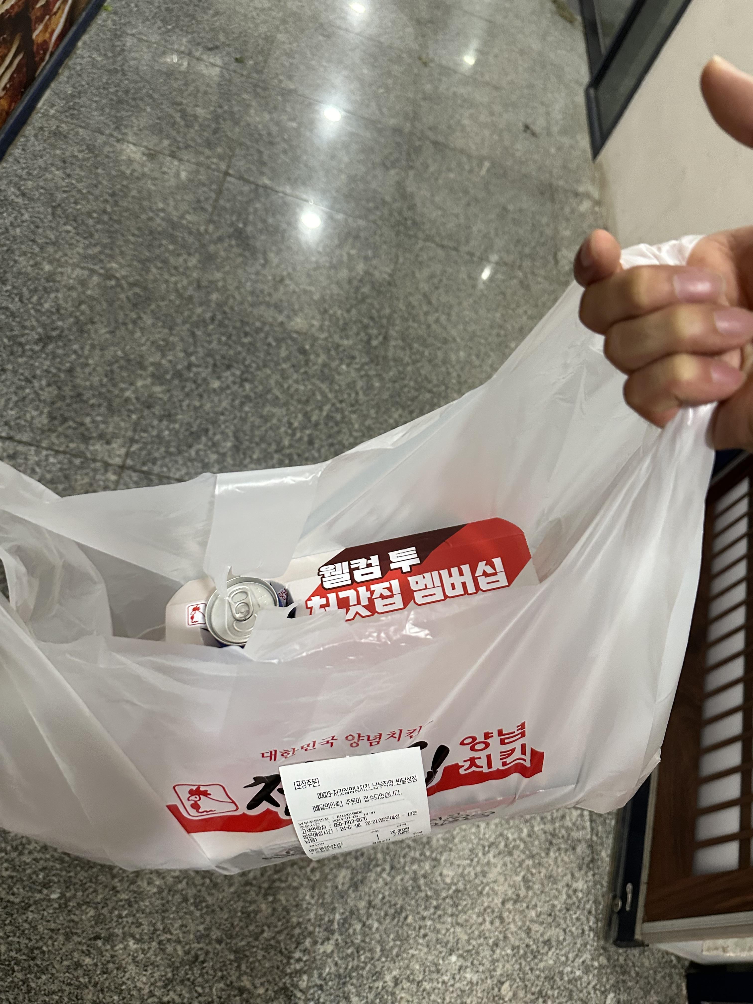 처갓집양념치킨 반달섬점에서 포장 주문했던 매운불양념치킨은 정확한 픽업시간에 맞춰서 음식을 수령했습니다. 봉지안을 보니까 탄산음료 콜라와 단무지 치킨이 들어있는 것을 볼 수 있습니다. 포장 주문을 수령하니까 핸드폰 푸시 알람으로 픽업이 완룓 되었다는 것을 받아볼 수 있었습니다.