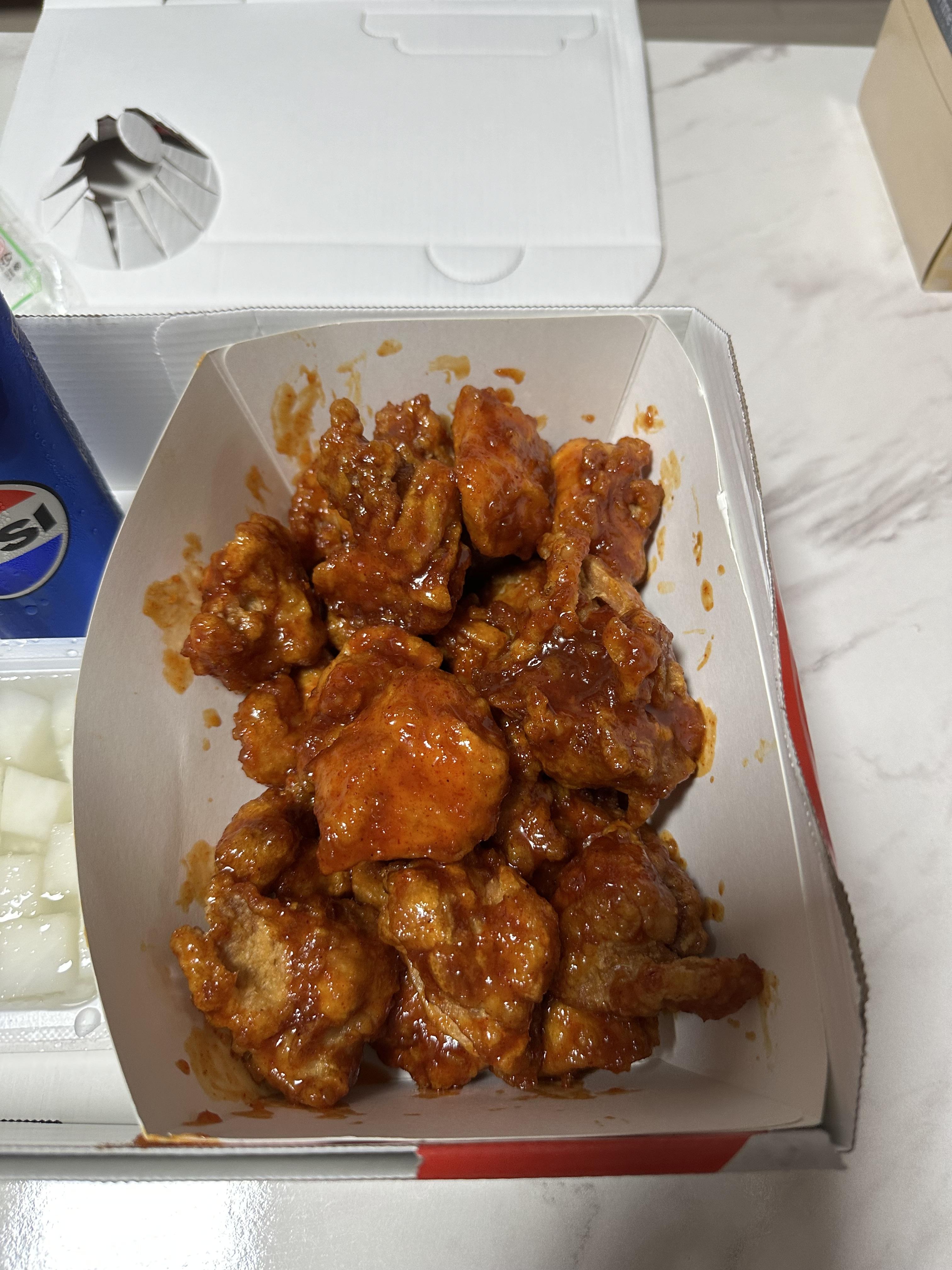 주말에는 반달섬공원 산책과 함께 배달의민족 앱에서 최근 오픈한 처갓집치킨 안산 반달섬을 찾습니다. 치킨집 메뉴는 항상 동일한데요.다양한 이름의 프린차이즈 치킨집이 늘어나지만 프랜차이즈 가게 개성에 맞는 다양하고 재미있는 이름을 볼 수 있습니다. 평소 매운것을 좋아하는 저로써는 매운불양념치킨이라는 것이 눈에 보였습니다. 이름처럼 매운부양념치킨이라고 했지만 사실 먹어보니까 매운맛은 거의 느껴지지 않았습니다. 배민앱에서 매운불 양념치킨 소개하는 문구처럼 신세대 입맛에 맞는 매운 맛이었습니다.