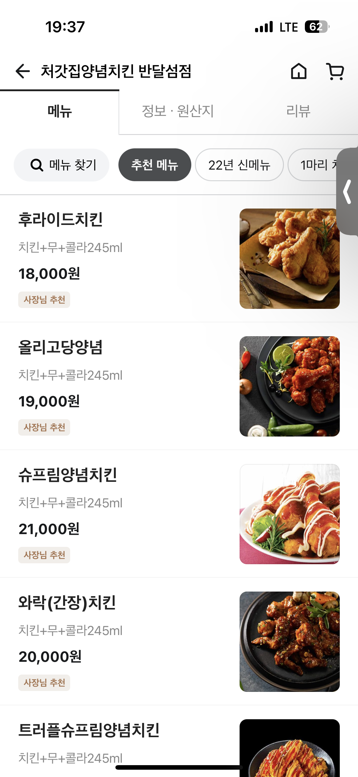 - 추천메뉴로는 후라이드치킨, 올리고당양념치킨, 슈프림양념치킨, 와락 간장 치킨, 트러플슈프림양념치킨이 있습니다.