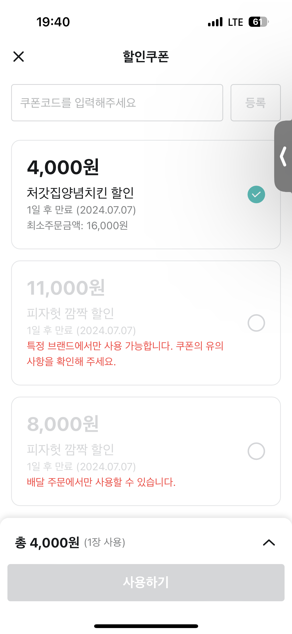 - 사용 불가능한 쿠폰은 비활성화 되어있어요