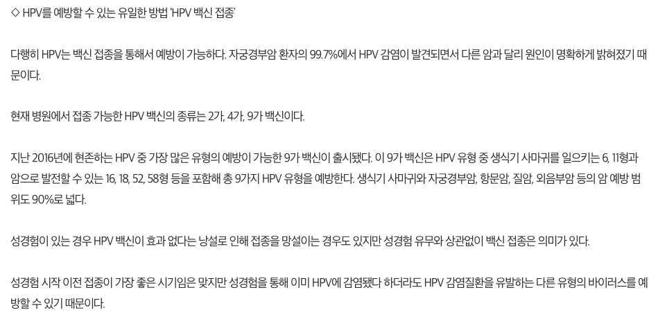 현재 HPV 국가 무료 예방접종 지원사업에서 지원하는 백신으로는 2가지가 있습니다. 가디실과 서바릭스가 있습니다. 주요 질환에 대해서 90%의 예방효과가 있다는게 확인 되었습니다. 백신의 효과를 보기 위해서는 감염 전 예방접종을 맞는 것 뿐만 아니라 필요한 횟수만큼 백신을 맞아 예방 접종을 완료 하는 것이 더 중요하다고 합니다. 감염 예방에 필요한 접종 횟수는 첫 접종 나이에 따라 다르므로 접종 권장 일정에 맞춰 접종을 완료 하라고 전달 하고 있습니다.
