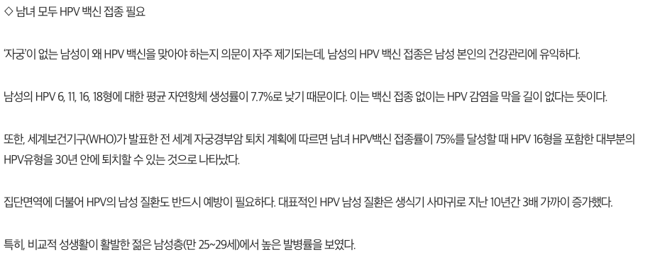 HPV 남성질환은 생식기 사마귀로 10년간 3배 가까이 증가 했으며 주로 젊은 남성층 만25~29세에서 높은 발병률을 보인다고 해요. 세계보건기구(WTO)가 발표한 전 세계 자궁경부암 퇴치 계획에 따르면 남녀 HPV 백신 접종률이 75% 달성할 때 HPV 16형을 포함한 대부분의 HPV 유형을 30년 안에 퇴치할 것으로 보고 있다고 합니다.