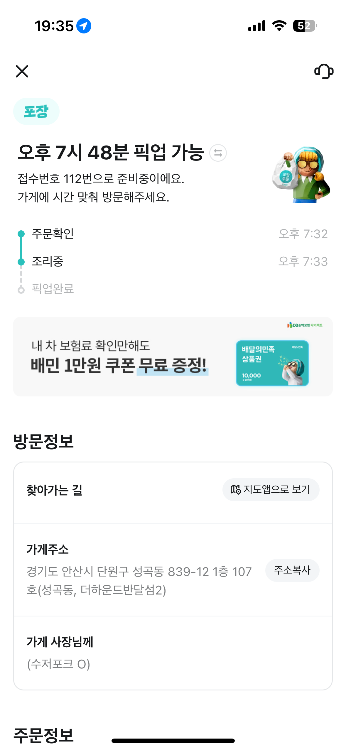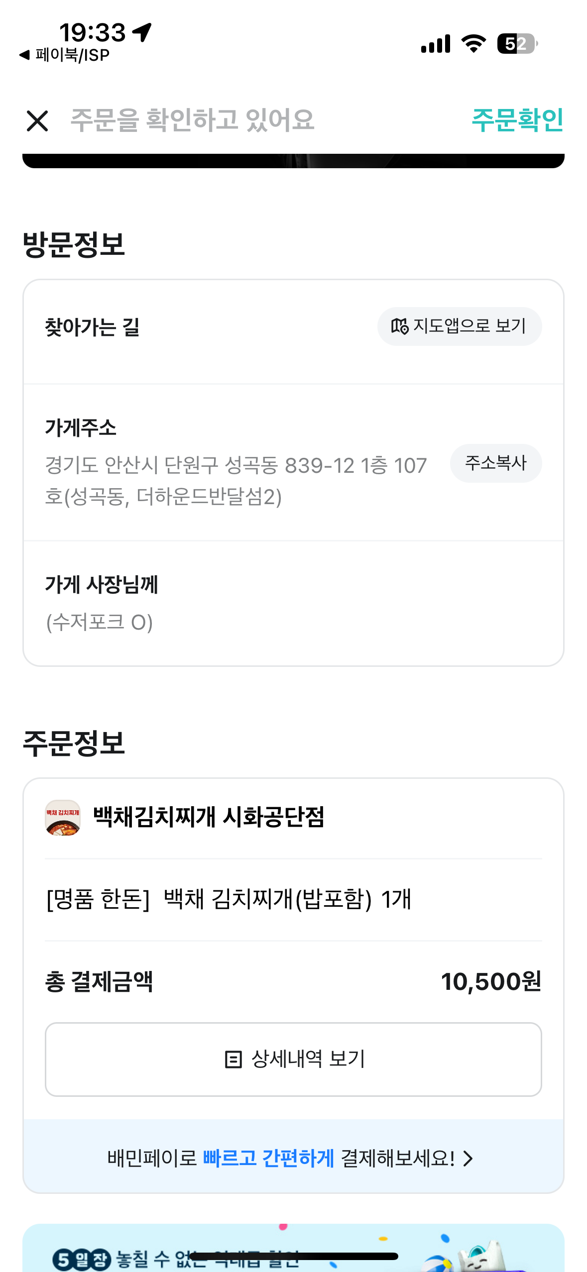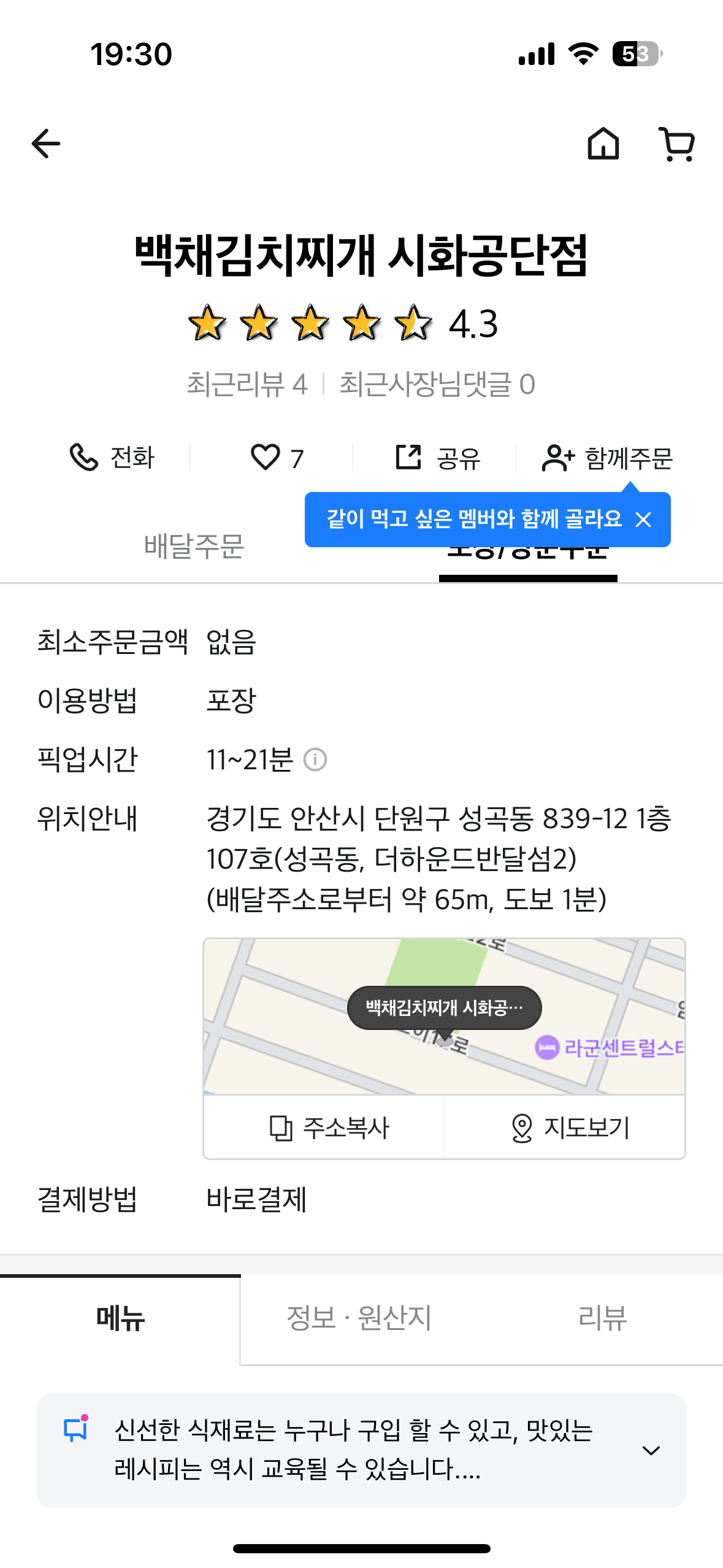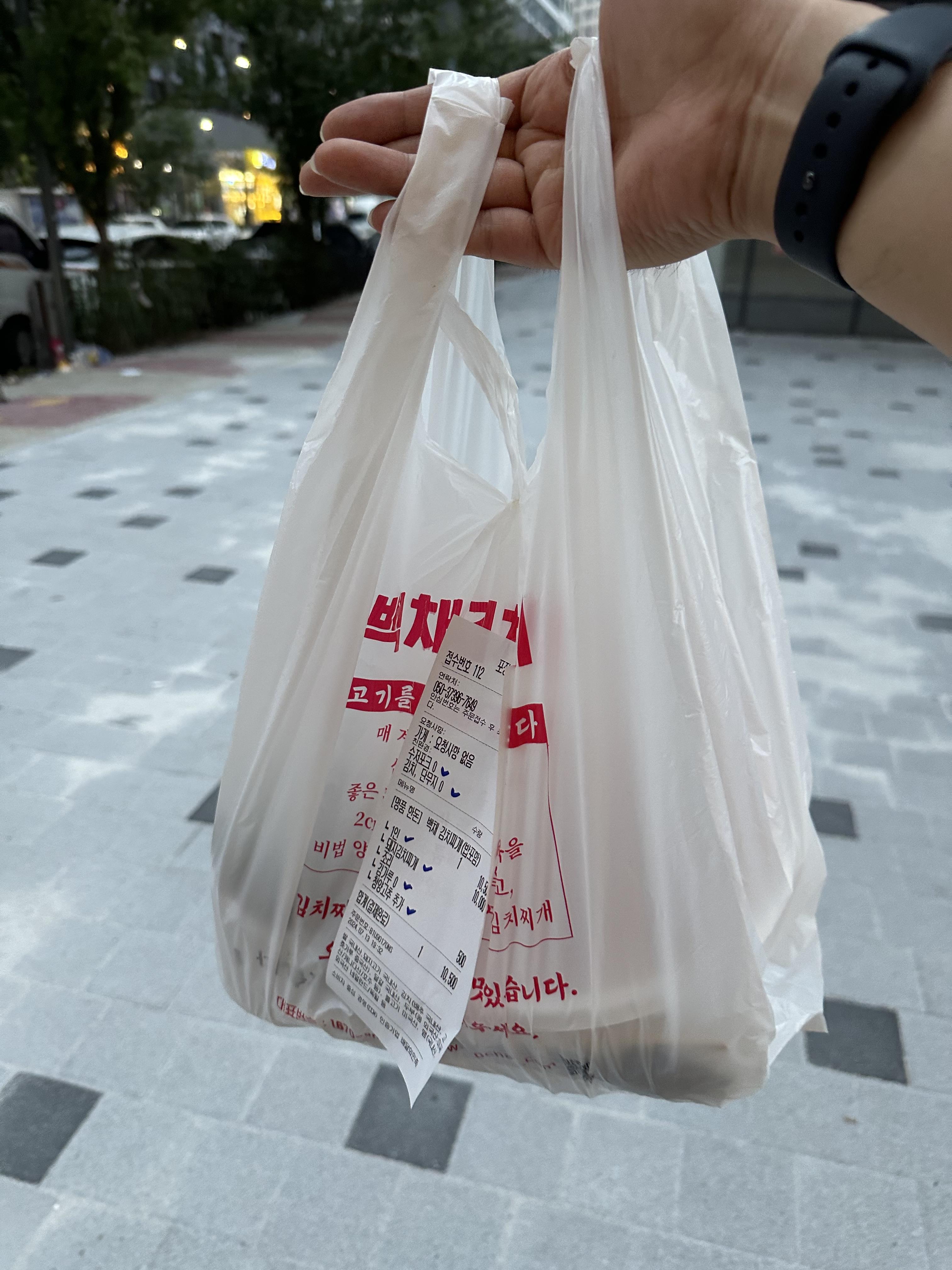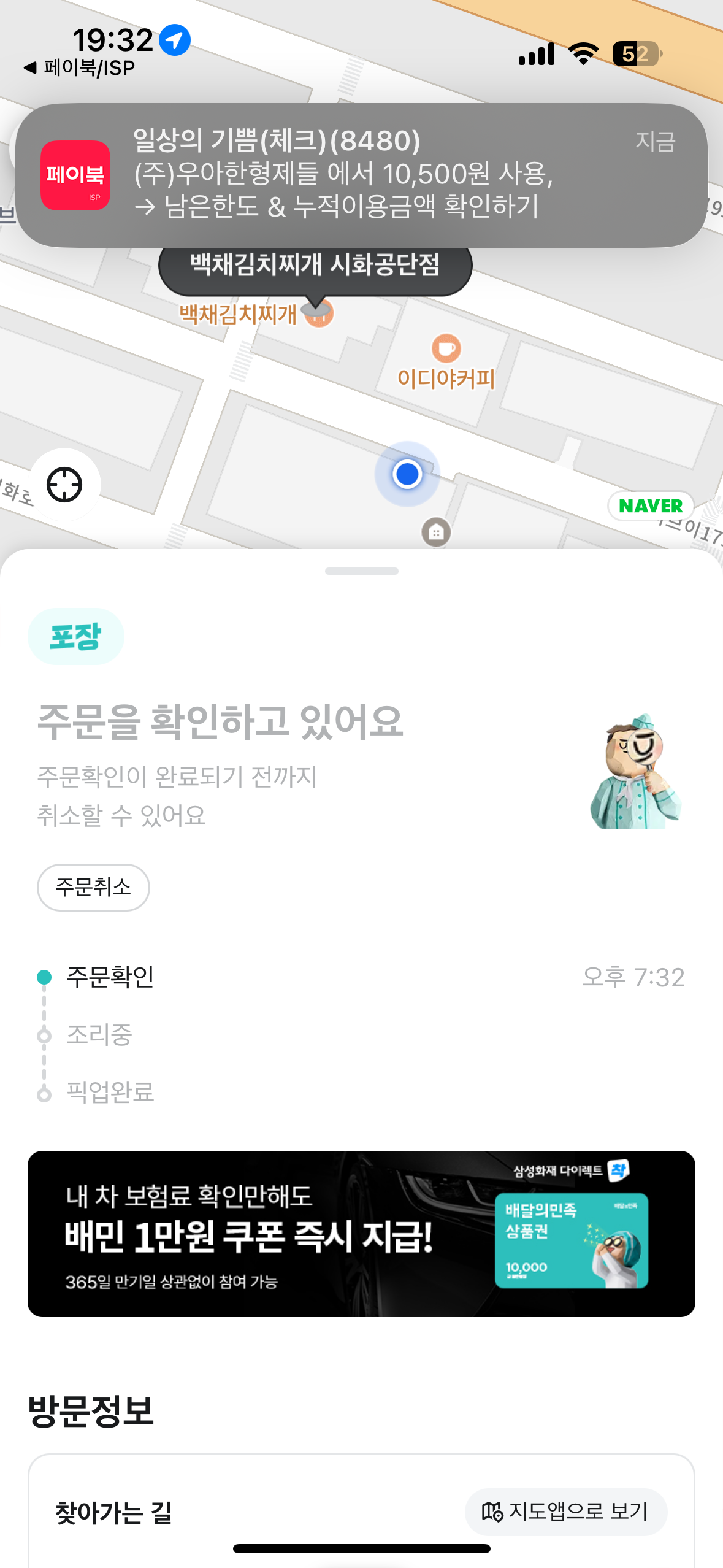 참고로 마리나큐브 1층에서 지난번 이용했던 여우애 김밥의 경우 일요일에 휴무이기는 하나 가끔씩 8시 반에도 일하는 경우가 있었습니다. 과거에 배달앱이 존재하기전에는 대부분 전화로 주문을 받고 진행했다면 이제는 배달앱을 통해서 굳이 서로의 목소리를 듣지않더라도 앱을 통해 버튼 몇번 클릭하면 주문과 동시에 승인까지 할 수 있는데요. 백채김치찌개도 주문하고 1분뒤에 바로 승인이 되었습니다. 시간이 주말 저녁 7시반이 넘는 시간이라 혹시 마감되면 어쩌나 걱정했는데 다행이 주문 받아주었고 7시 48분에 픽업이 가능하다는 배달의 민족 푸시 알림을 받았습니다.