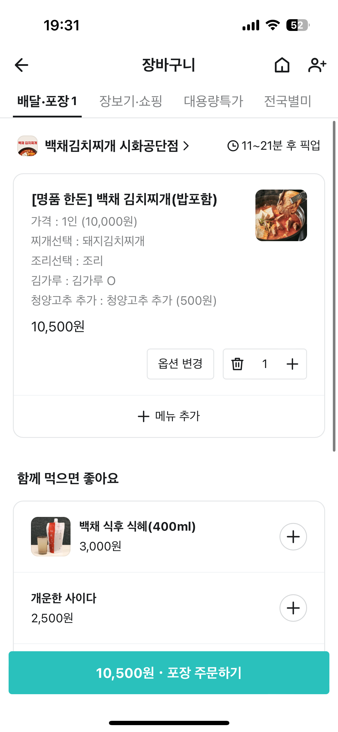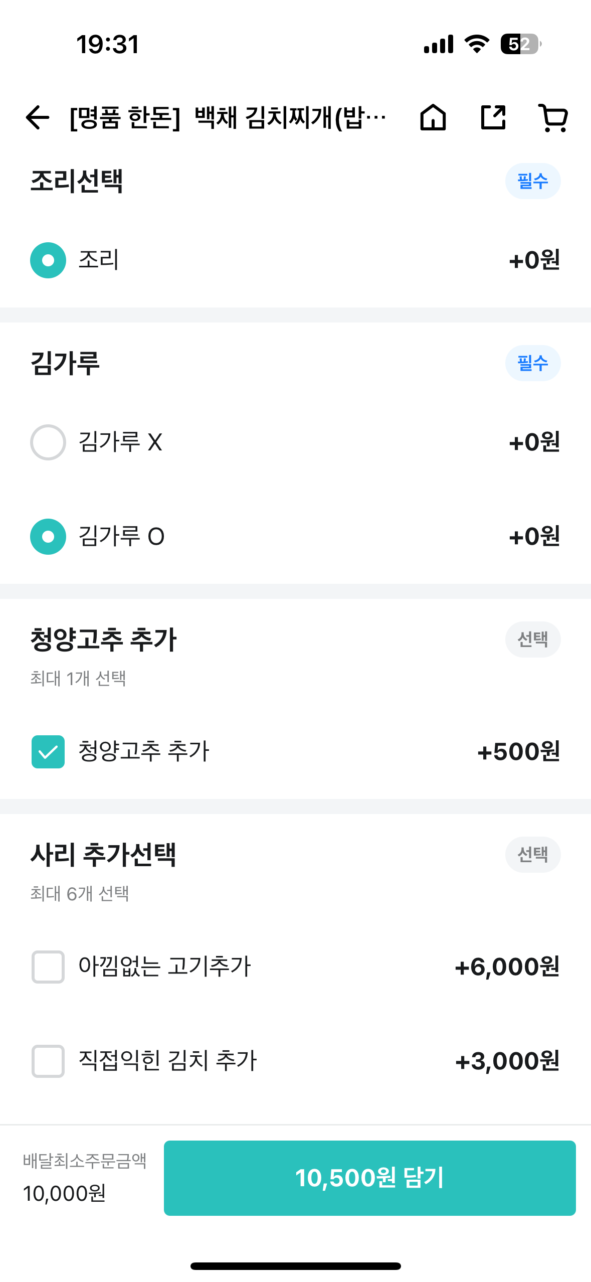 반달섬 내에 상권이 활성화 되기전에는 배달의민족을 통해 비싼 배달료를 지불하면서 먹었지만 이제는 배달료 없이 포장만으로도 가능해져서 너무 좋았습니다. 지난 6월달에 마리나큐브와 아티스큐브 오피스텔 뒤에 더하운드호텔이 생겼습니다. 더하운드 호텔이 들어서기 전 1-2달전에 이미 백채김치찌개가 입점되었습니다. 치킨집은 사실 술안주에 적합하지만 김치찌개는 밥종류입니다. 한국인은 밥힘으로 산다는 말처럼 정말 중요한데요. 백채찌개 안산 반달섬점은 개업 후부터 매장 손님도 많고 배달과 포장 손님도 많은 것 같습니다. 그만큼 하루 삼시세끼 밥먹는 한국인에게 밥은 중요한 요소같습니다. 저는 배민 포장을 통해 주문 했습니다. 백채김치찌개 포장 하기전에는 잘 몰랐는데 일단 1인 가구를 위해서 1인 메뉴도 가능했습니다. 대표 메뉴이 백채김치찌개는 가구원수에 맞게 판매 되고 1인 가구의 경우 단 돈 만원이었습니다. 그외에도 내일도 먹는 찌개 1인 세트라고 가격이 좀 나가지만 세트메뉴로써 다양한 메뉴가 함께 있었습니다. 처음 먹어보는거니까 많은 메뉴보다는 김치찌개 하나라도 맛있게 먹어보자는 마음으로 명품 한돈 백채 김치찌개 1인을 시켰습니다. 유료 옵션으로 청량 고추 추가 해서 10,500원에 결제하였습니다.