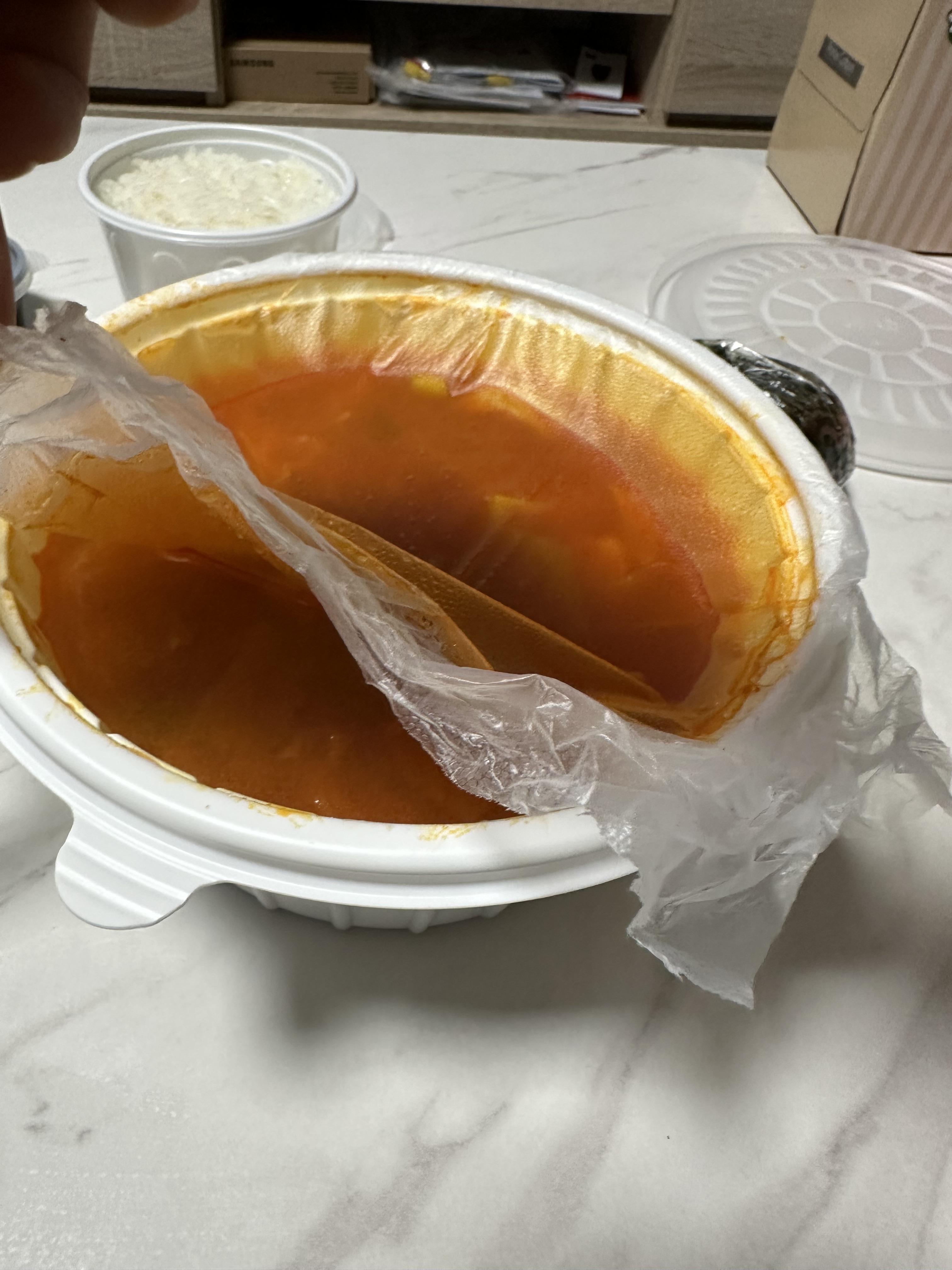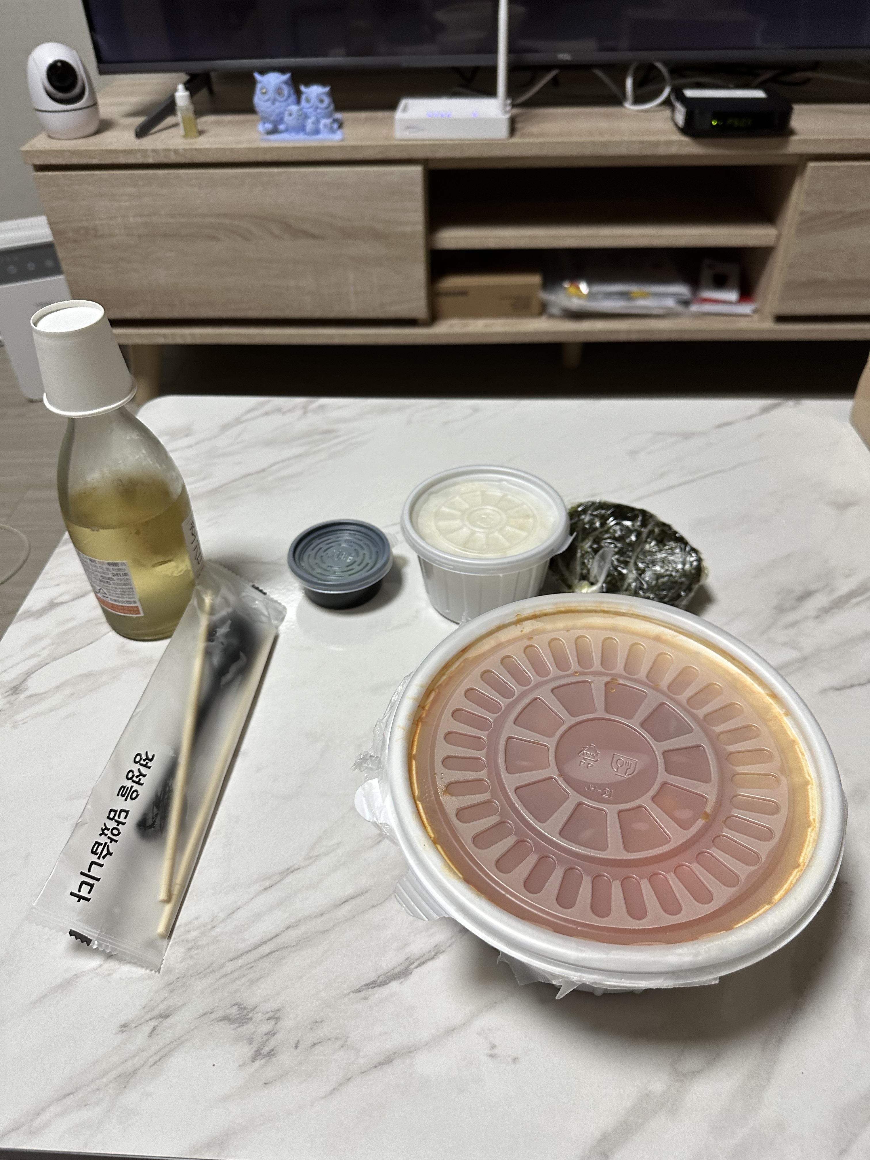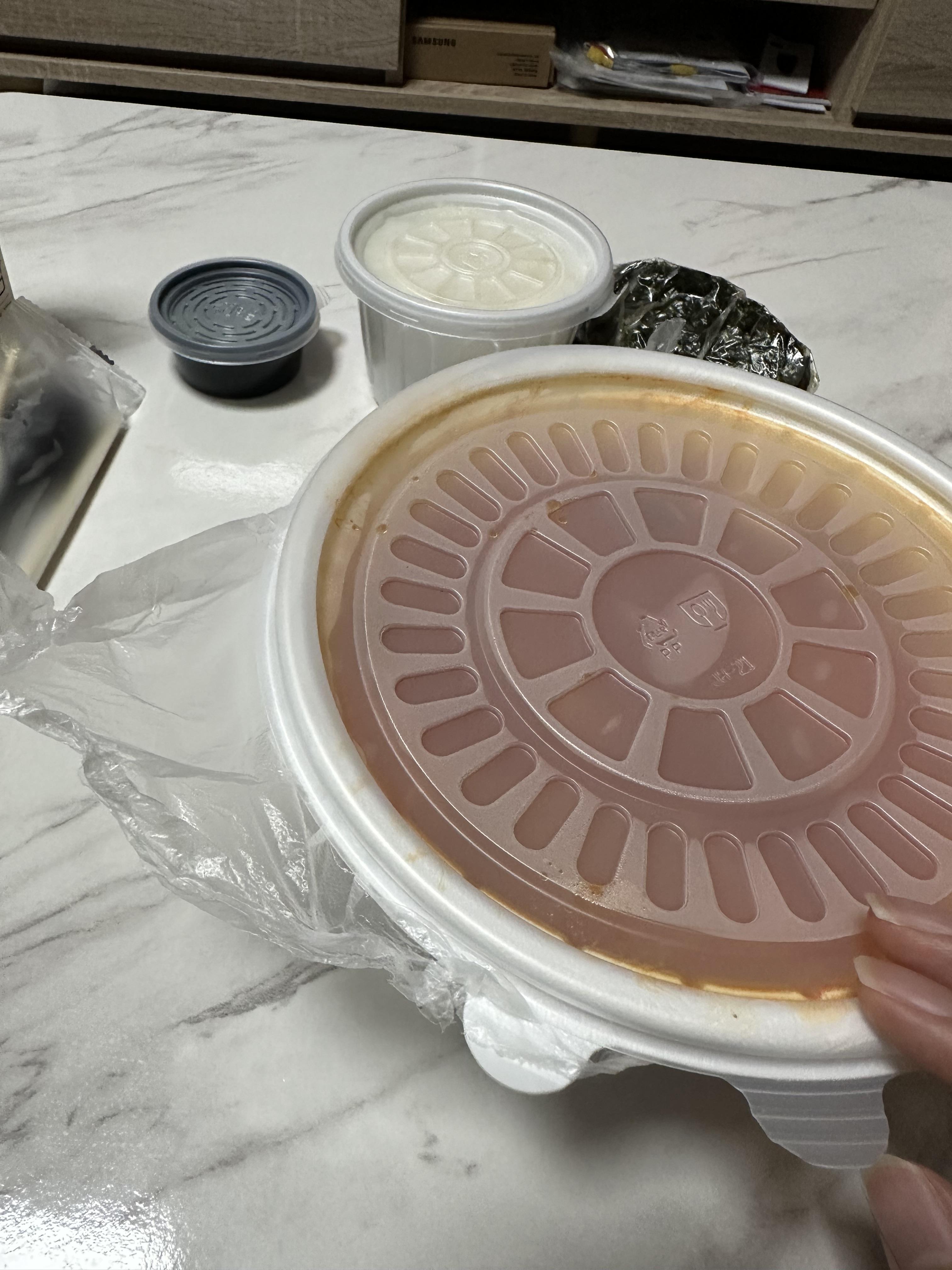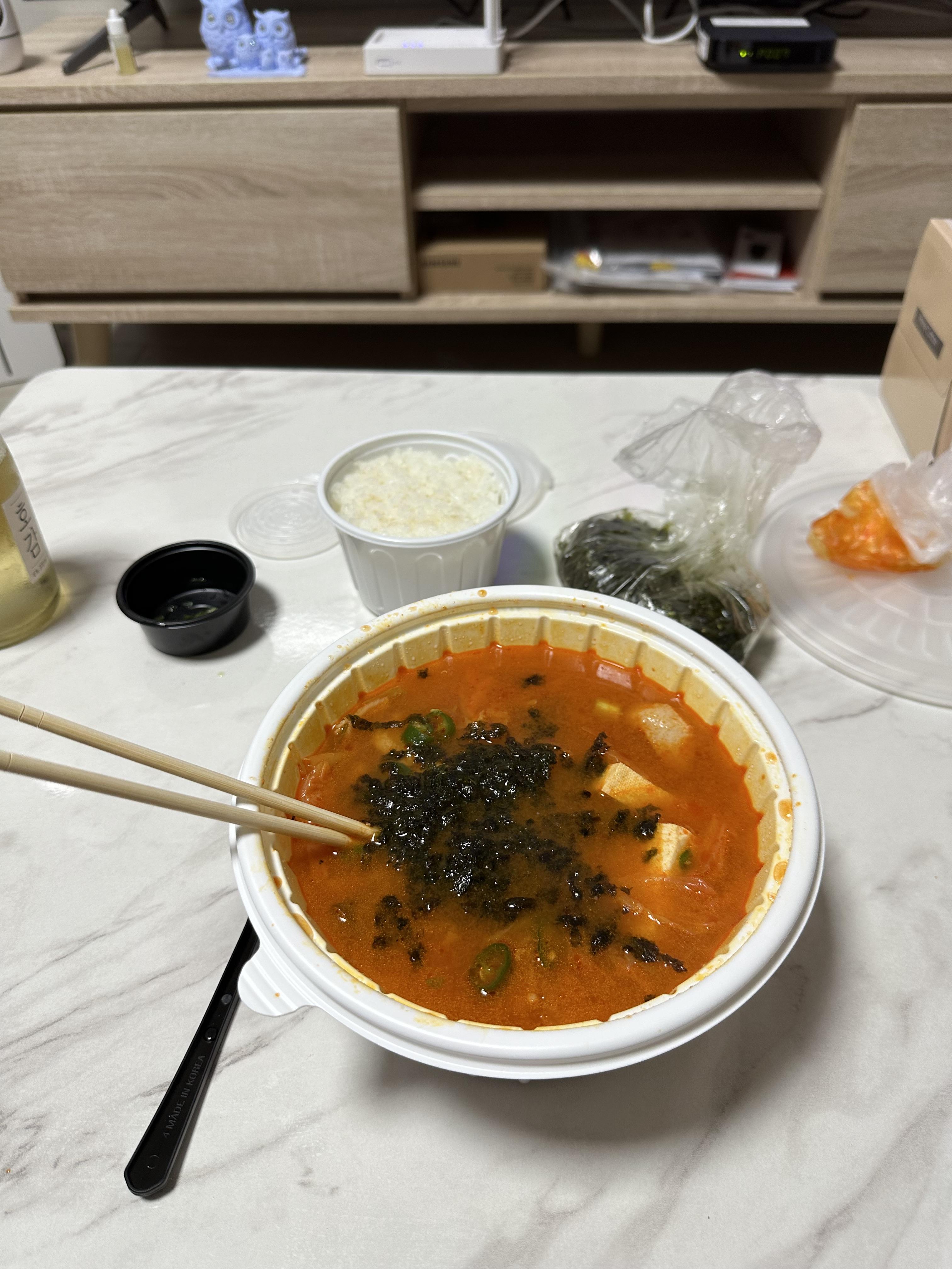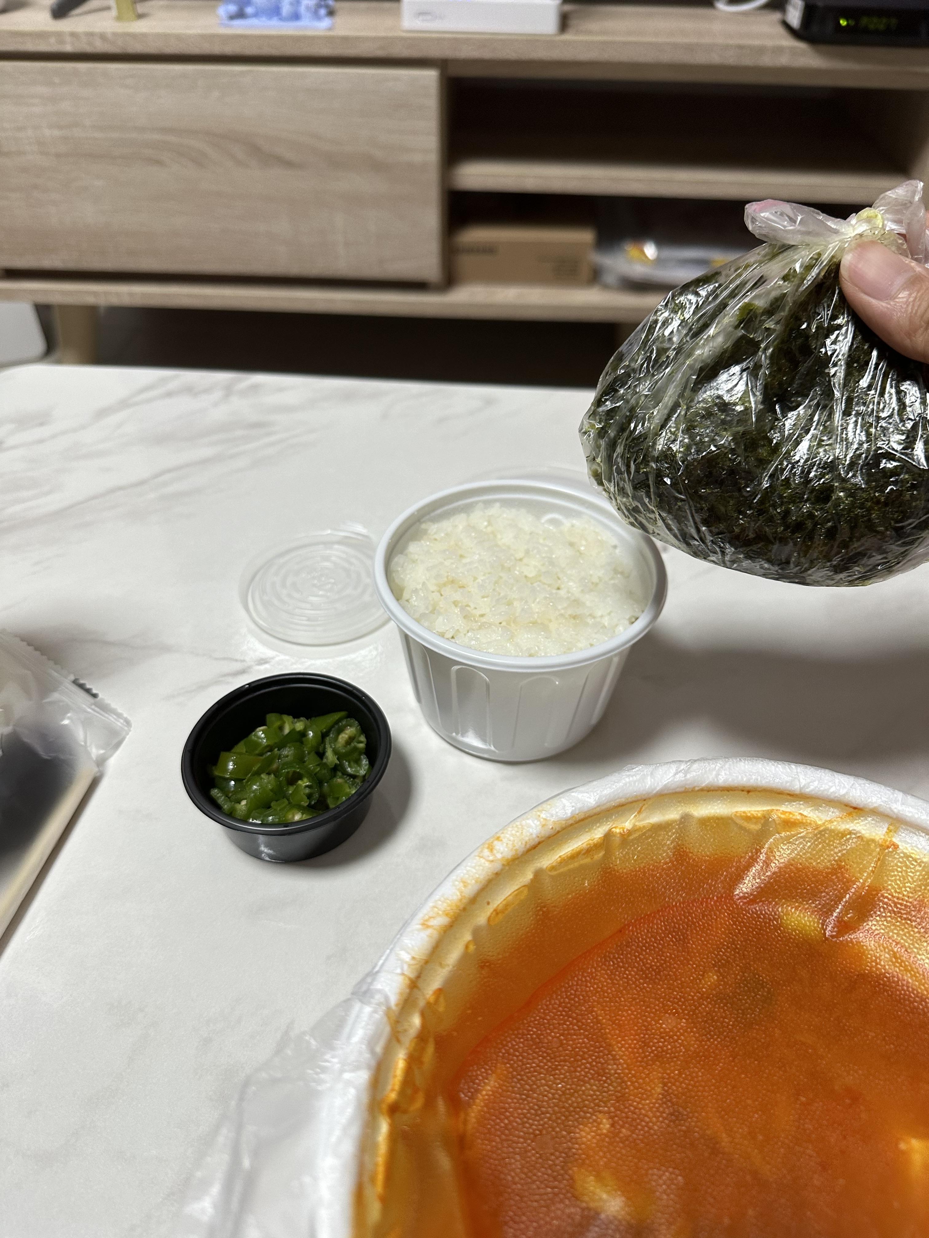오피스텔로 올라와서 포장 해온 김치찌개를 하나씩 꺼내었습니다. 아무래도 빨간색 김치 찌개이다보니 포장은 혹시 모르는 흐르는 사고가 날 수 있어 뚜껑 안쪽에도 비닐로 꼼꼼하게 되어 있었습니다. 옵션으로 주문했던 청량고추는 개별적으로 담아져서 왔습니다. 김가루를 시켰는데 매장이 아니다보니 사실 어떻게 먹는건진 잘몰랐습니다. 국물에 넣어버렸는데 국물은 아닌거같구 아마 밥에다가 비벼서 국물과 함께 먹는 것 같습니다.