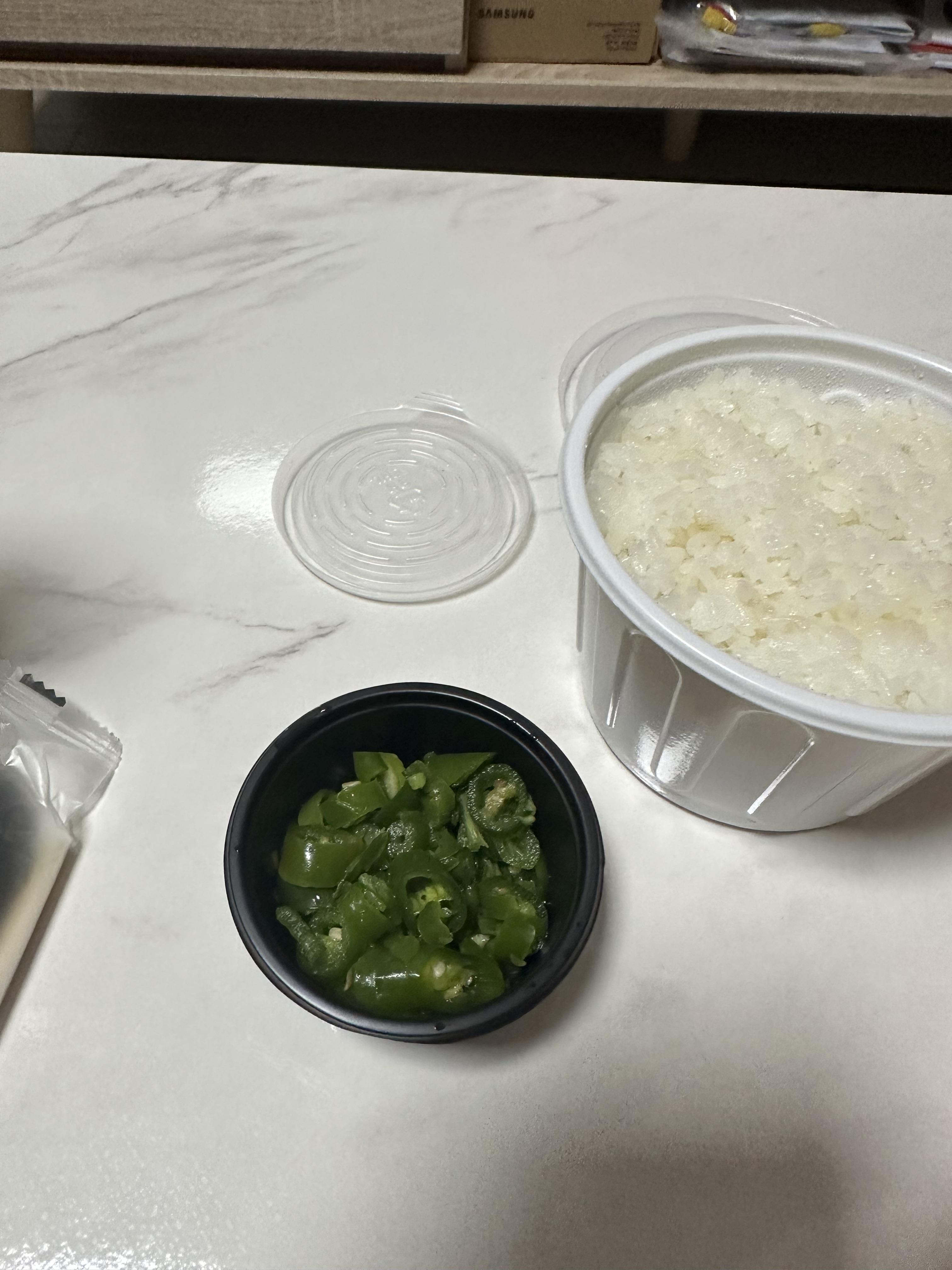 옵션으로 주문했던 청량고추는 많이 들어있었습니다. 매운 것을 좋아하는 저로써는 백채김치찌개에서 옵션으로 500원 추가하고 받은 청량고추는 많이 맵지는 않았습니다. 그래도 안넣는것보다는 얼큰했습니다. 밥이랑 김을 섞어먹는 것 같은데요. 제공된 공기 밥 플라스틱은 좁다보니 밥과 김을 비벼서 먹는 것은 작은 크기였습니다. 집에서 먹는거라면 넓은 밥 그릇에 밥을 덜어서 김과 함께 비벼서 김치찌개 먹으면 정말 맛있습니다.