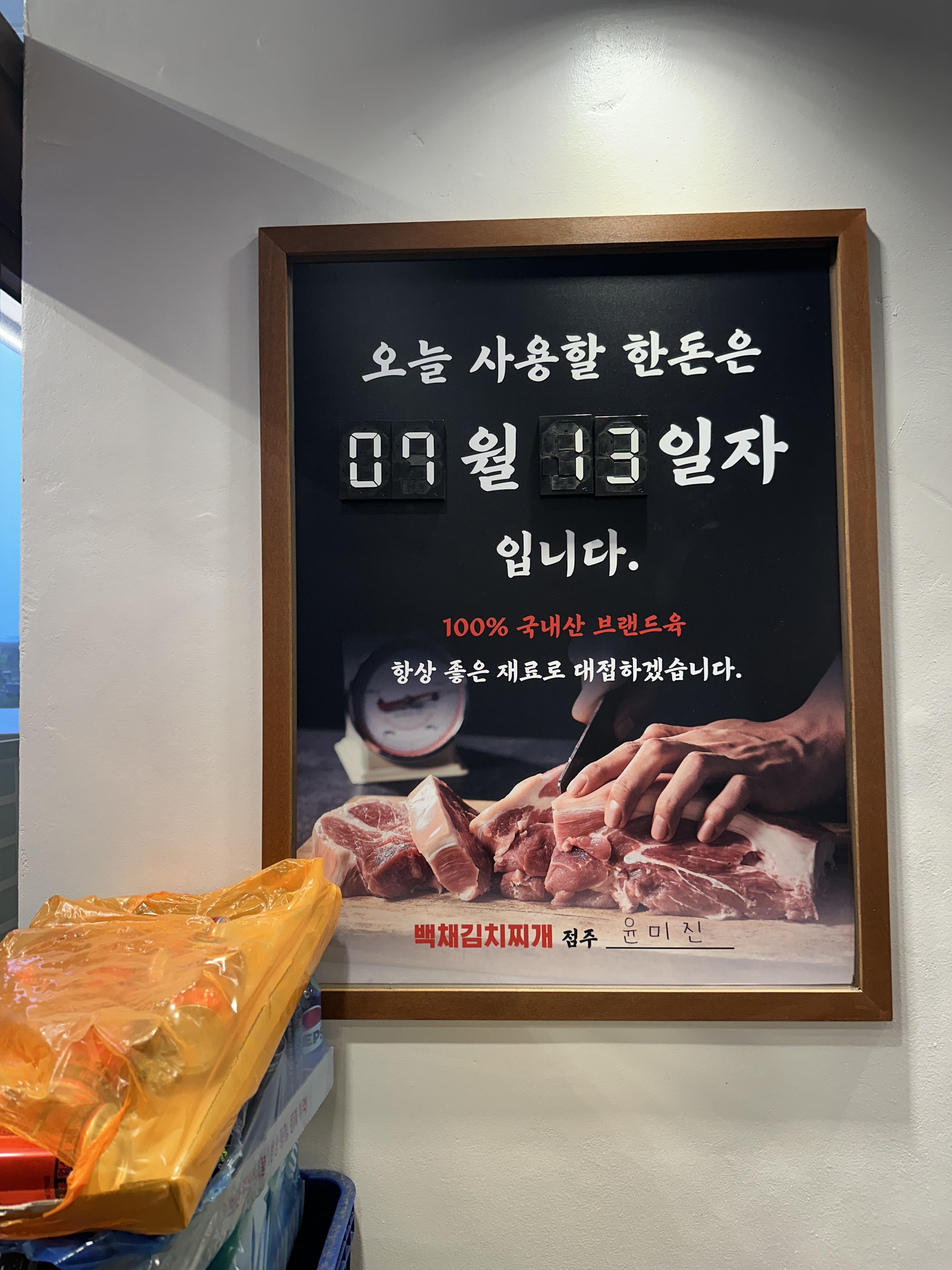 매장앞에서 봤던 슬로건 고기를 아끼면 우리는 망한다 라는게 집안의 가훈처럼 매장 주방 앞에 붙어있었습니다. 그만큼 아낌없이 준다는 것이 진심처럼 느껴지는 것 같습니다. 또한 저급한 식재료는 안쓴다는 것처럼 당시 방문일은 7월 13일인데 오늘 사용할 한돈은 7월 13일이라는 것을 표기한 것이 인상 깊었습니다.