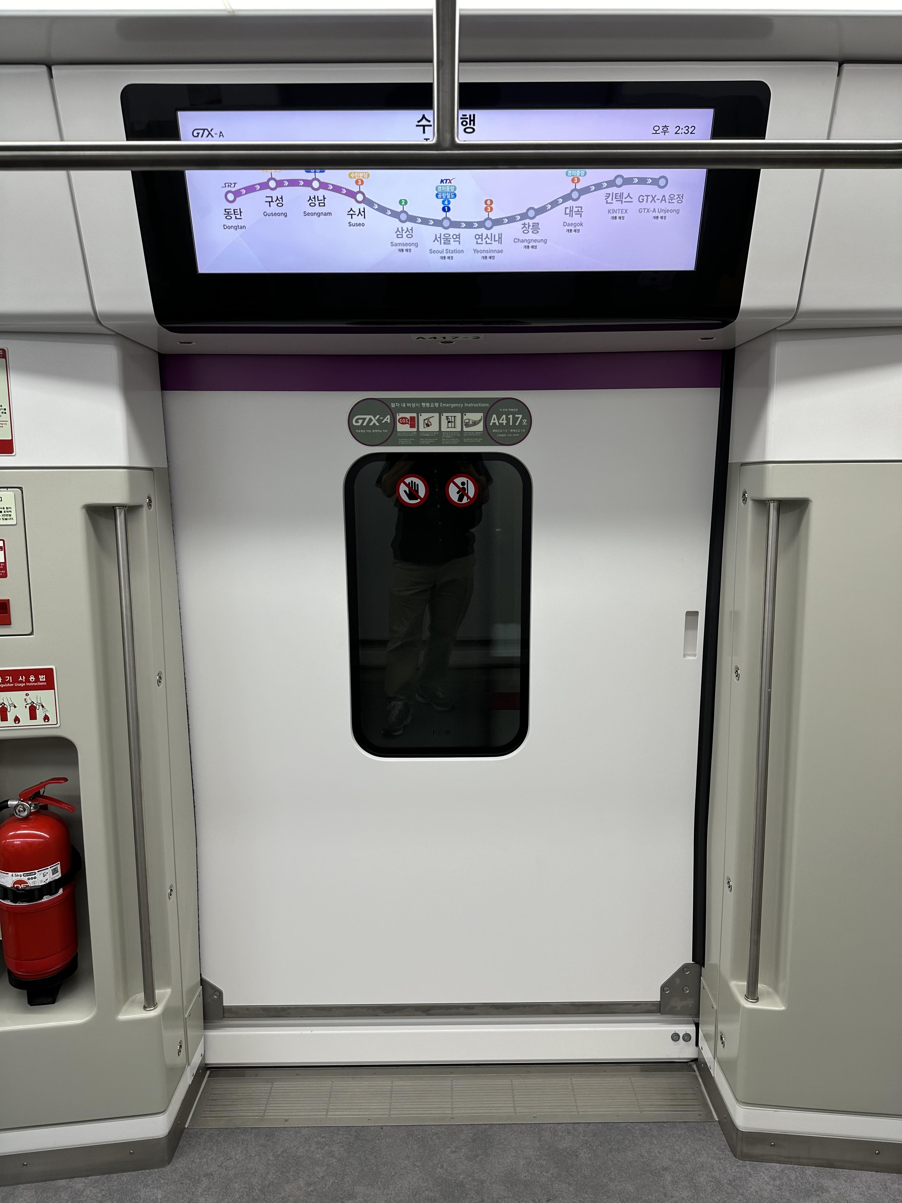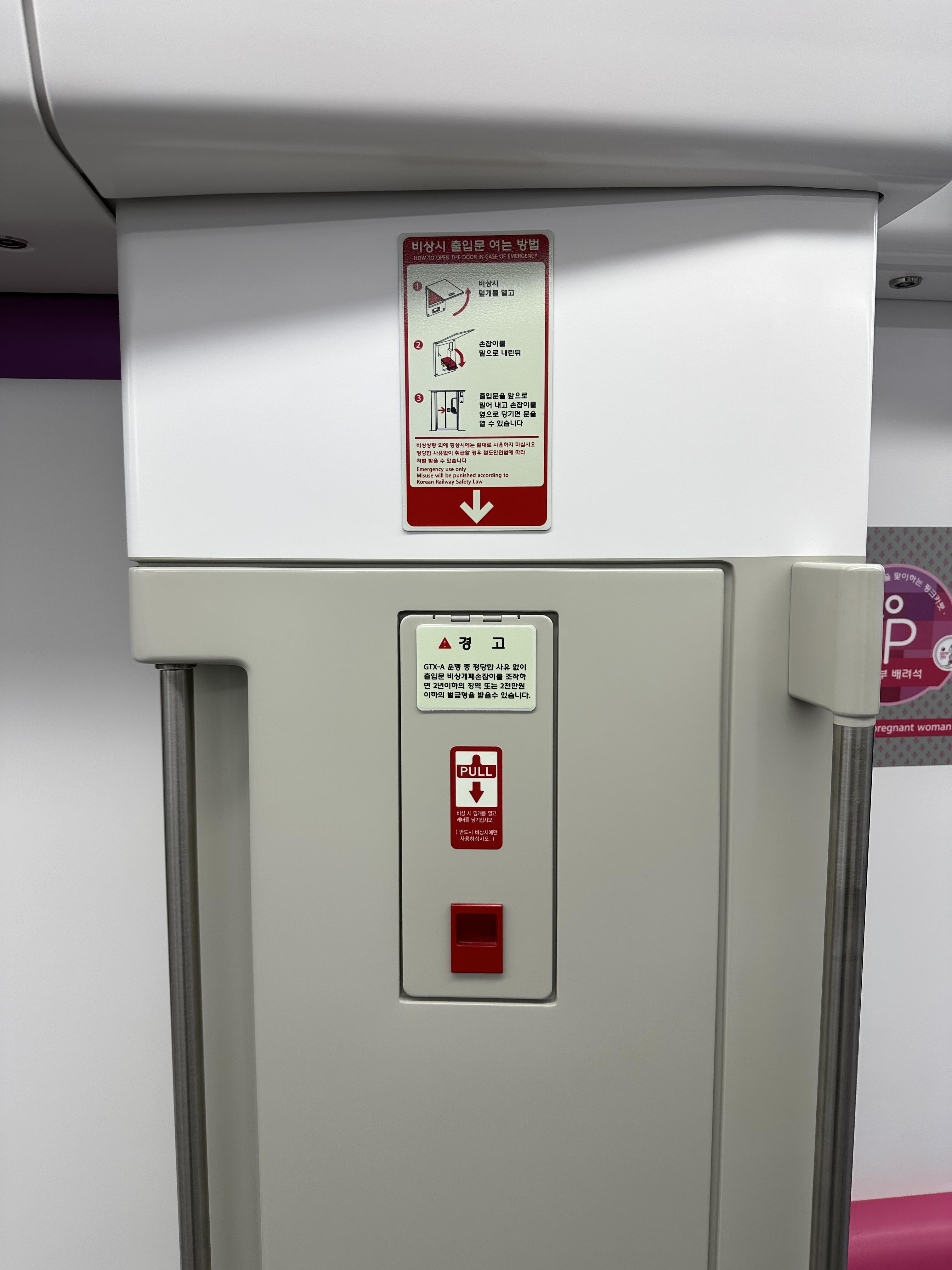 지하철을 타면 크게 관심 가지지 않을 수 있지만 가장 중요한 것은 안전입니다. 화재가 나거나 긴급 시에는 대피를 해야하는데요. GTX-A의 경우 열차칸마다 소화기가 설치되어있고 비상시 문을 열 수 있도록 스위치가 있었습니다. 비상 스위치는 반드시 대피시에만 열여야 하며 평사시에 작동할 경우에는 철도 보안법에 의해 처벌 받을 수 있습니다.