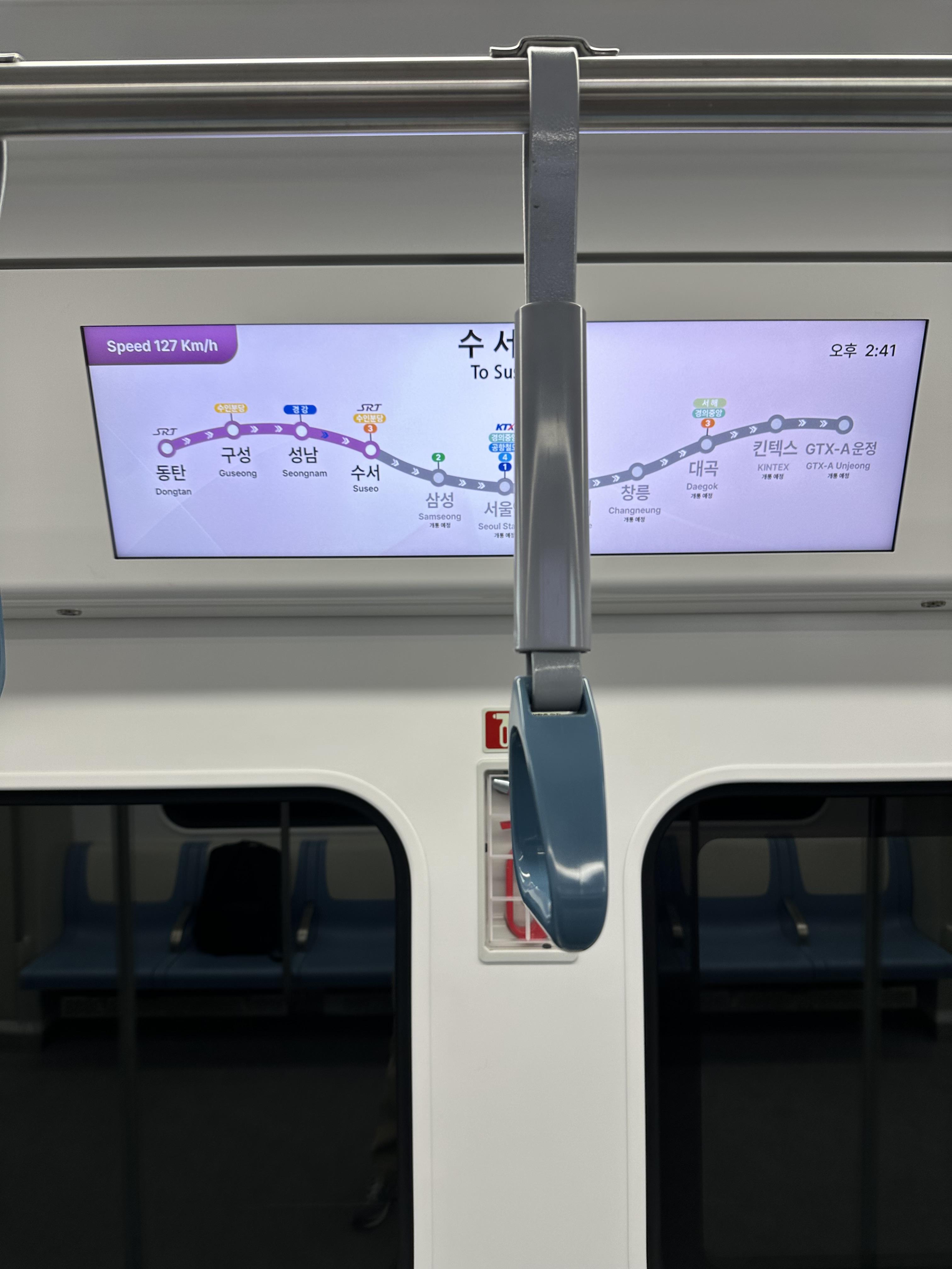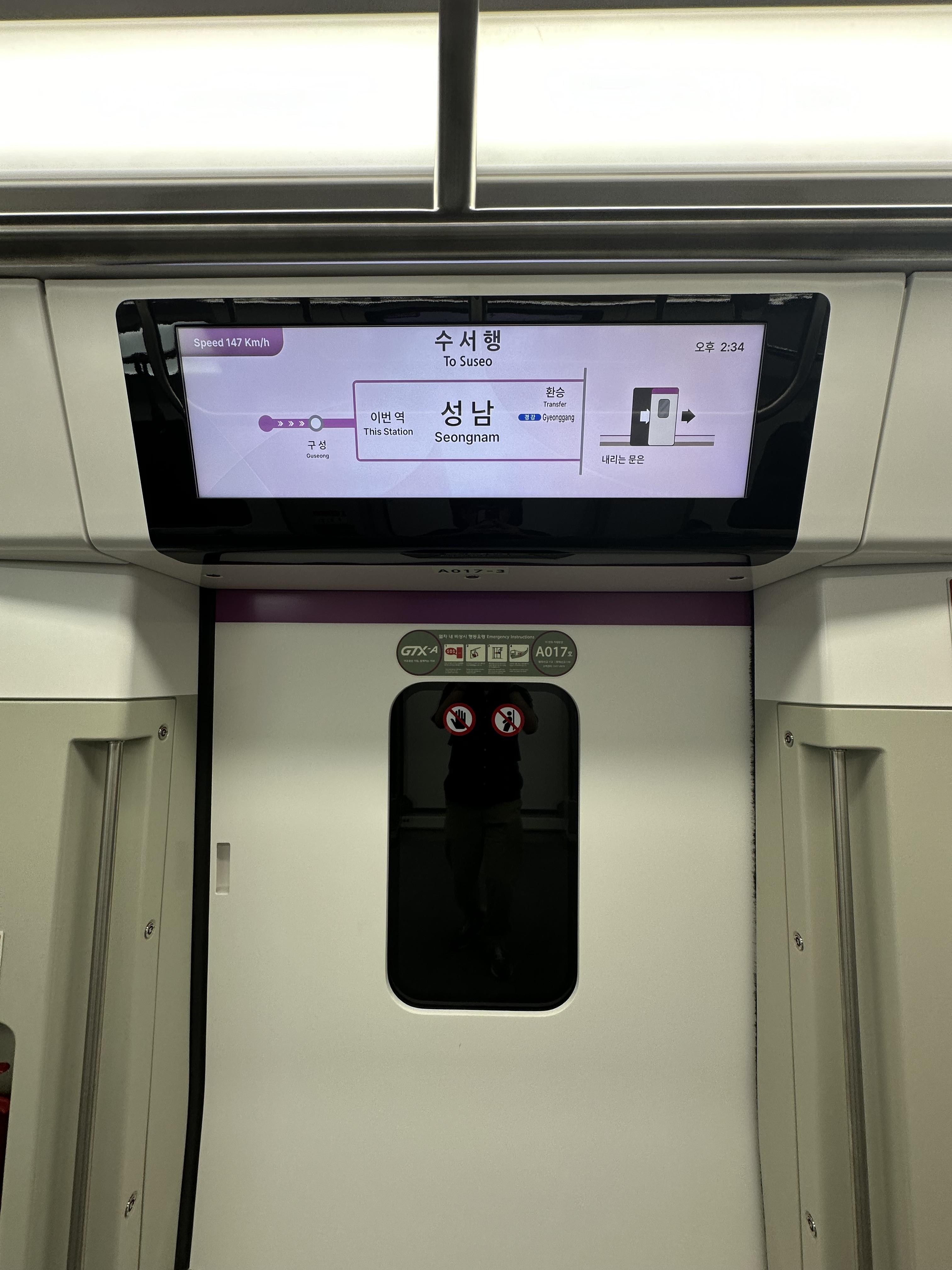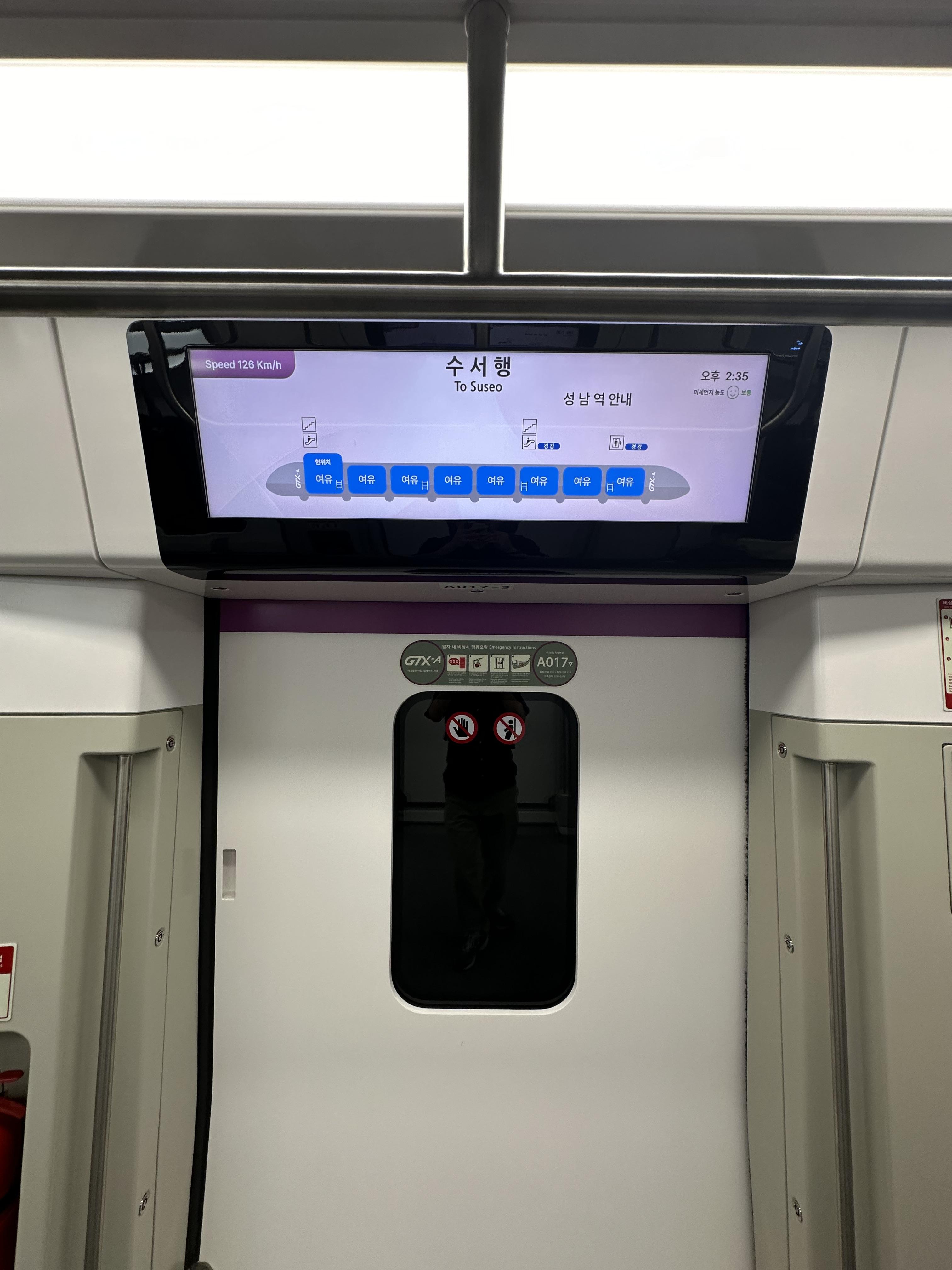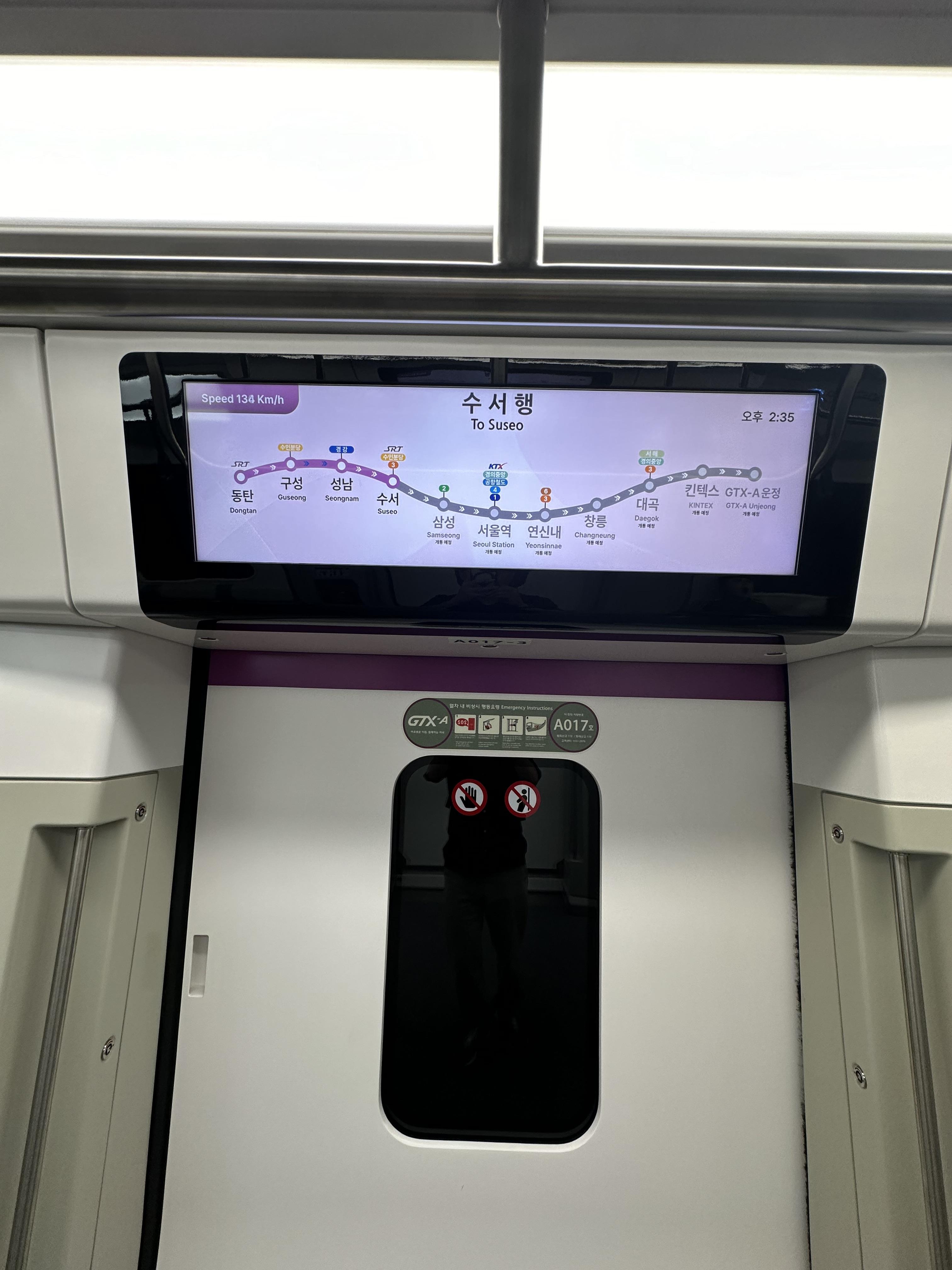 - GTX-A의 노선도는 LED로 보여주고 있으며 운행 중 간간히 현재 몇 km로 달리는지도 보여지고 있었습니다.