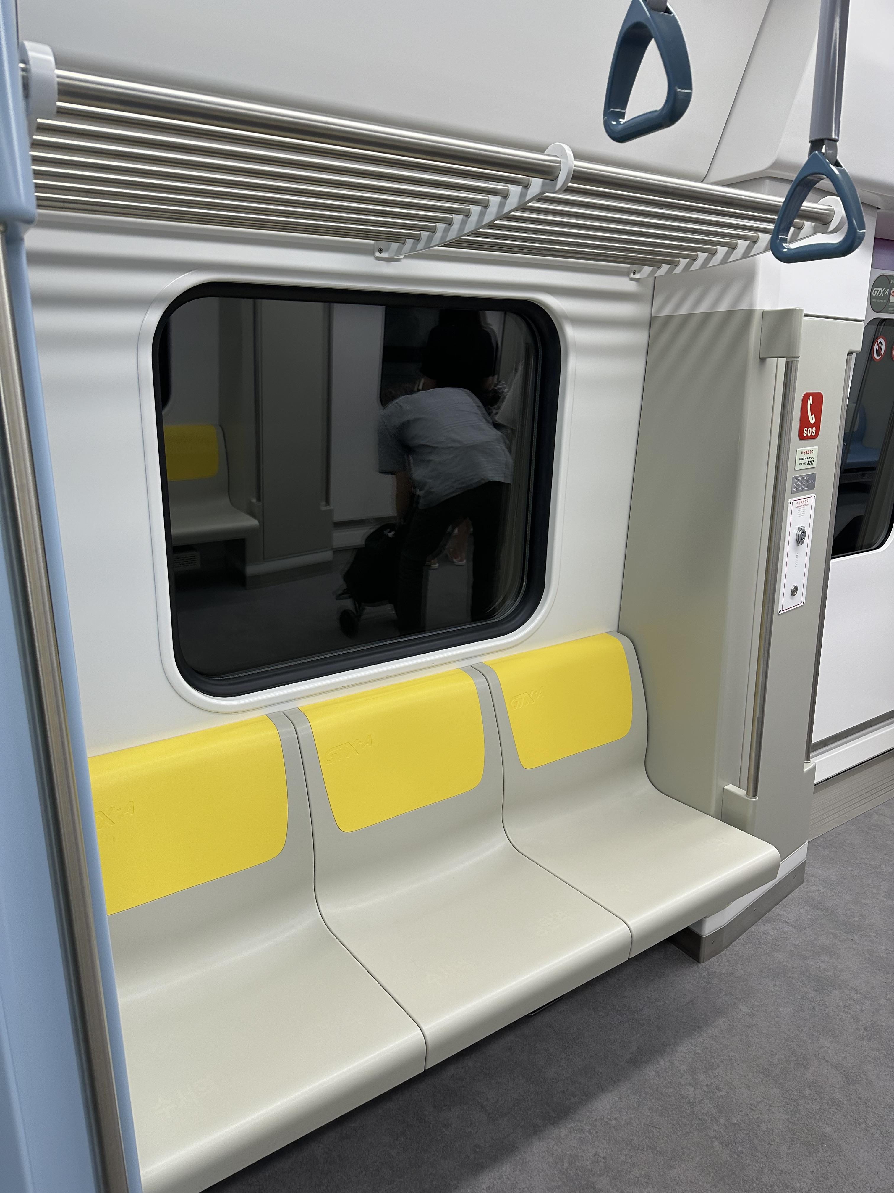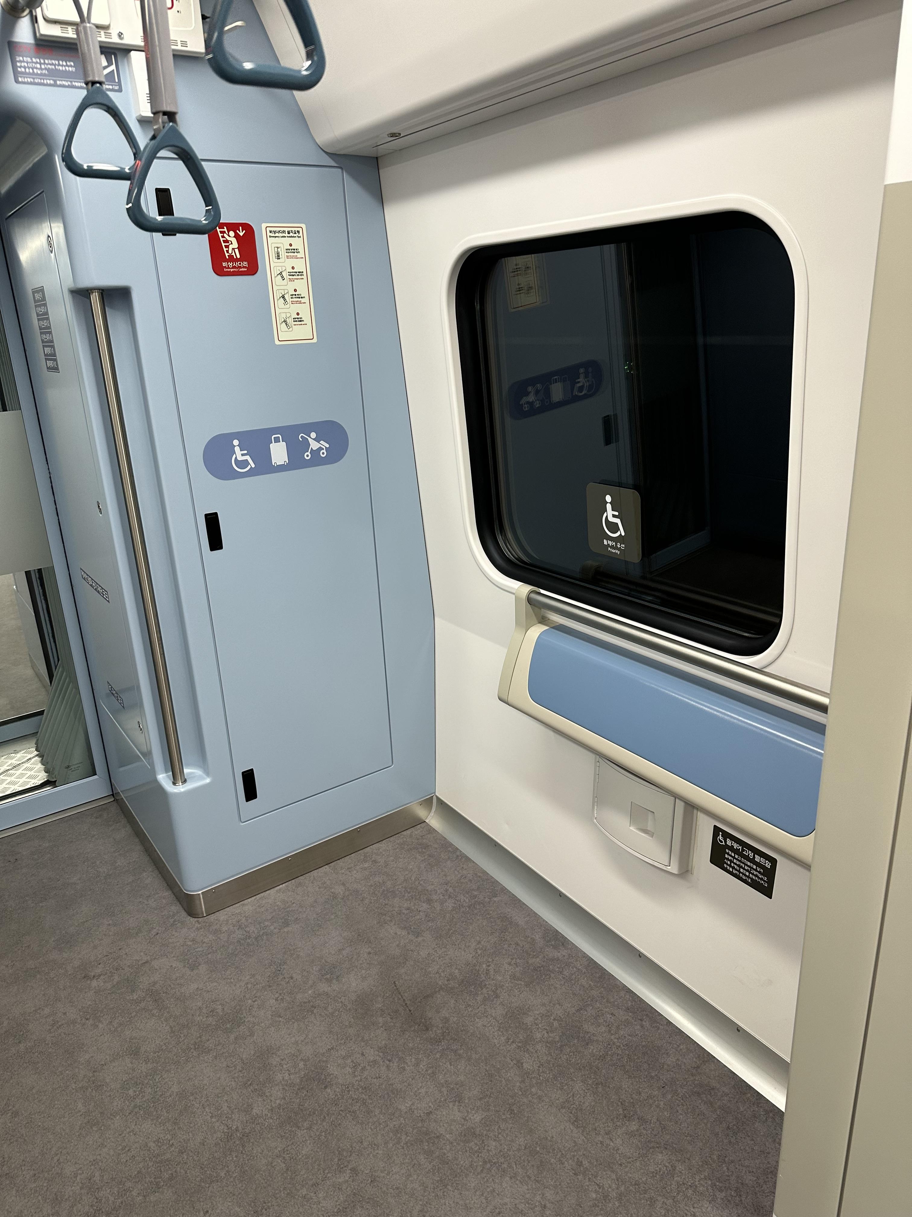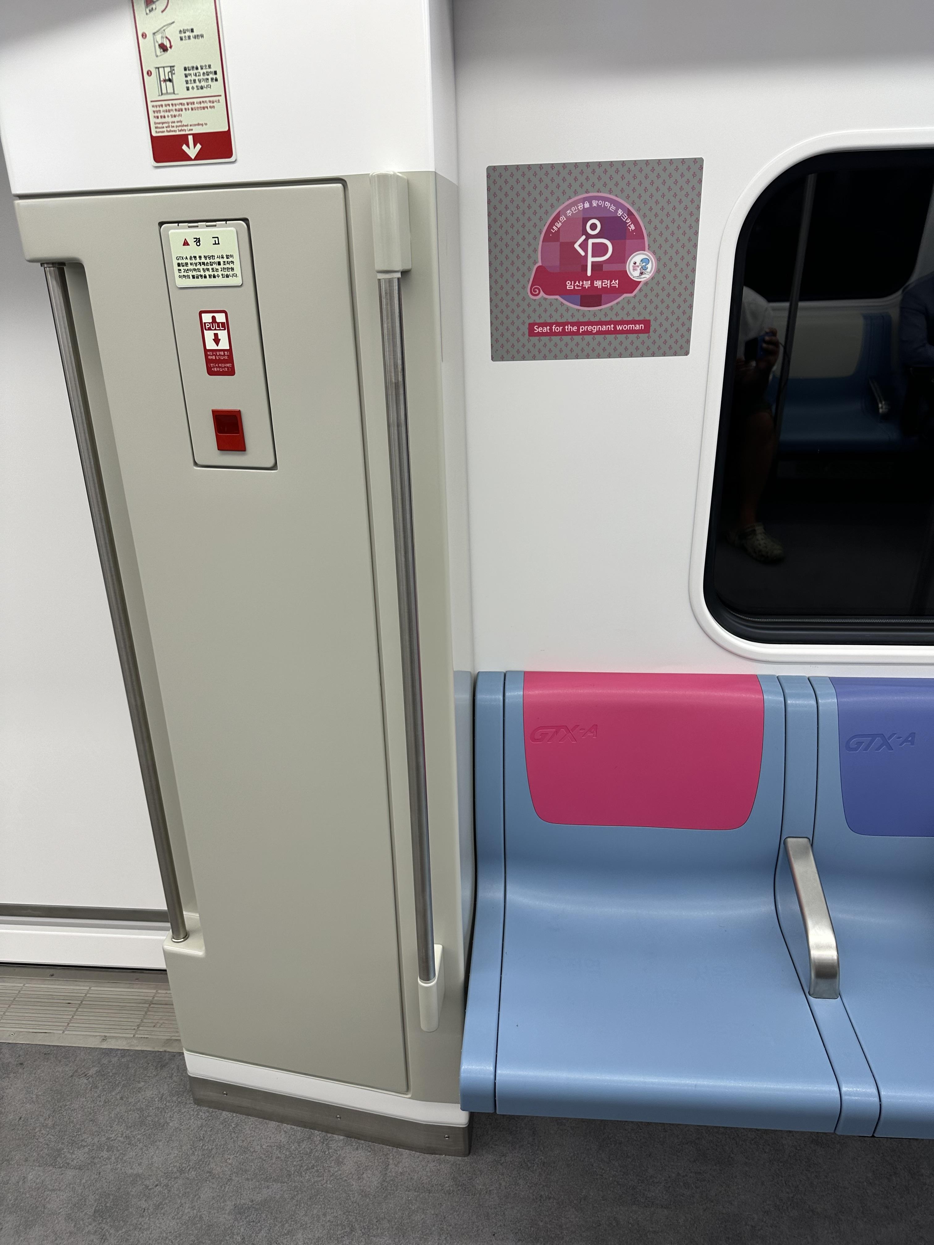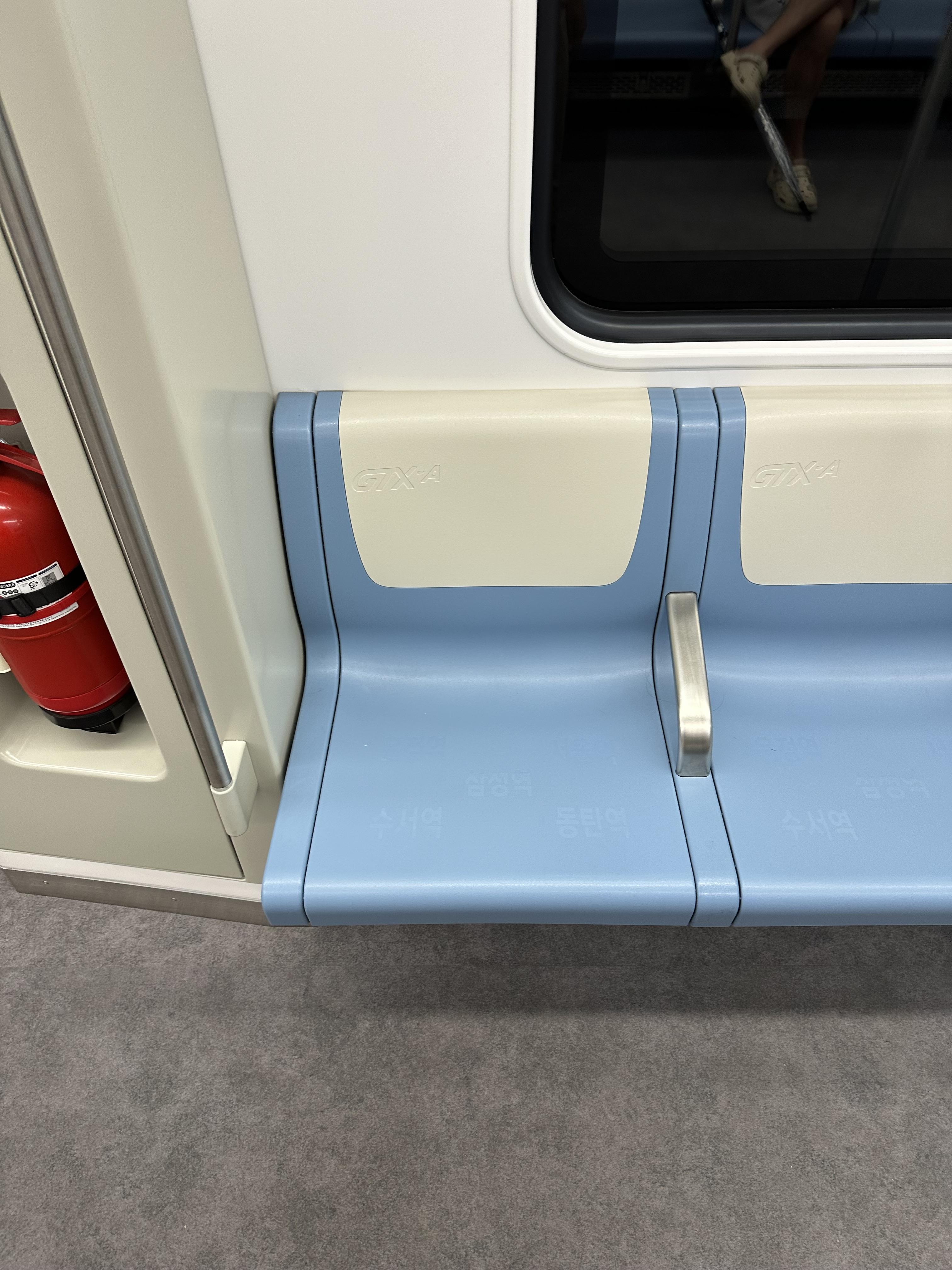 수도권 광역급행 철도 GTX-A의 좌석입니다.수도권 전철과 큰 차이는 없었습니다. 장애인석과 노약자석도 있었고 일반 좌석 사이에 임산부를 위한 자석도 수도권전철과 큰 차이는 없었습니다.