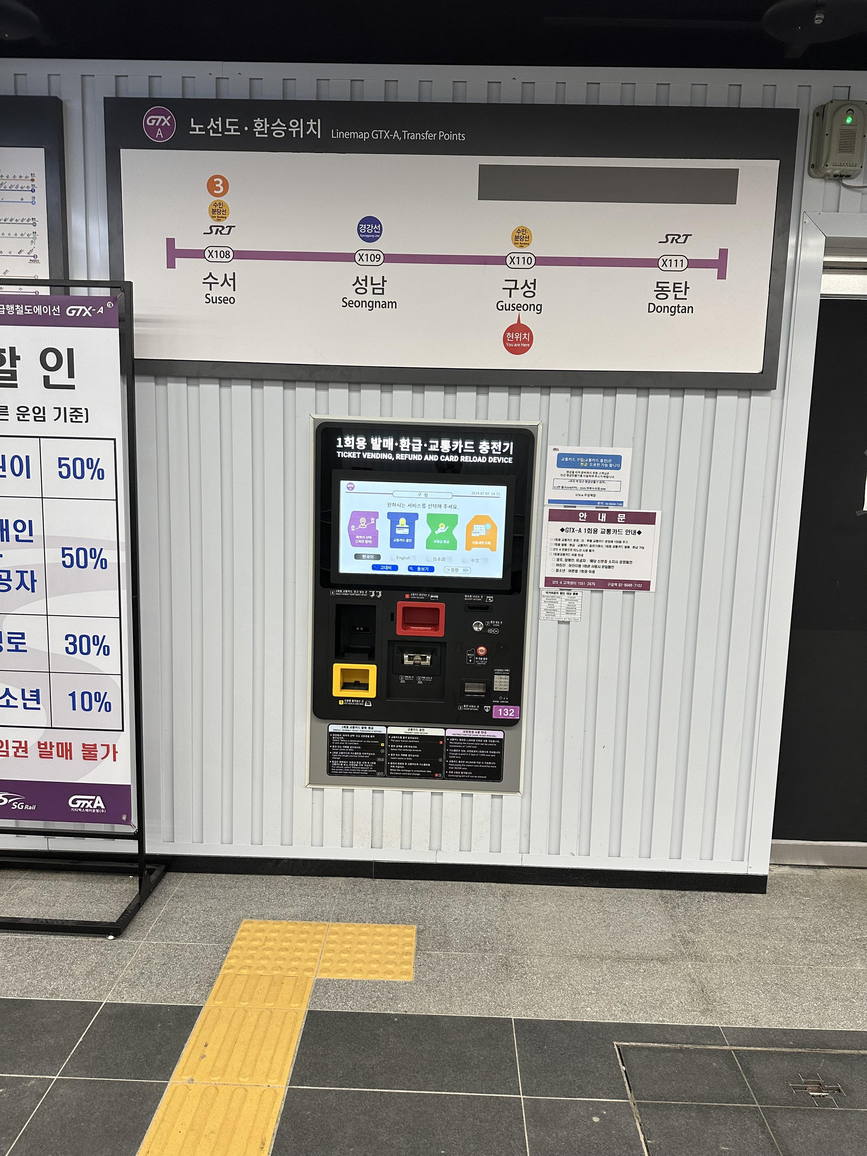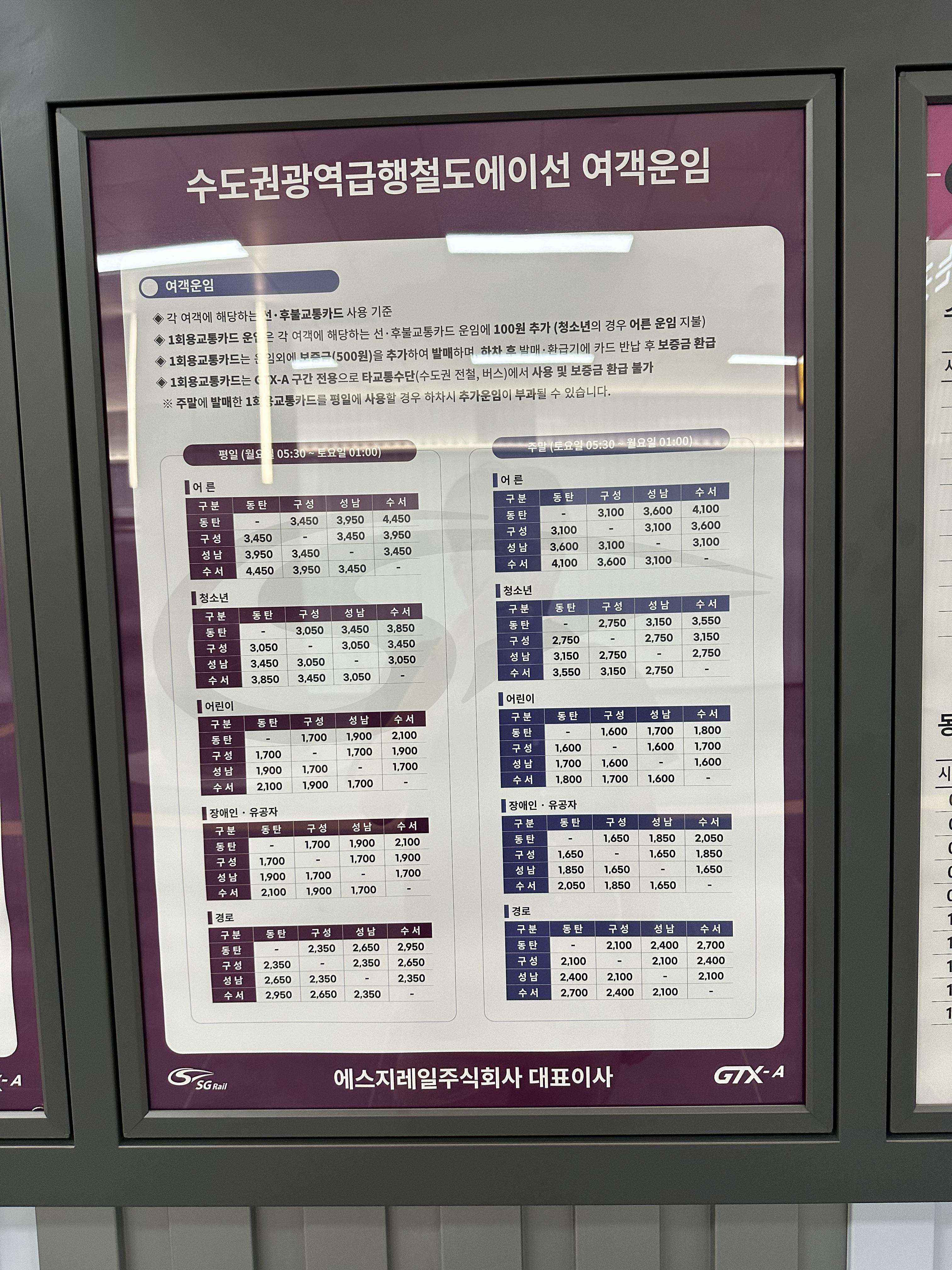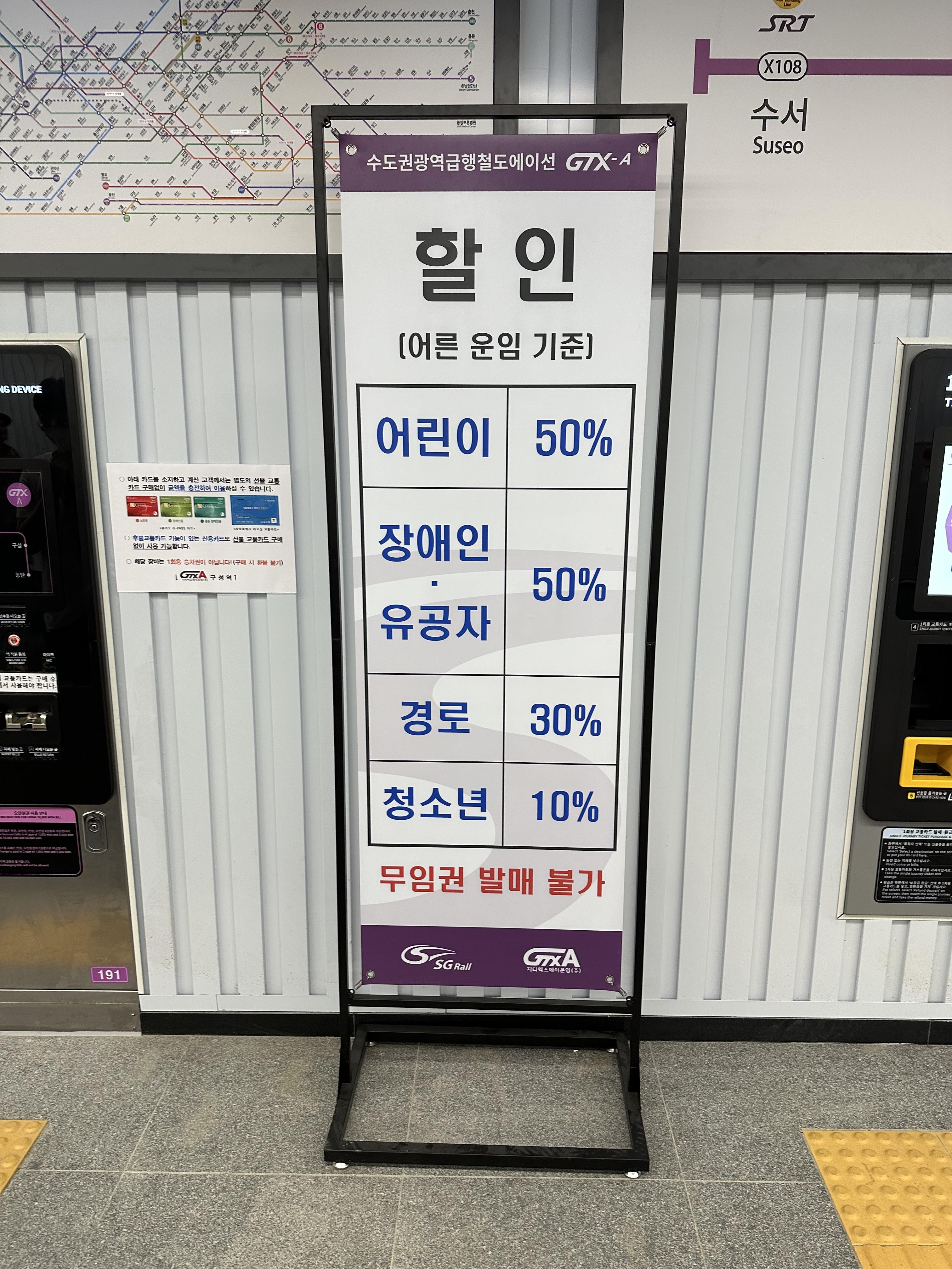 GTX-A는 사회적 약자와 어린이에게 할인 요금을 제공하고 있습니다. 그리고 선불교통카드 판매 등 진행하고 있었습니다. 아직은 GTX-A의 구간이 수서와 동탄까지 중간역으로는 성남과 구성역이 있지만 향후 운정과 서울역까지 개통 후 2028년에는 서울에서 삼성역 공사가 마무리되고 전구간이 개통될 예정이라고 해요
