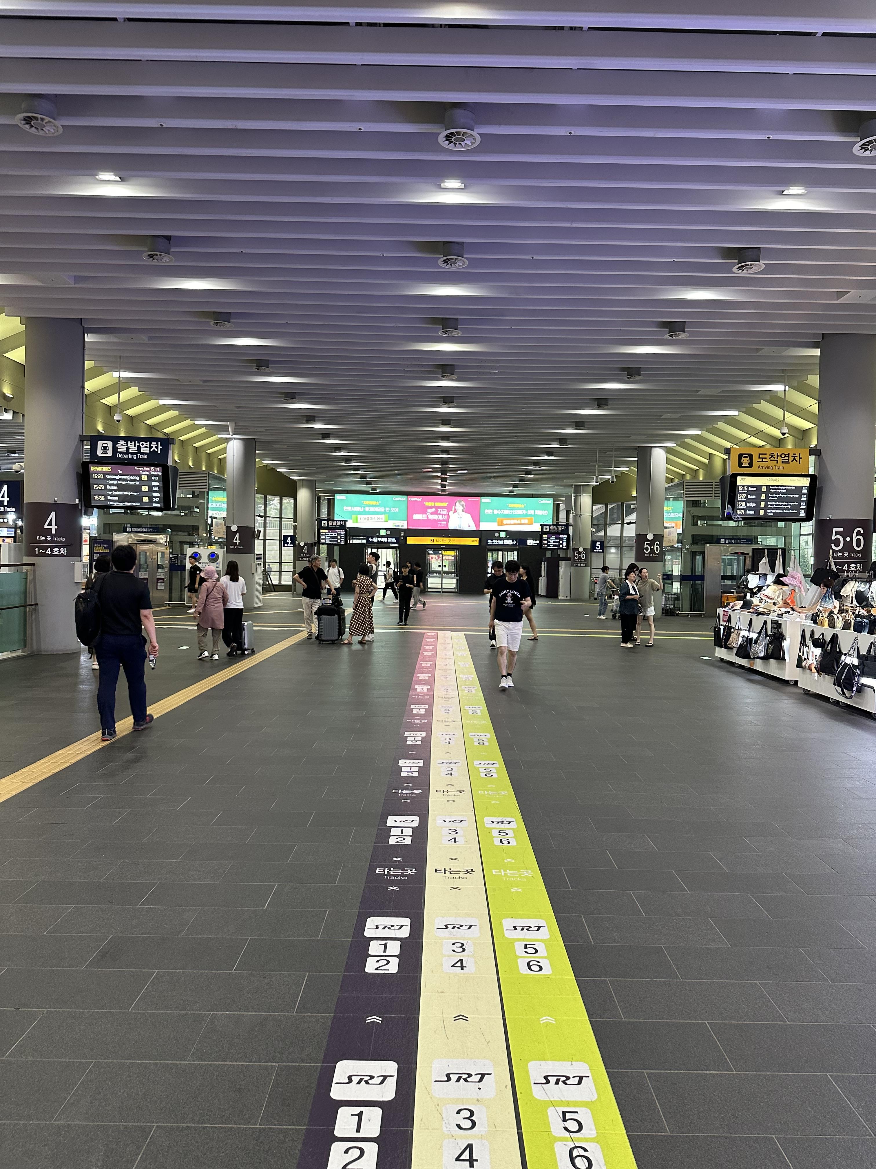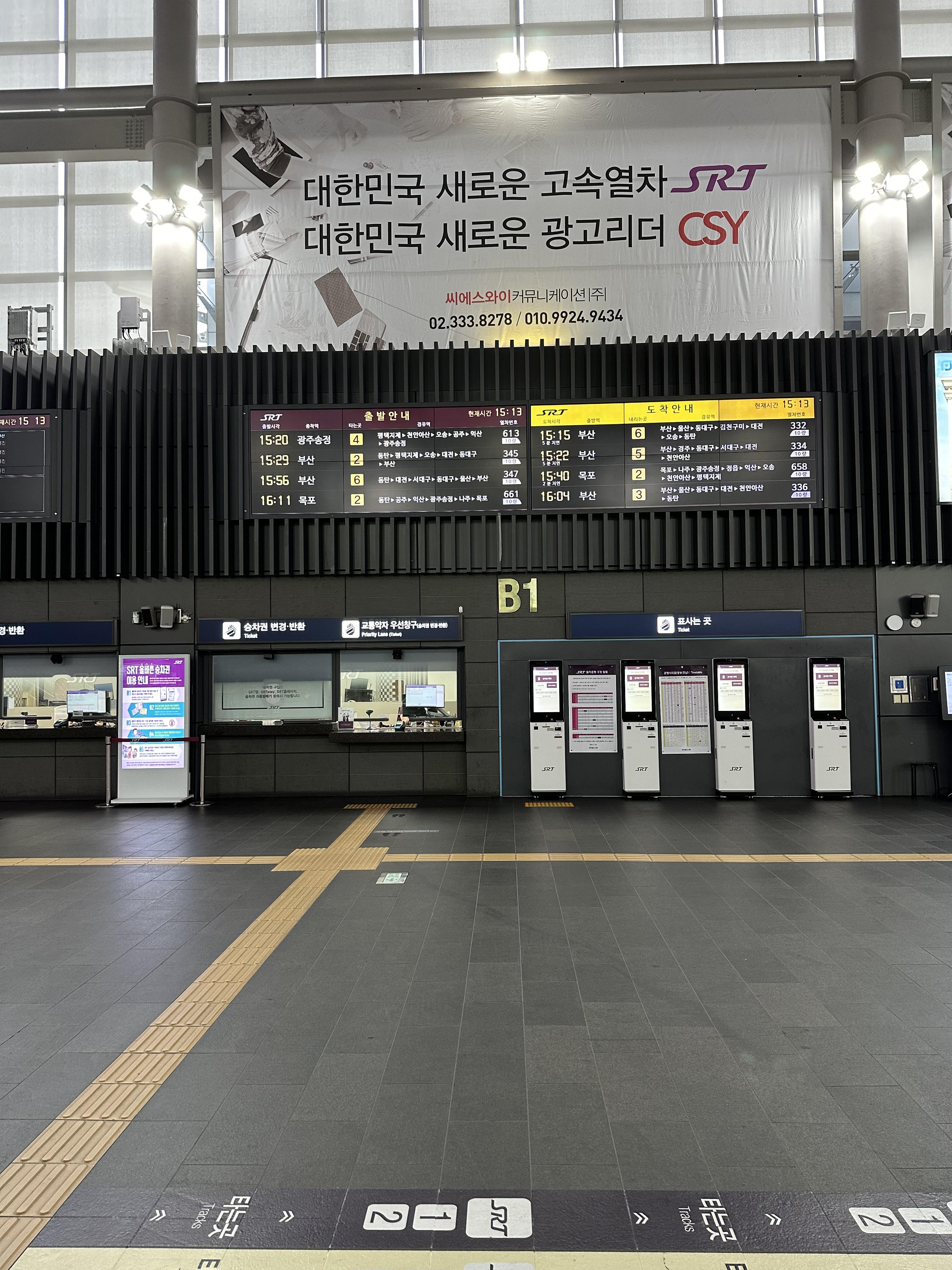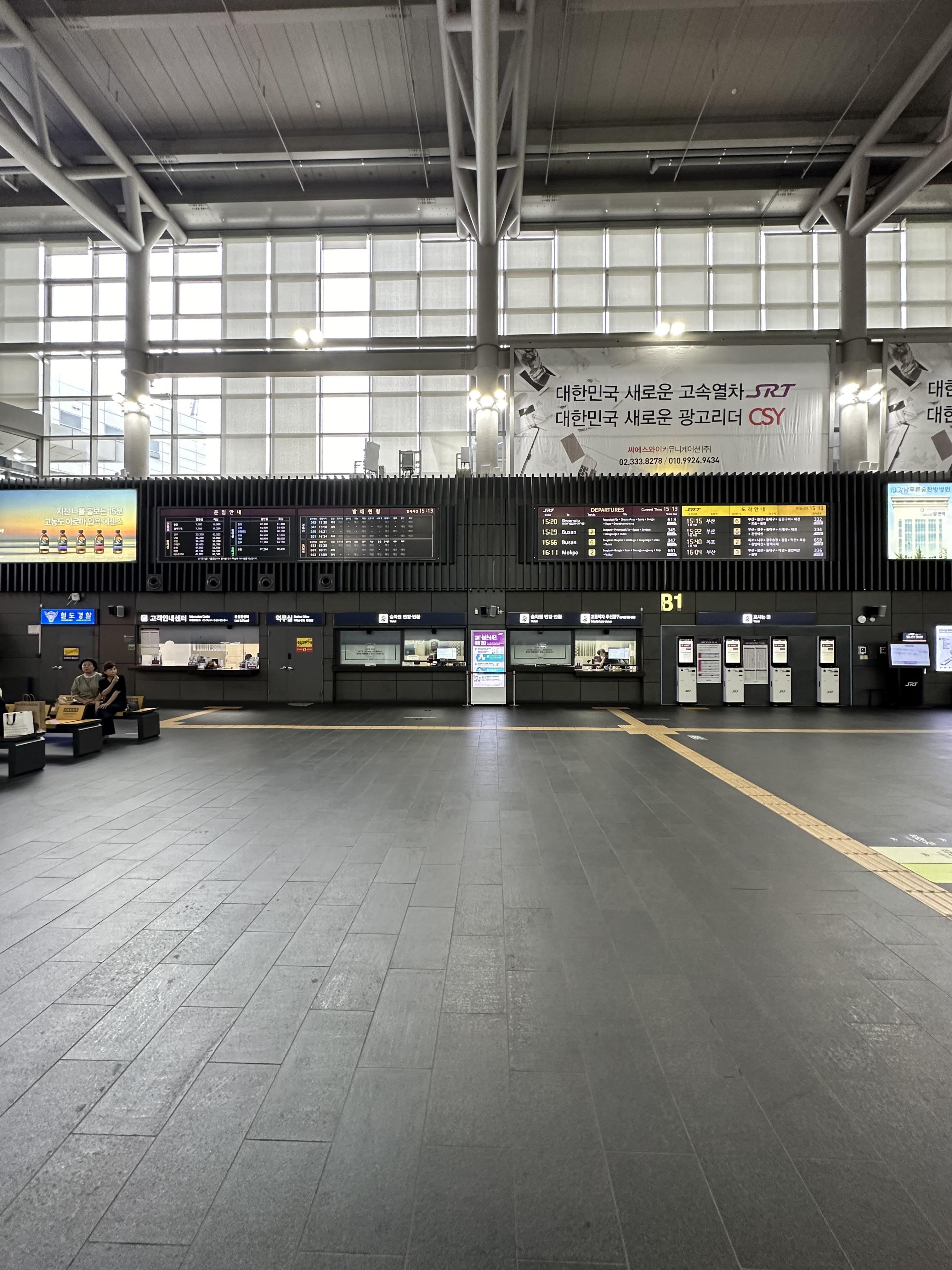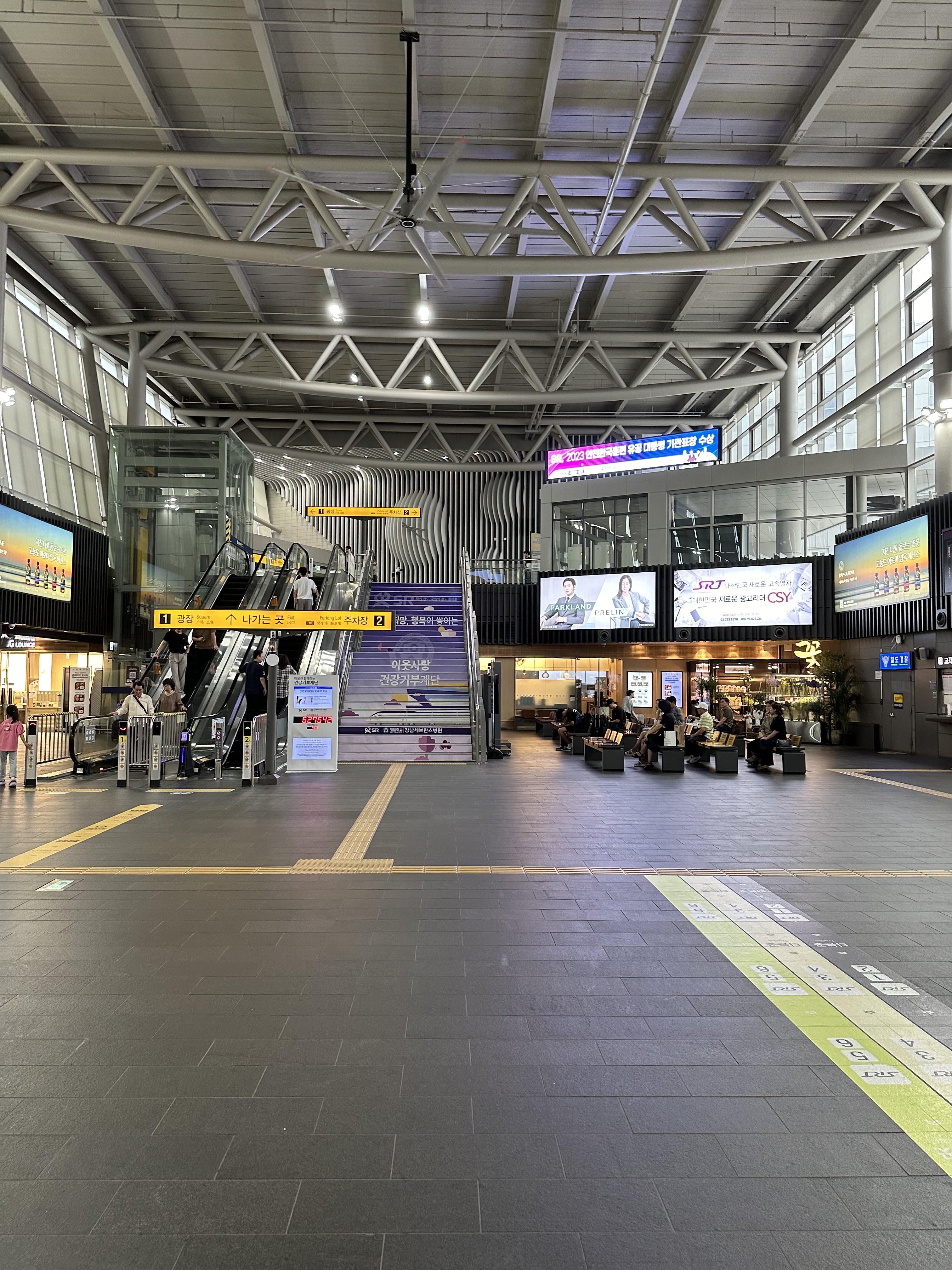 수서역 건물에서 들어오면 낮은 에스컬레이터를 타고 매표소가 보이는 대합실로 내려오게 됩니다. 서울역과 용산역에 비하면 키오스크나 직원이 많지는 않아보입니다. 또한 서울역과 용산역에 비하면 경부선, 전라선 호남선을 이용할 수는 있지만 열차는많이 없습니다. SRT 승강장이 많지 않은점도 한몫 하는것도 있습니다.