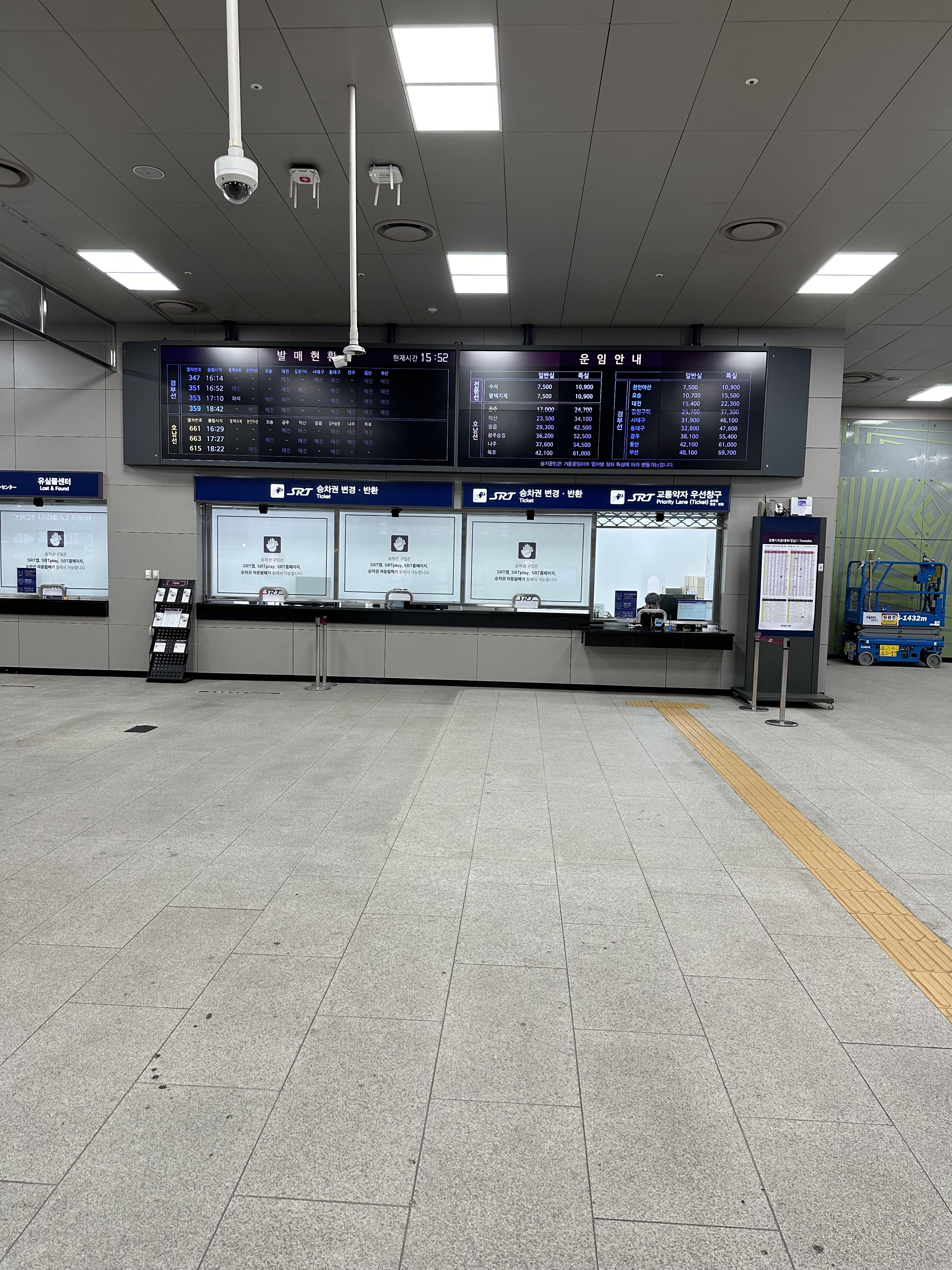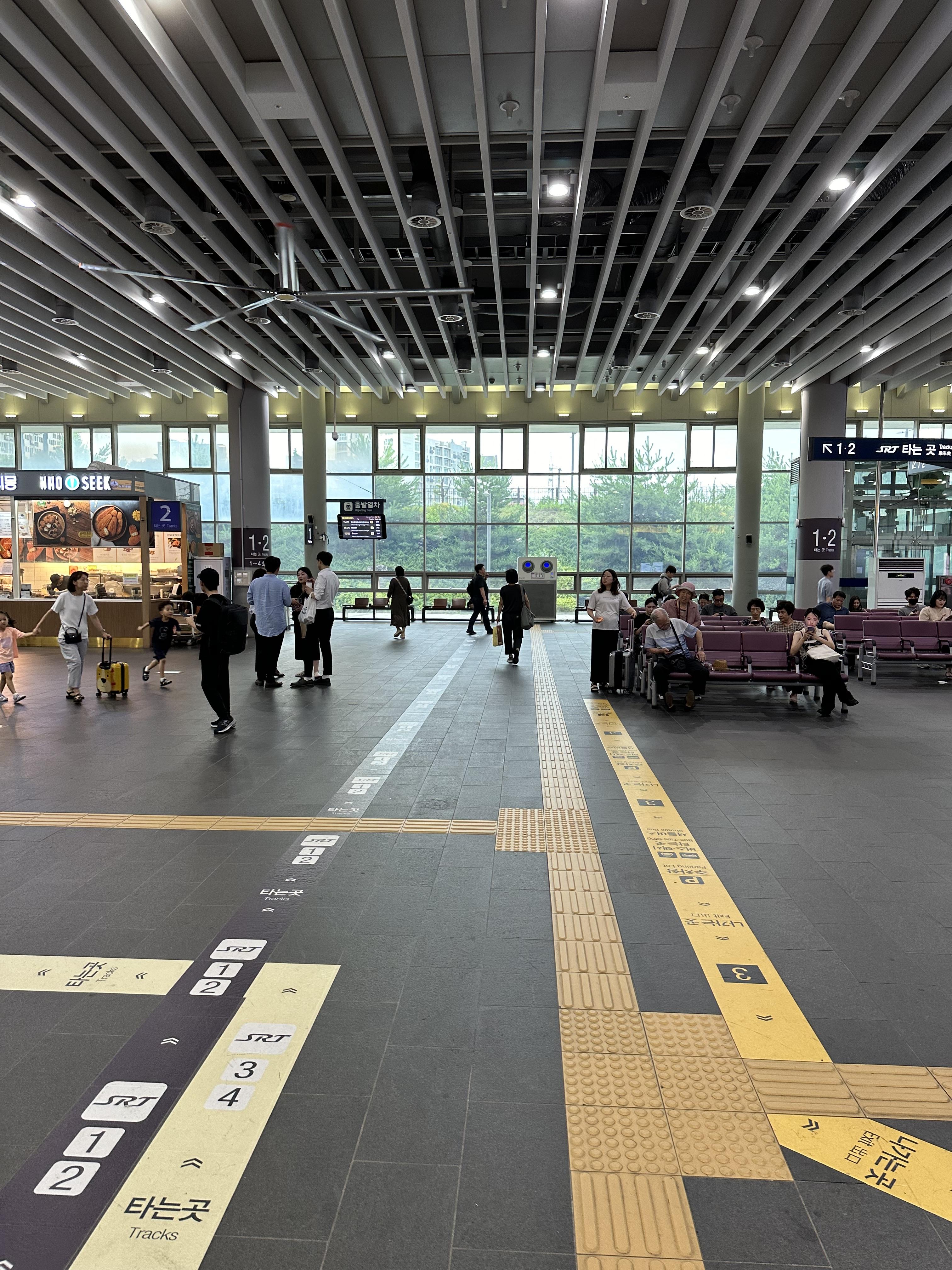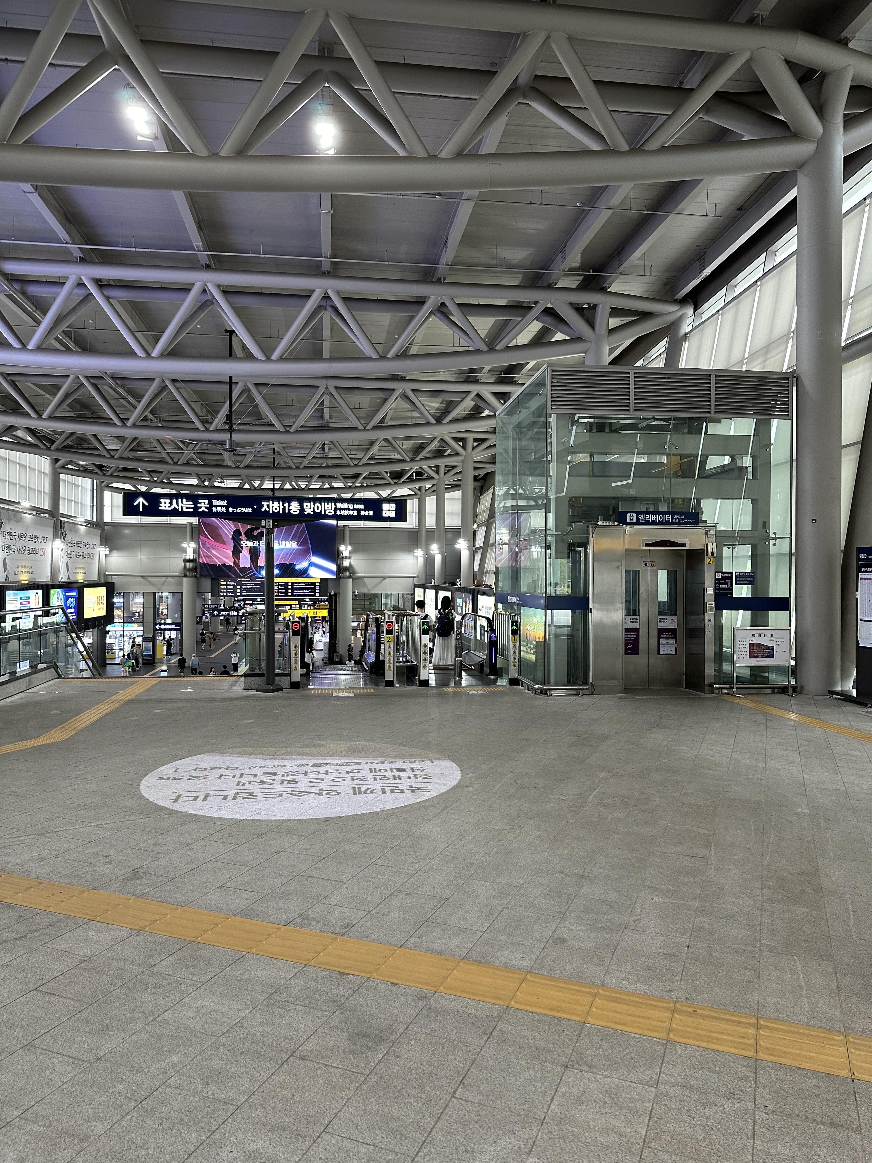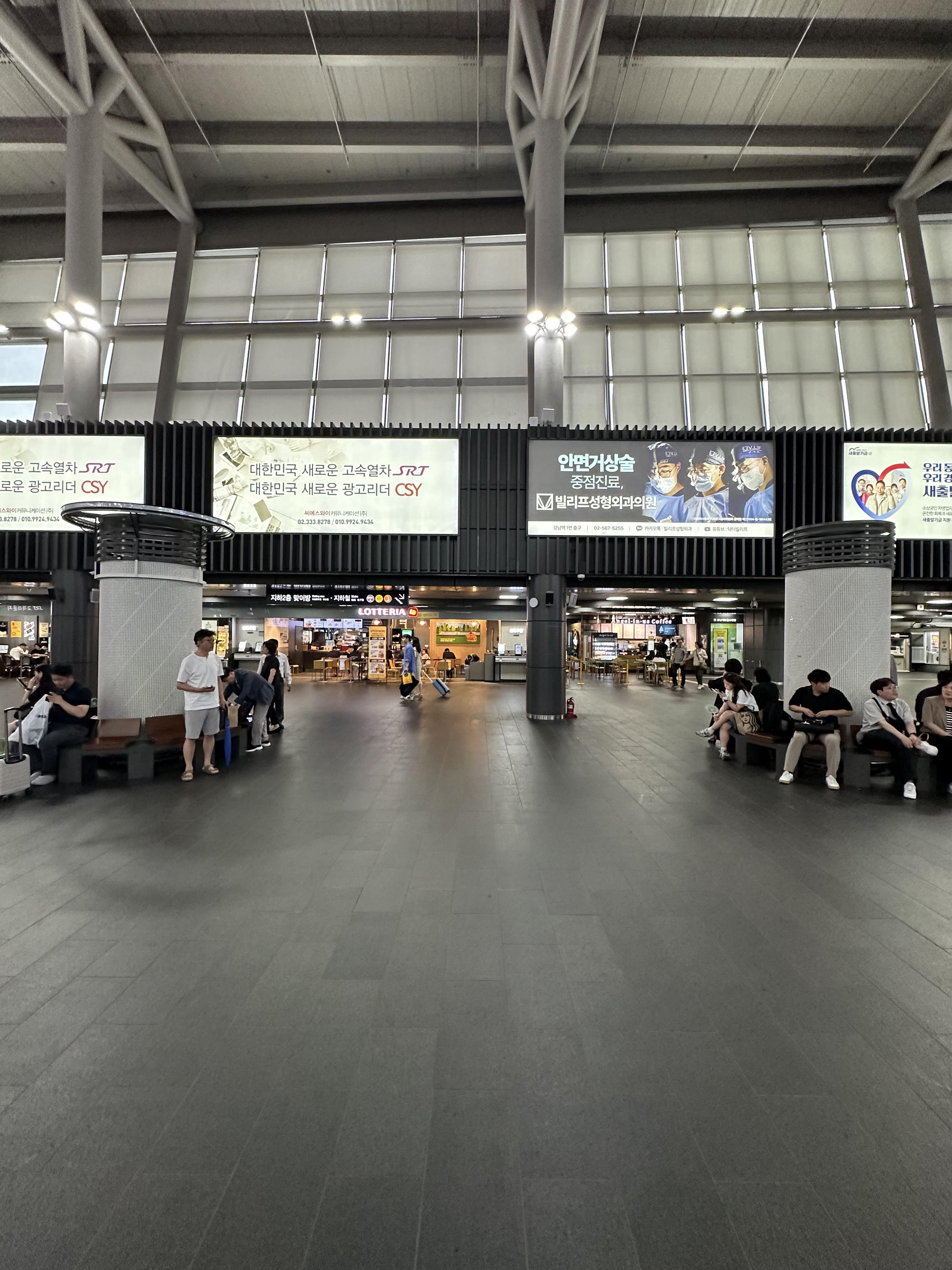 수서역 건물에서 들어오면 낮은 에스컬레이터를 타고 매표소가 보이는 대합실로 내려오게 됩니다. 서울역과 용산역에 비하면 키오스크나 직원이 많지는 않아보입니다. 또한 서울역과 용산역에 비하면 경부선, 전라선 호남선을 이용할 수는 있지만 열차는많이 없습니다. SRT 승강장이 많지 않은점도 한몫 하는것도 있습니다.