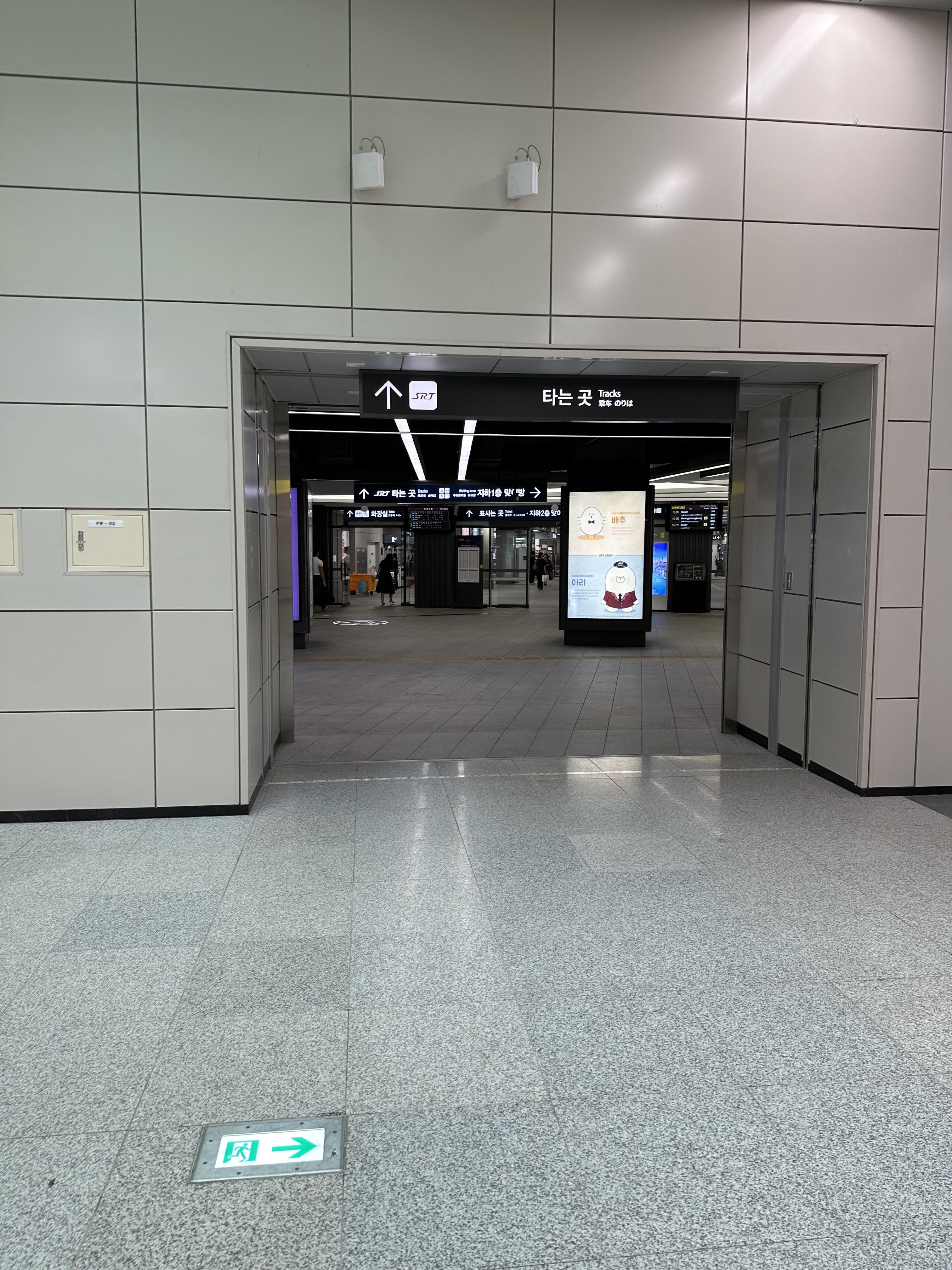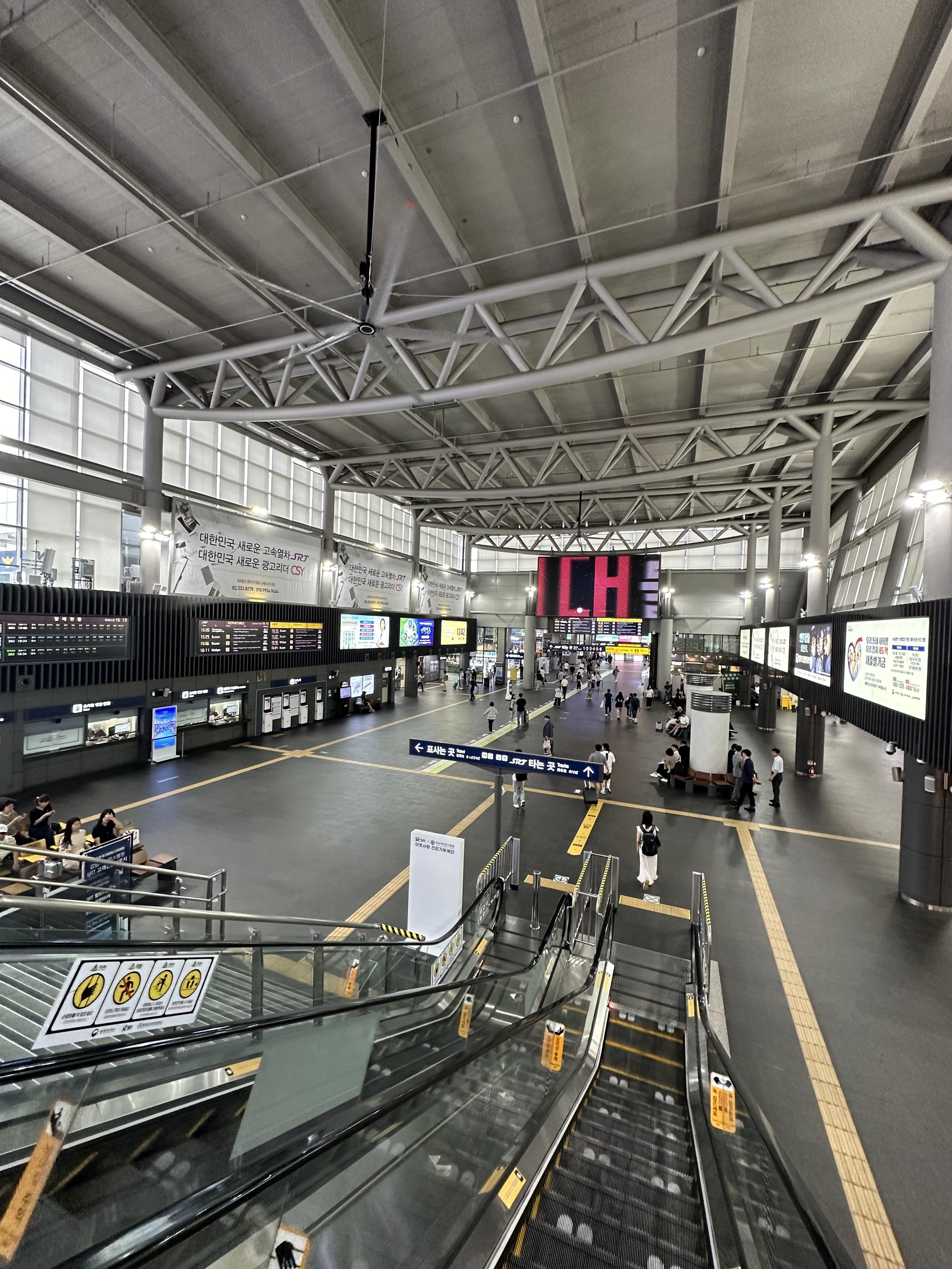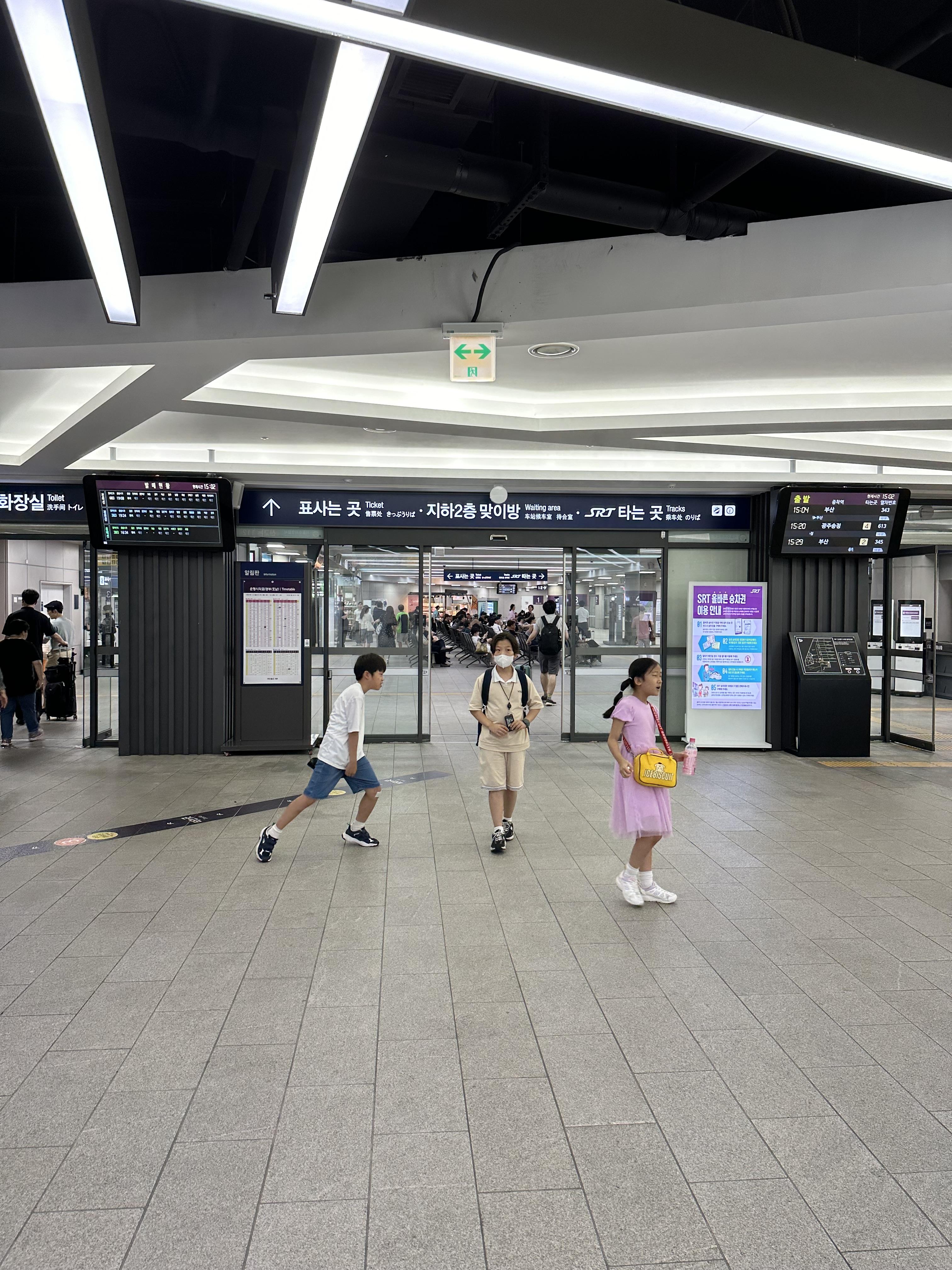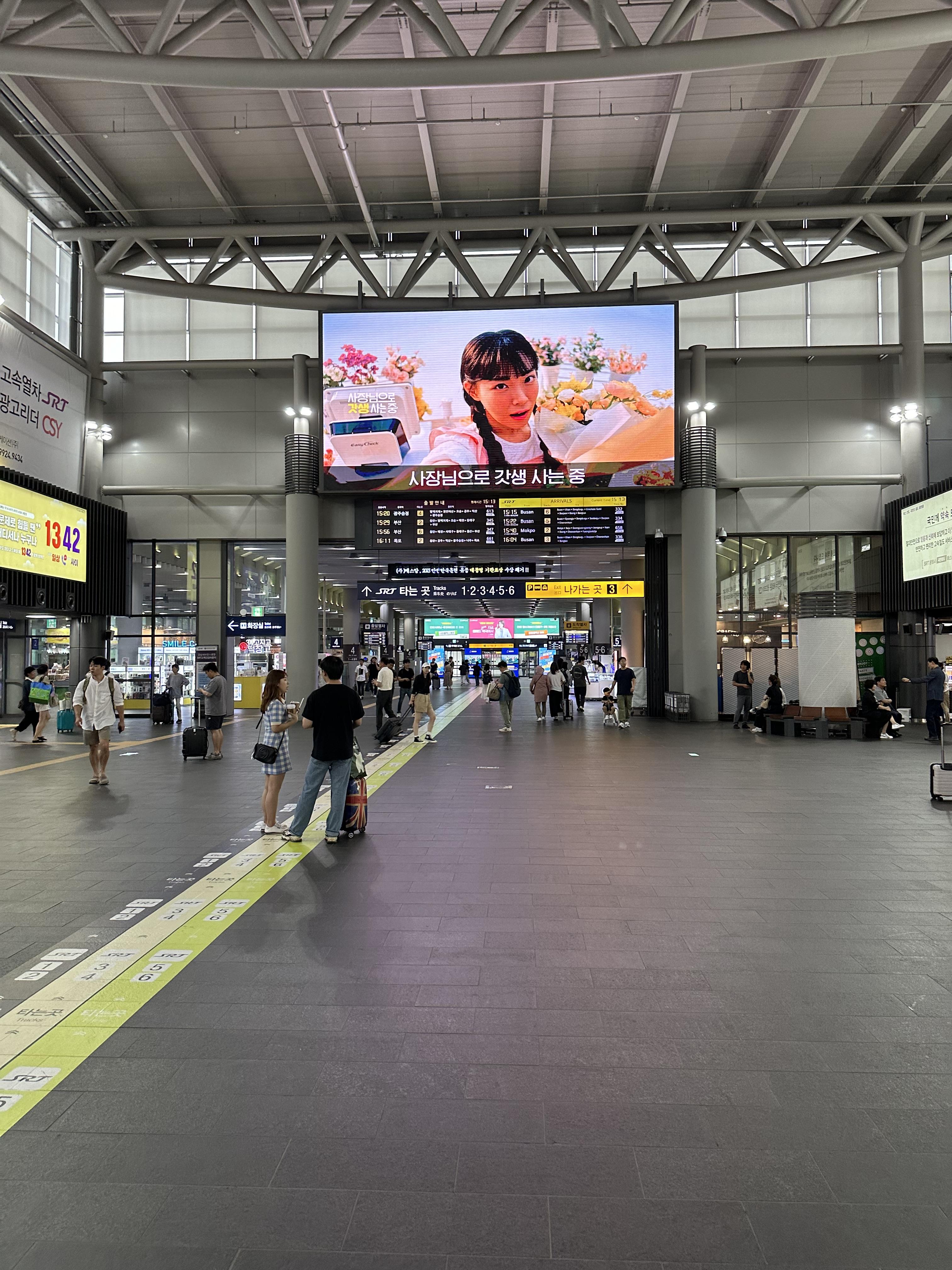 수서역 건물에서 들어오면 낮은 에스컬레이터를 타고 매표소가 보이는 대합실로 내려오게 됩니다. 서울역과 용산역에 비하면 키오스크나 직원이 많지는 않아보입니다. 또한 서울역과 용산역에 비하면 경부선, 전라선 호남선을 이용할 수는 있지만 열차는많이 없습니다. SRT 승강장이 많지 않은점도 한몫 하는것도 있습니다.