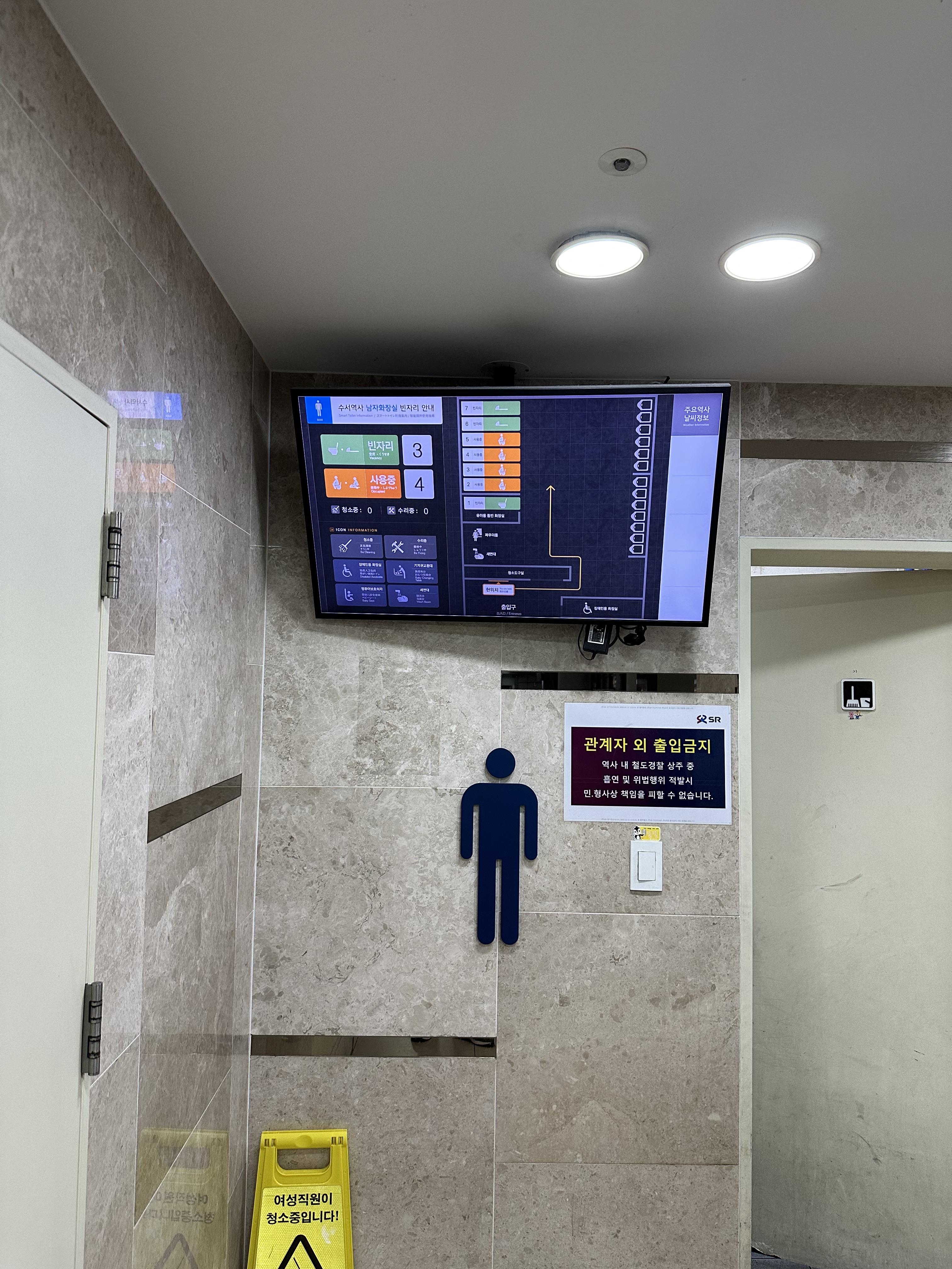 열차 표를 구매하기전에 화장실을 다녀왔습니다. 서울역과 용산역에도 있던지는 잘 기억은 나지 않습니다. 수서역 화장실에는 대변기를 누가 이용하고 있는지를 보여주고 있었습니다. 소변이라 시간이 오래 걸리지 않지만 대변의 경우에는 급할경우 들어갔다가 다시 나오기는 힘들 수 있습니다. 뭐 여러면에서 화장실 상황을 미리 안다면 주변에 가까운 화장실을 이용할 수 있어서 좋을 거 같습니다.