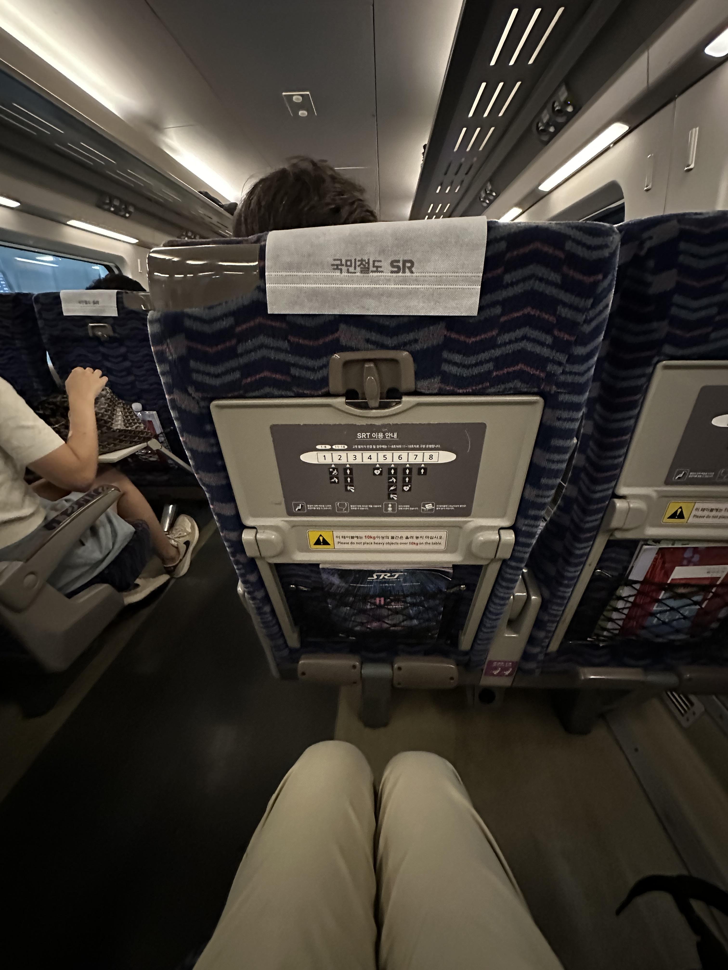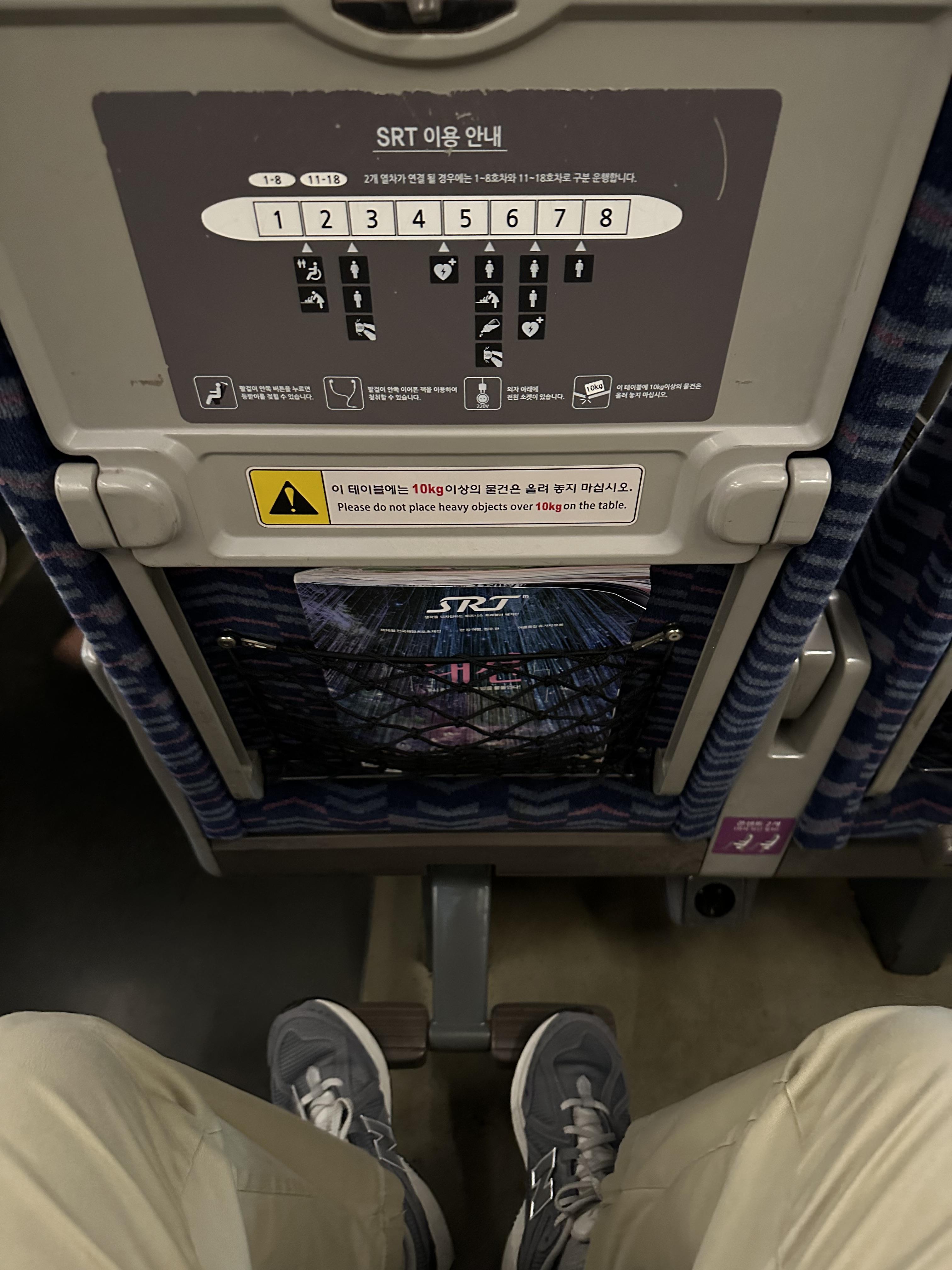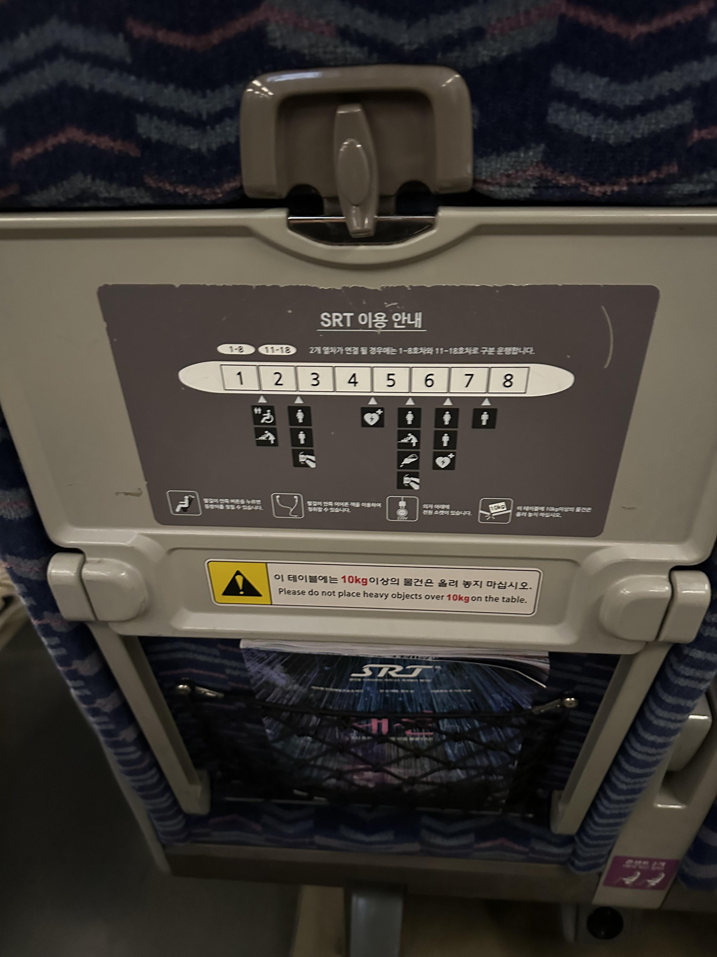 SRT 뿐만 아니라 KTX나 KTX산천, KTX이음, ITX 청춘열차 모두 출입문 앞에는 이렇게 작은 의자가 있습니다. 자유석이라고 불리는 의자입니다. 자유석이라는게 열차 예매할 때 선택 할 수도 있습니다. 다만 출입문 바로 앞에 있기 때문에 여름에는 문이 열릴때마다 뜨거운 바람과 겨울에는 찬바람을 느껴야 하기 때문에 가급적이면 객실내 좌석을 미리 미리 끊는 편을 추천합니다.