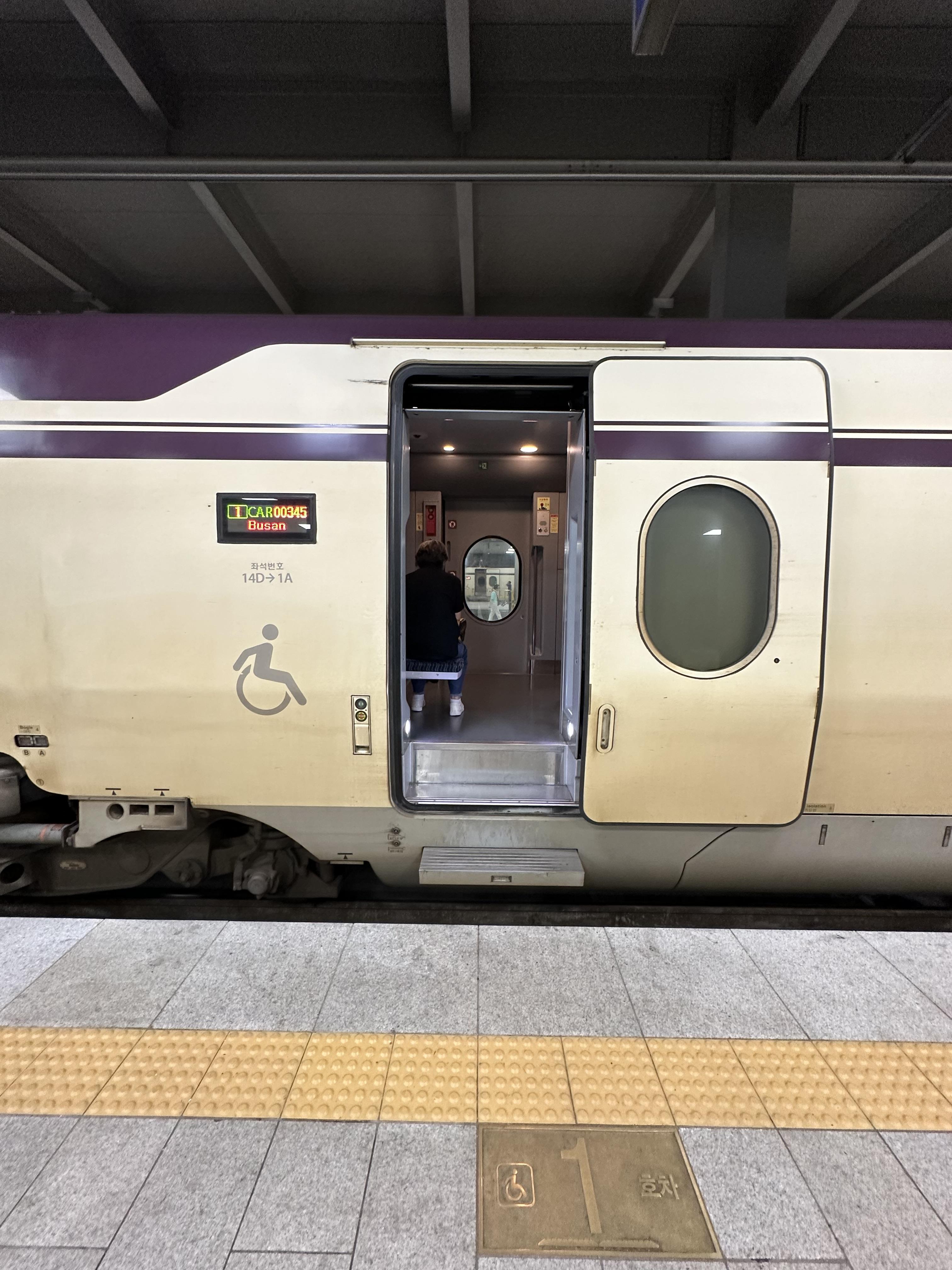 아쉽게도 SRT의 경우 고상홈과 저상홈을 모두 다닐 수 있는 열차는 아닙니다. 승차할 때는 계단을 통해 오르게 되어있습니다. 지난 여행에서 동력분산식 열차 준고속열차에 비하면 아쉽기는 합니다. 동력분산식 열차의 경우 지하처럼 열차 맨앞에 동력차가 없기 때문에 더 많이 탈수 있지만 SRT의 경우 기존 KTX나 KTX산천처럼 동력차가 있기 때문에 많이 탈수는 없다는 단점이 있습니다. KTX처럼 일부 열차 칸은 장애인 휠체어들어갈 수 있는 객실도 있었습니다.