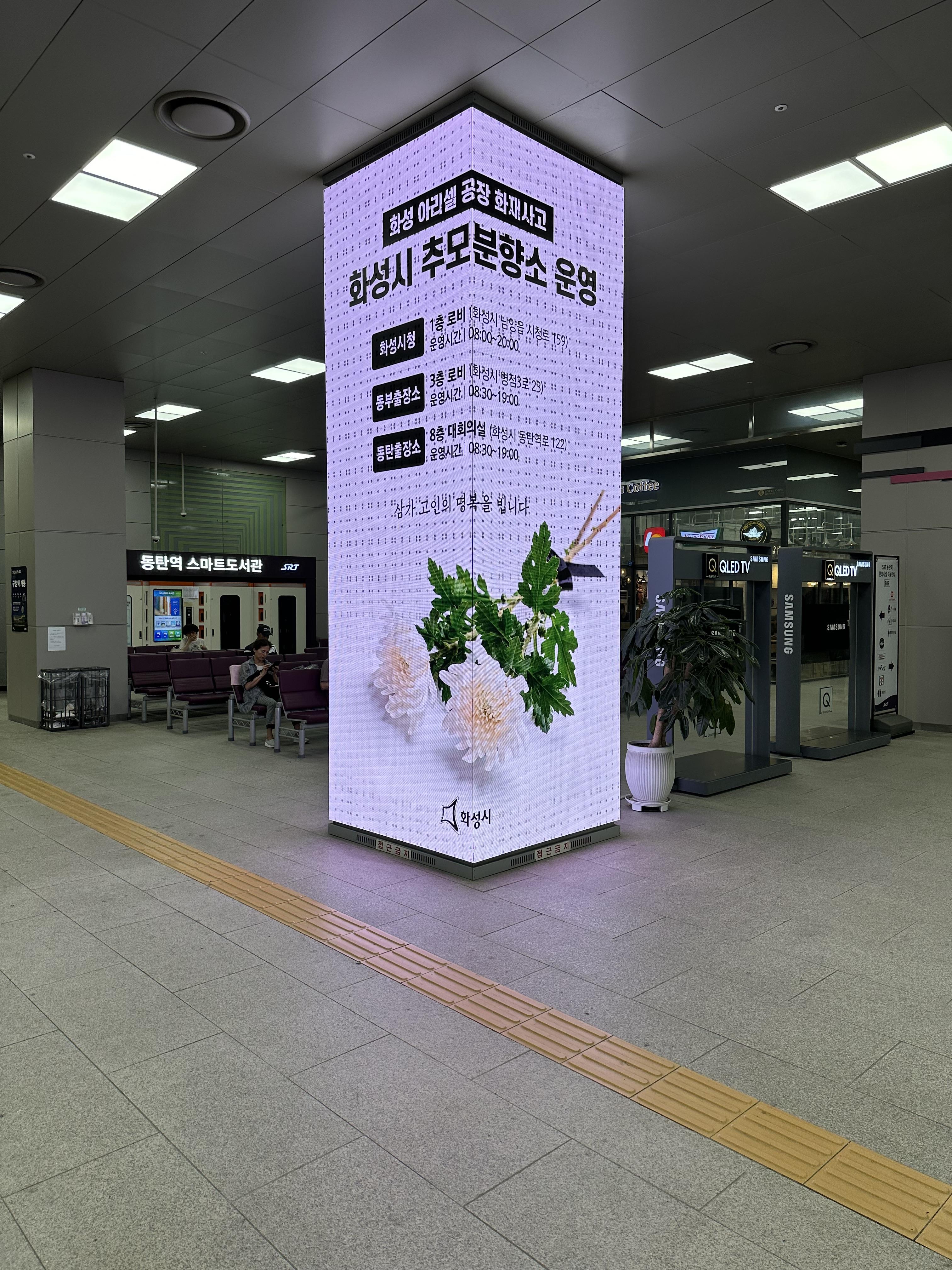 7월초에 GTX 구성역이 개통되어 수인분당선을 타고 가깝게 이용했습니다. 그리고 수서에서는 오래간만에 SRT를 타고 동탄역에 가보자 해서 이용했는데요. 지난 5월인가 경기도에서는 교통비 할인이 되는 경기패스가 출시되었습니다. 경기패스를 통해 조금이나마 교통비 할인을 받았습니다. 아직 경기패스를 신청하지 않은 만 34세 이하 청년분들은 경기패스 신청해서 교통비 할인 받으면 좋을 것 같습니다. 당시 몇일전에는 화성 아리셀공장에서 화재사고로 인명사고가 났습니다. 이에 대해 추모식이 열리고 있었습니다. 같은 화성시인 동탄역도 예외는 아니였으며 화성시에서는 아리셀 공장 화재사고 추모식도 가지는것으로 보였습니다.