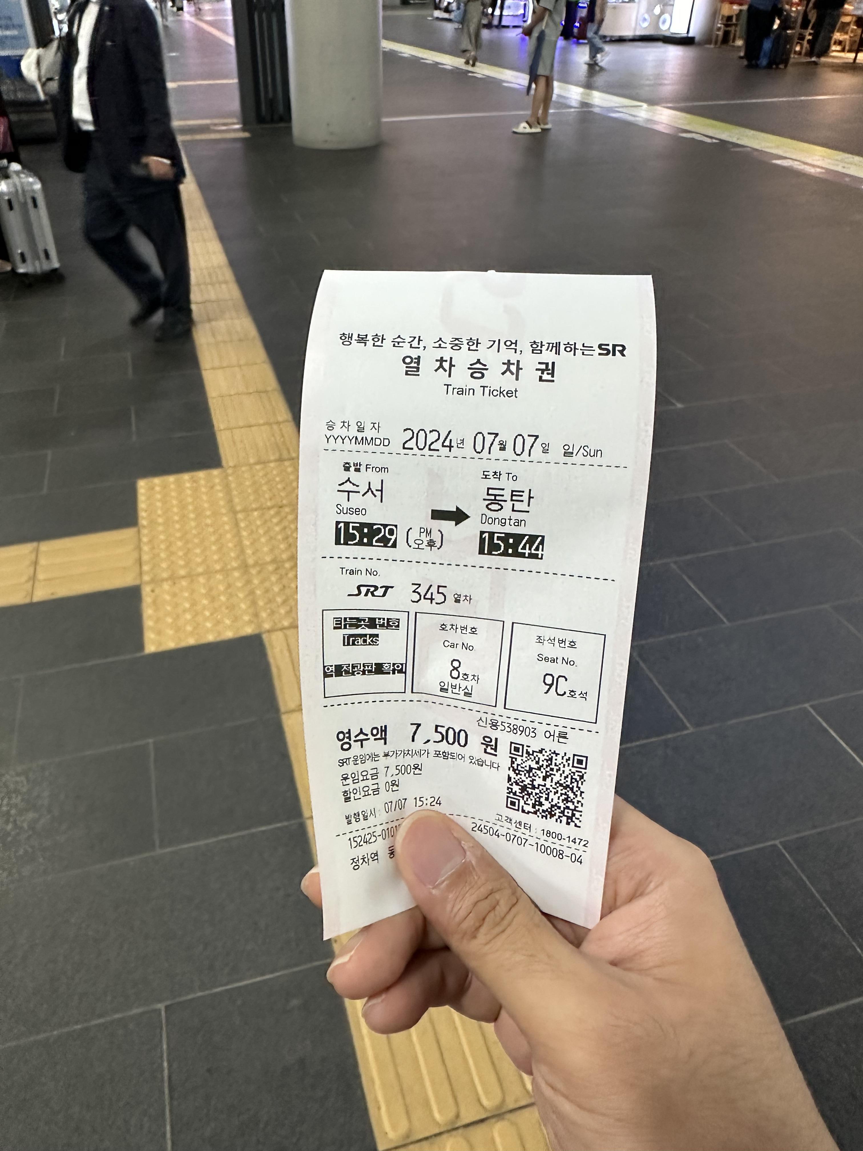 요즘은 대부분 모바일앱을 이용해서 모바일 승차권을 구매하는데요. GTX를 타고 수서역에 와서 모바일앱을 통해 열차 시간은 확인했지만 수서역에서 어떻게 될지 몰라 모바일로 끊지 못한덕에 어쩔 수 없이 오래간만에 키오스크를 이용해 종이 승차권을 발권했습니다. 수도권 광역급행철도 GTX에 비하면 SRT의 경우 수서에서 동탄까지 한번에 가기 때문에 좀 더 가격이 비싼 편입니다. 수서에서 동탄까지 약 15분 걸리며 7,500원이 들어갑니다.