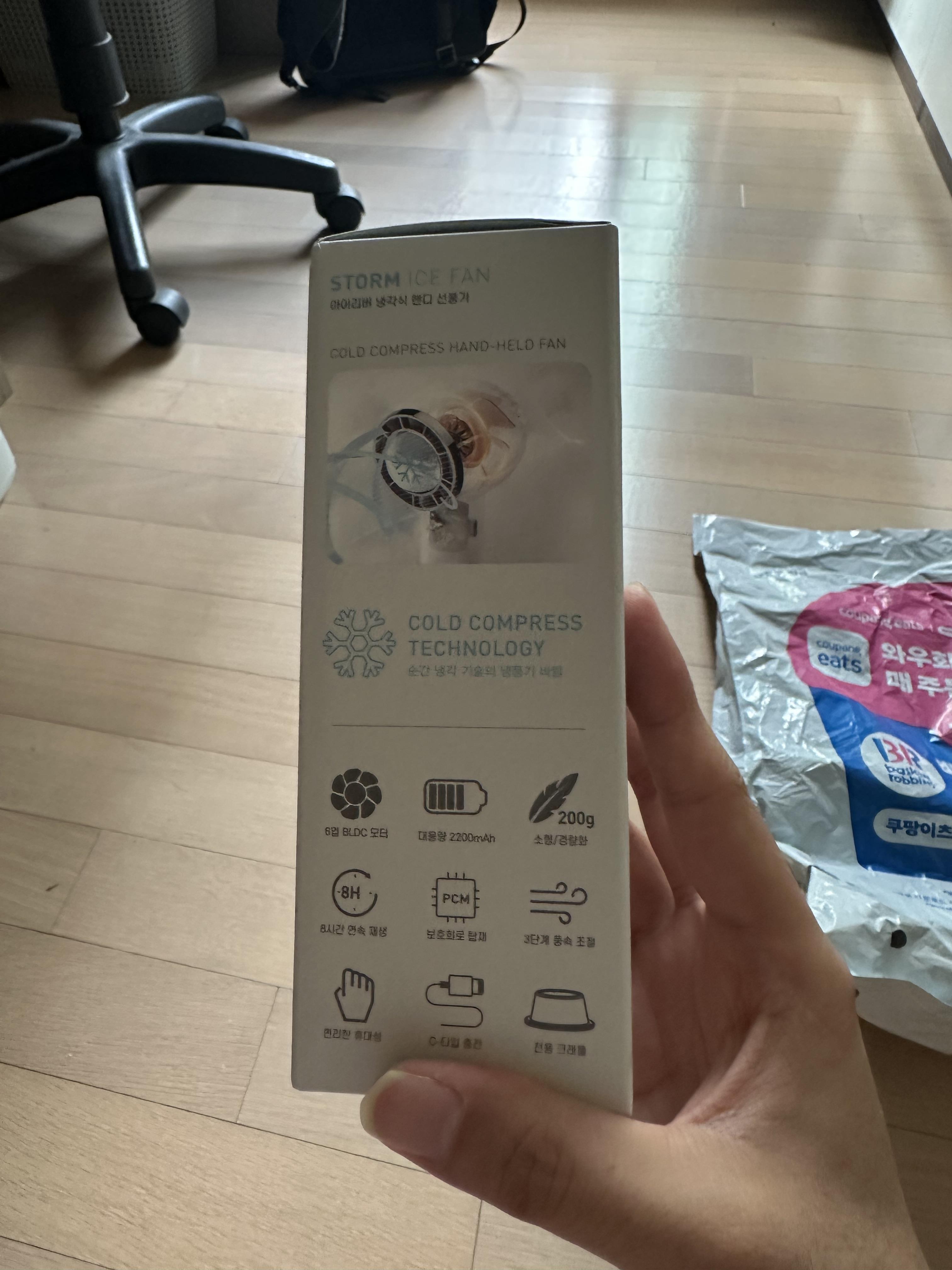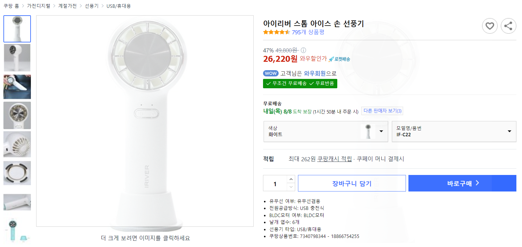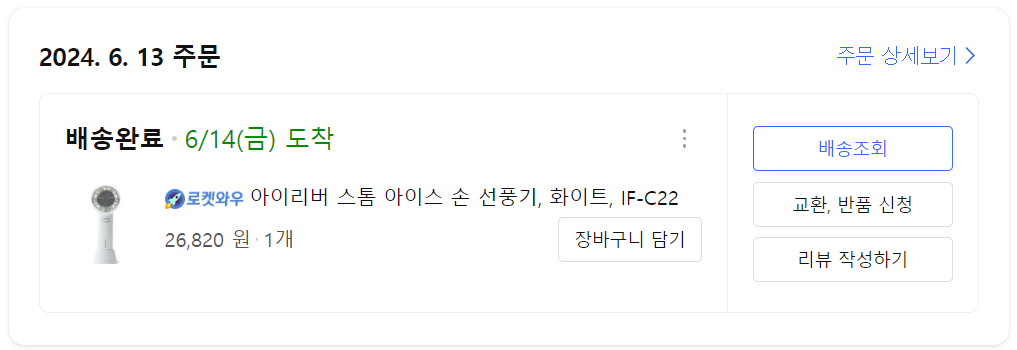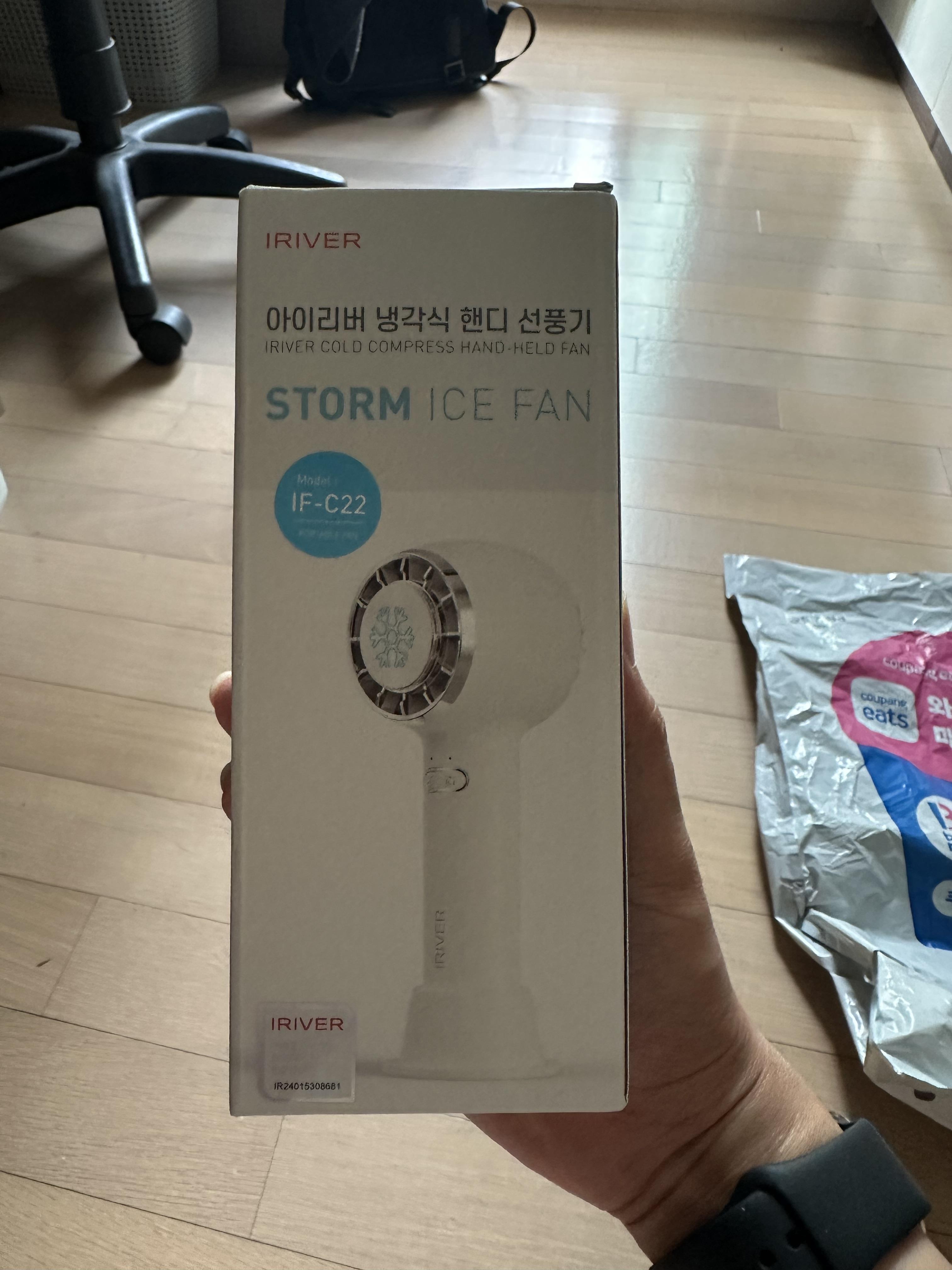 제가 구매했던 상품은 아이리버 스톰 아이스 손 선풍기입니다. 색상은 화이트 모델입니다. 쿠팡 로켓배송으로 주문을 했습니다. 쿠팡 로켓배송을 한번 쓴 사람이라면 중독처럼 끊기가 어렵습니다. 올해 8월 드디어 인상된 금액으로 올라갔느데요. 비싼 금액이더라도 빠른 배송과 저렴한 것 때문에 끊을 수없더라구요. 그러나 최근 쿠팡에서 와우멤버십 갑작스럽게 인상과 택배기사 과로사, 공정위 과징금 등 여러가지 안좋은 상황들이 벌어지고 있습니다. 결국에 그것이 뭐라하더라도 소비자 입장에서 쿠팡은 빠른 배송이기 때문에 큰 문제는 없을거 같습니다 하지만 쿠팡의 이미지를 생각해서라도 잘 해결되었으면 좋겠습니다. 저는 쿠팡 로켓배송으로 6월 13일 목요일 주문을 했고 다음날 6월 14일에 배송을 받았습니다. 당일 오전중에 주문 시에는 저녁에 받을 수 있고 만약 늦은 오전이나 오후에 시킨다면 다음날 새벽에 받을 수 있습니다.