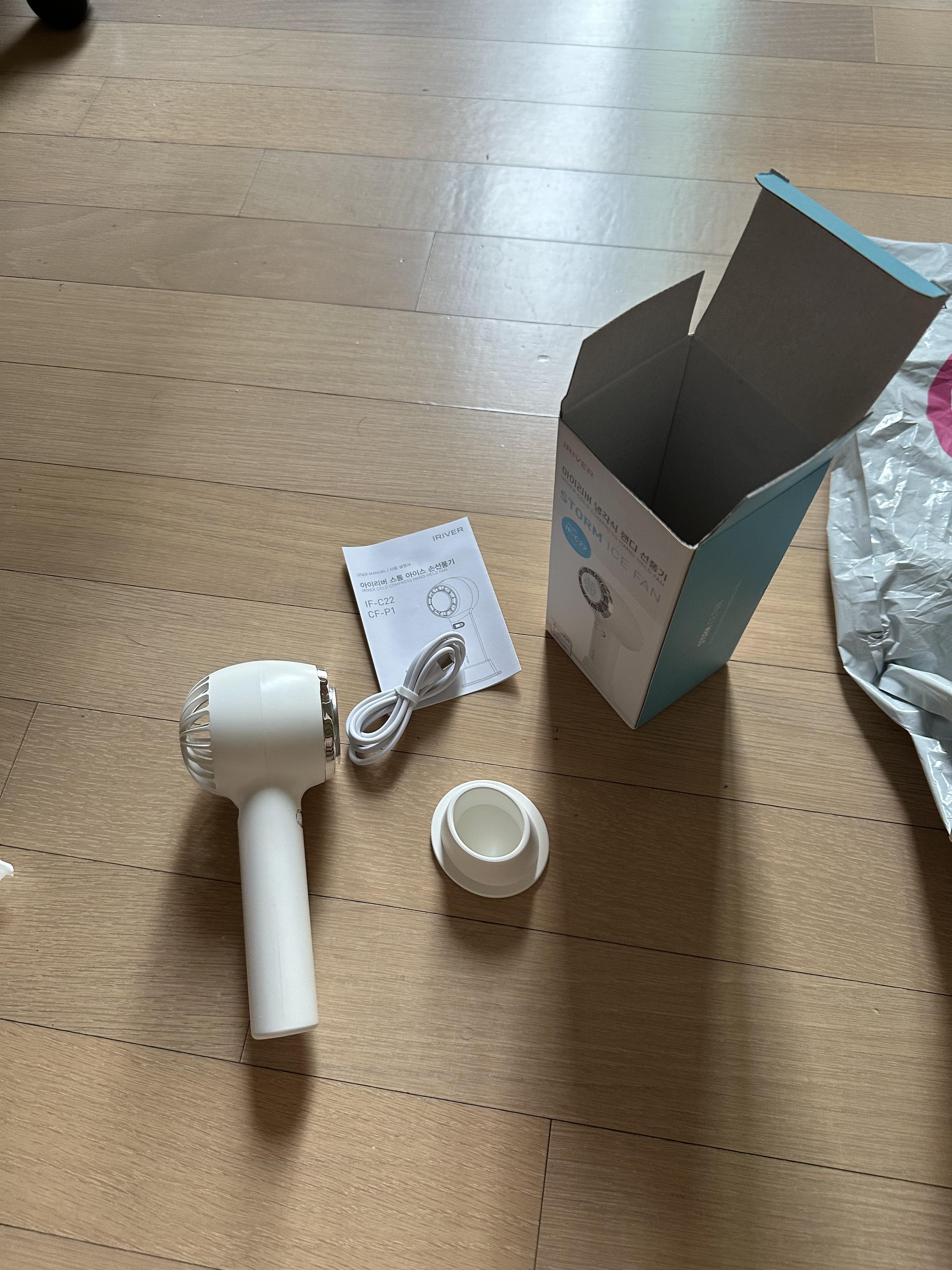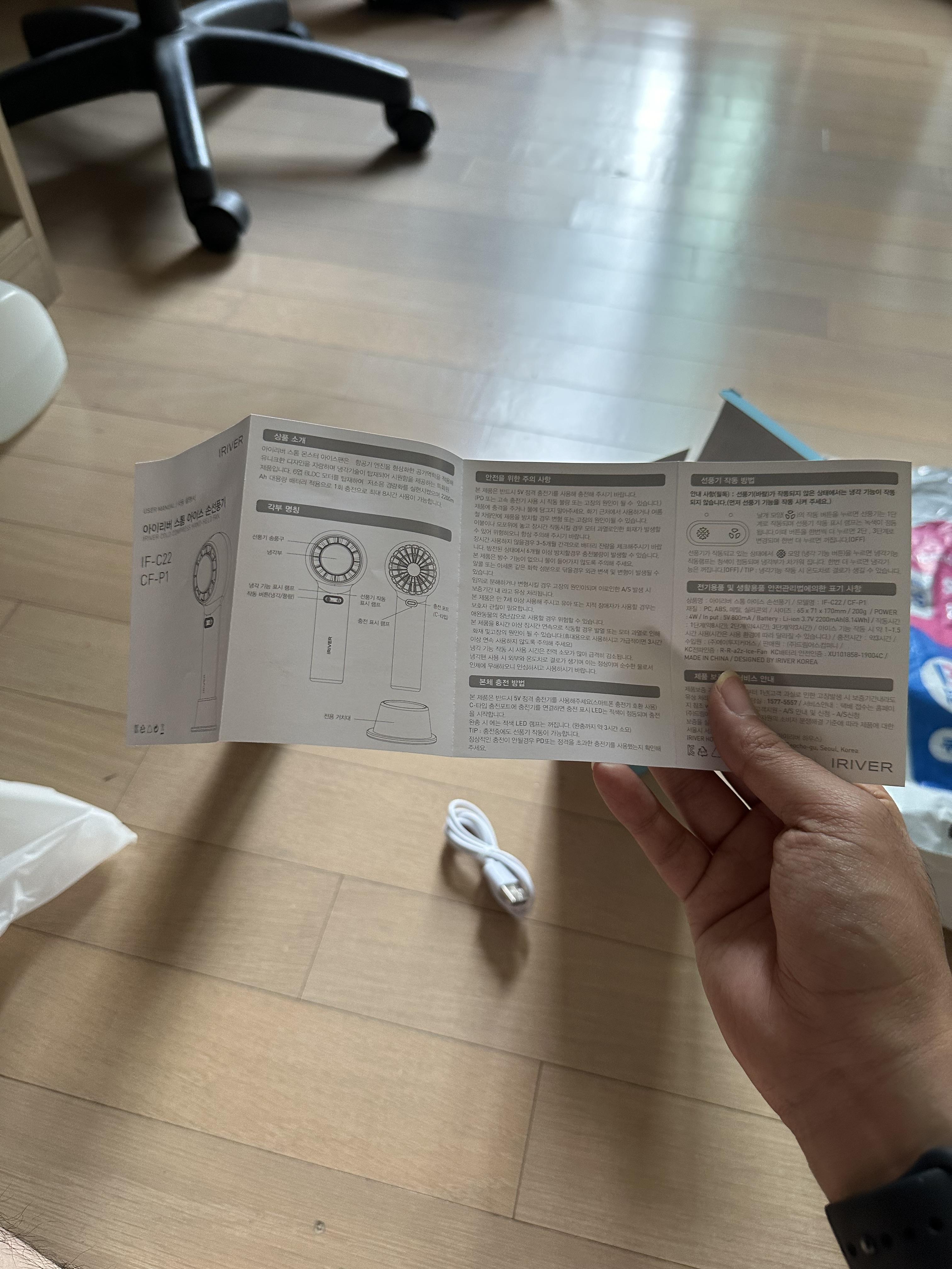 이제 아이리버 스톰 아이스 손 선풍기를 제품 박스에서 개봉해보도록 하겠습니다. 쿠팡 포장지에 비해 제품은 작고 아담하고 필요한 내용만 가볍게 들어있었습니다. 박스를 뜯어보면 손 선풍기는 별도로 비닐에 한번 더 포장이 되어있었습니다. 탁상용으로 사용 할 수 있도록 도와주는 전용 크래들(받침대)와 충전할 수 있는 USB케이블 그리고 설명서가 제품 박스안에 들어 있었습니다.