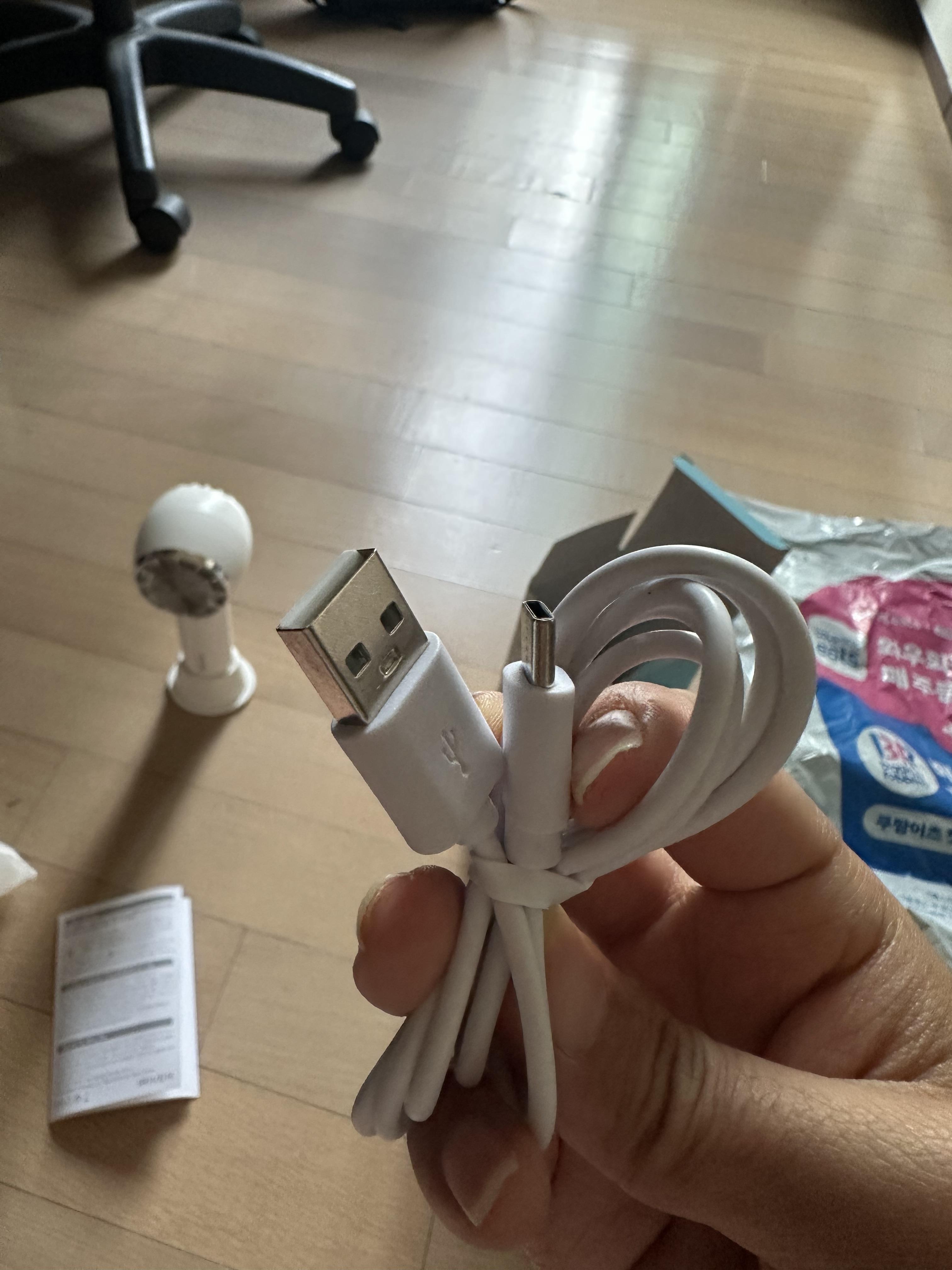 제품을 충전할 때는 케이블입입니다. 아이리버 스톰 아이스 손선풍기 충전 시키기 위해 접촉할 때만 C타입이고 반대편은 기존 USB이기 때문에 충전 어댑터는 다이소나 문구 완구류 매장에서 쉽게 구매도 가능할 수 있습니다. 아이리버 스톰 아이스 손 선풍기는 별도의 어댑터는 주지 않고 이렇게 케이블을 주고 있습니다. 마약 긴 케이블이 필요하다면 1m이상 혹은 2m이상 짜리 케이블 사면 좋을 것 같습니다.