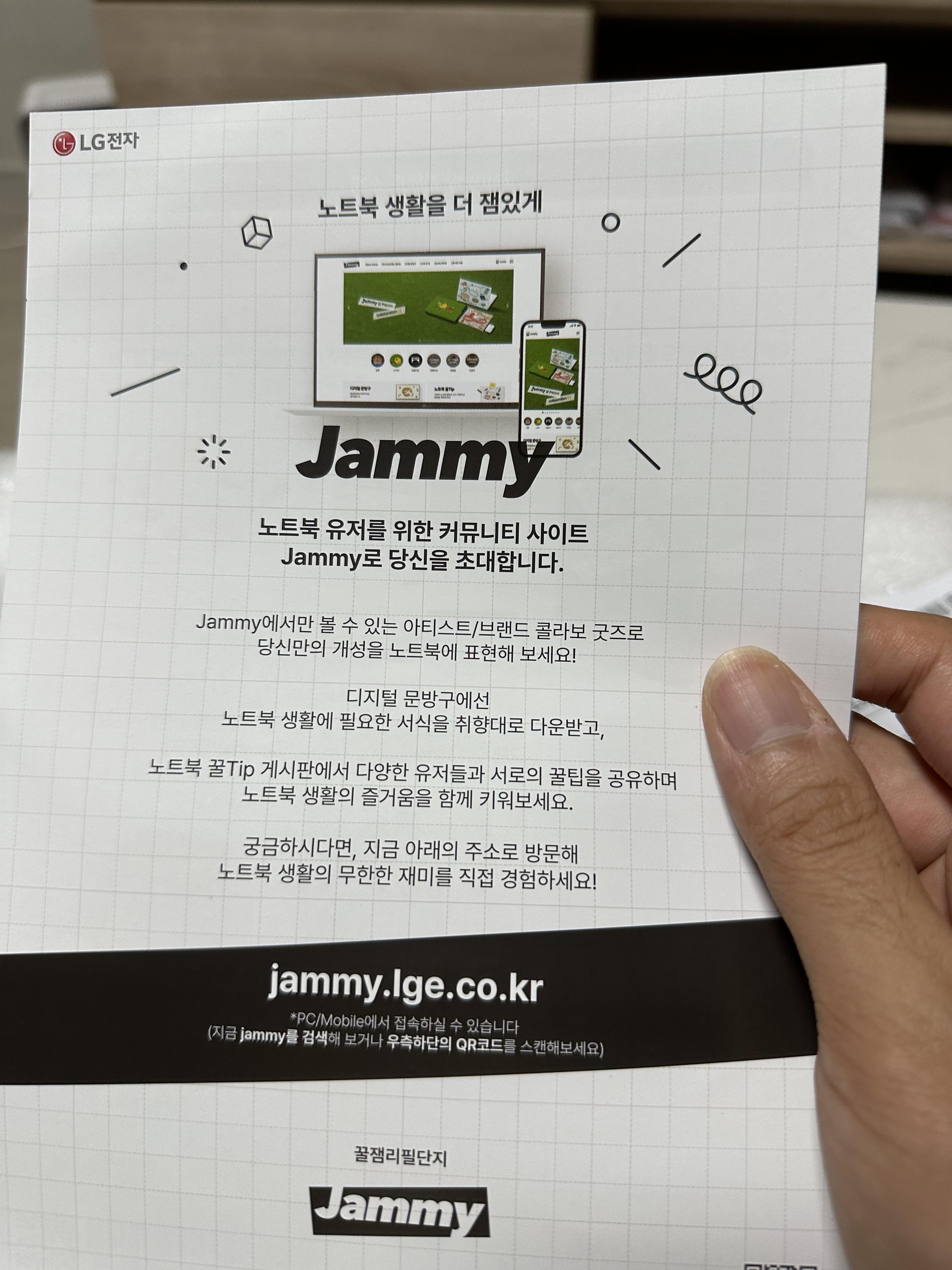 엘지그램 노트북을 개봉하면서 꿀잼리필단지 Jammy라는 것을 발견 했습니다. 노트북을 사용하면서 서로 정보를 공유하면서 재미와 정보를 얻을 수 있다고 합니다. 이미지를 클릭하면 해당 사이트로 이동 할 수 있습니다.