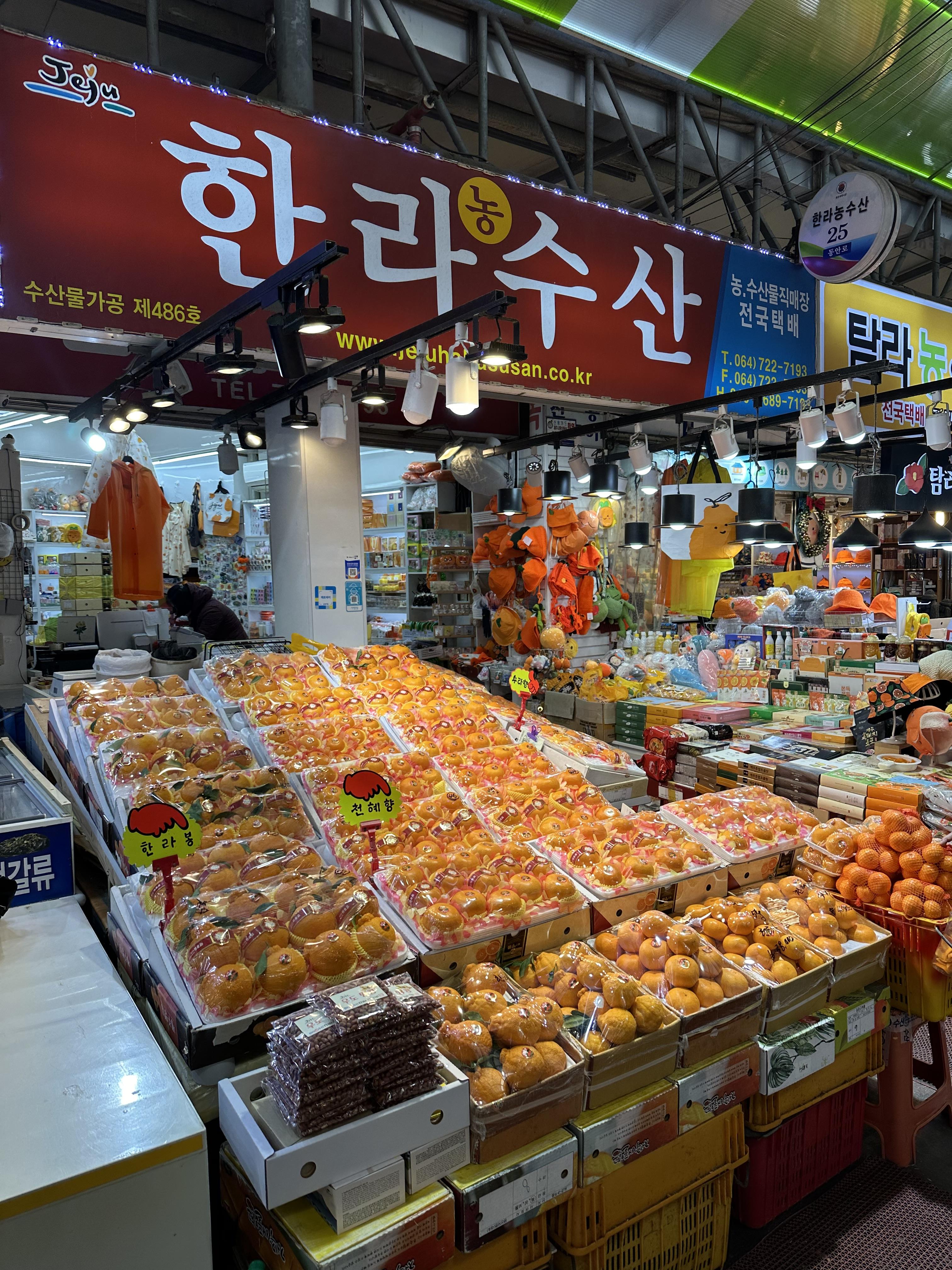 - 제주도 하면 유명한게 있다면 감귤이죠. 서귀포 올레시장과 마찬가지로 한라봉, 천혜향, 레드향 등 다양한 감귤을 판매하고 있어요.