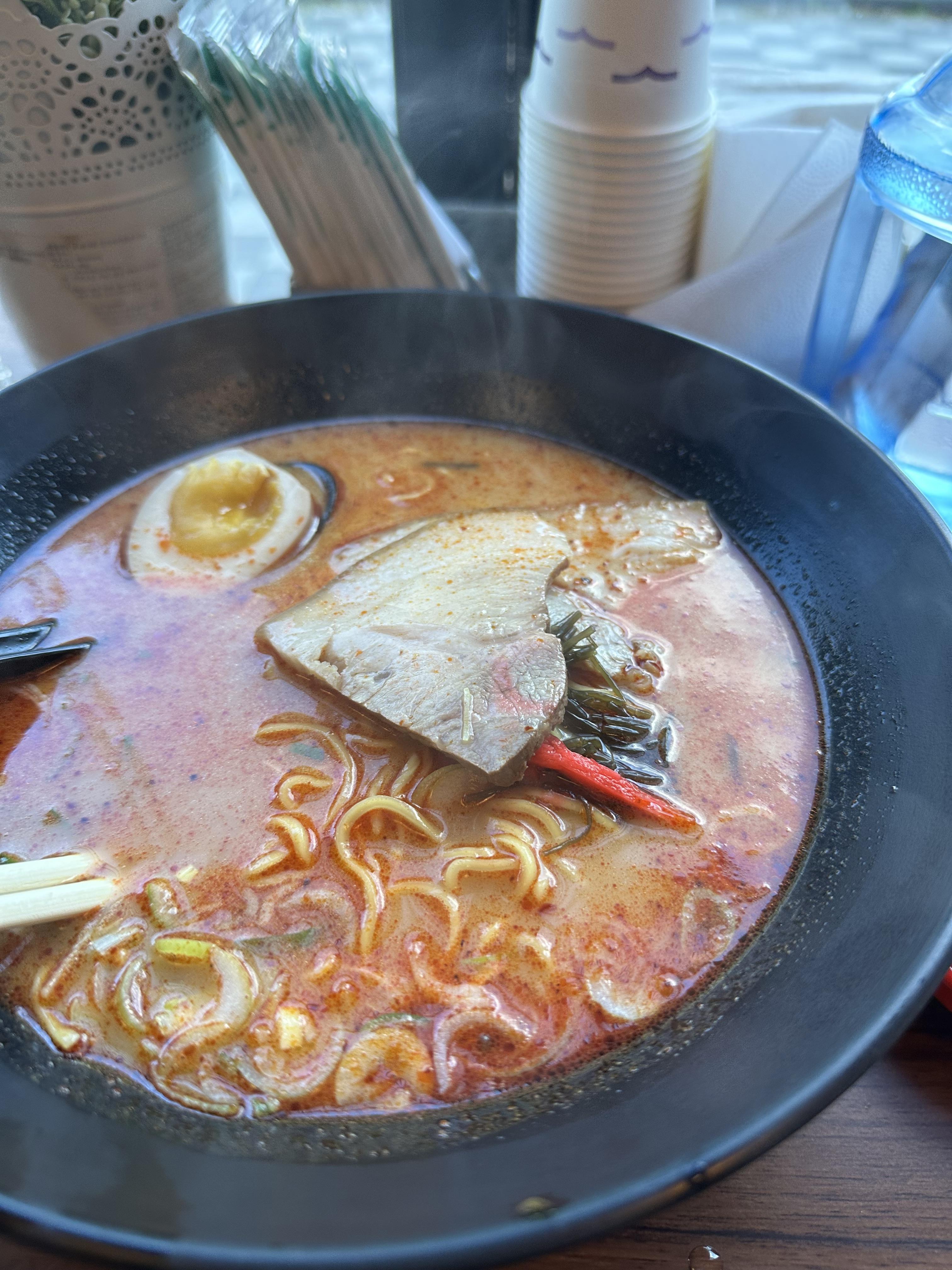 드디어 제가 주문한 매콤 돈코츠 흑돼지 라면이 나왔습니다. 평소에 라멘을 싫어하지는 않지만 좋아합니다. 특히 매콤라멘을 좋아합니다. 한국사람이 매운거 좋아한다고 할까요. 그냥 라멘의 경우에는 약간 느끼한 맛인 것 같습니다.