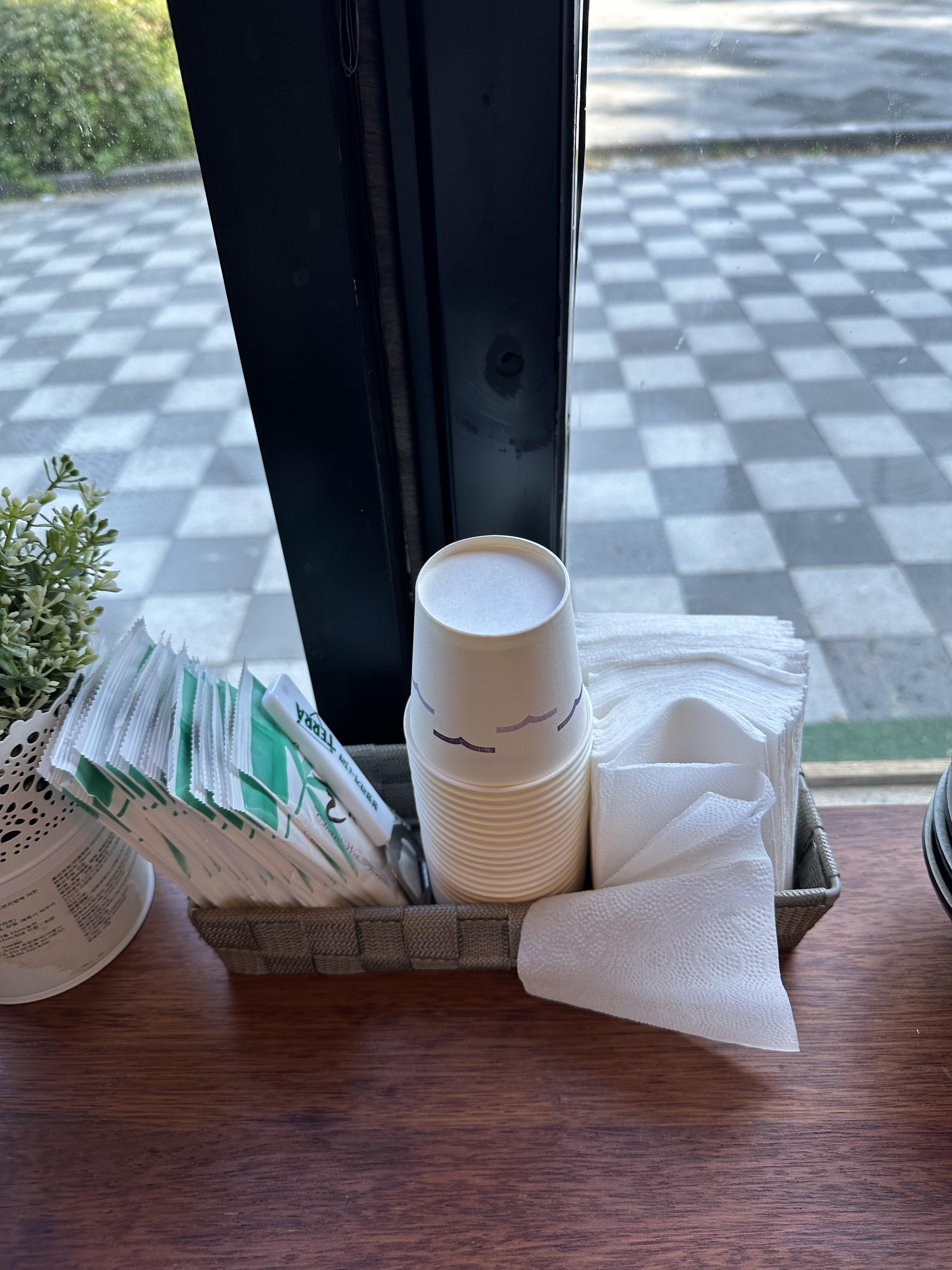 저는 매콤 돈꼬츠 흑돼지 라멘을 주문 했습니다. 그리고 창문이 보이는 혼자 앉는 좌석에 앉았습니다. 창문 앞에 테이블에는 종이컵과 냅킨, 물티슈, 병따개, 앞접시가 있었습니다. 점심시간이 지난 시간이라 사람이 많이없어서 여유로웠습니다. 손님이 한명 있었는데 제주도에는 외국인이 많다는 애기가 많았는데 외국인 손님이였습니다.