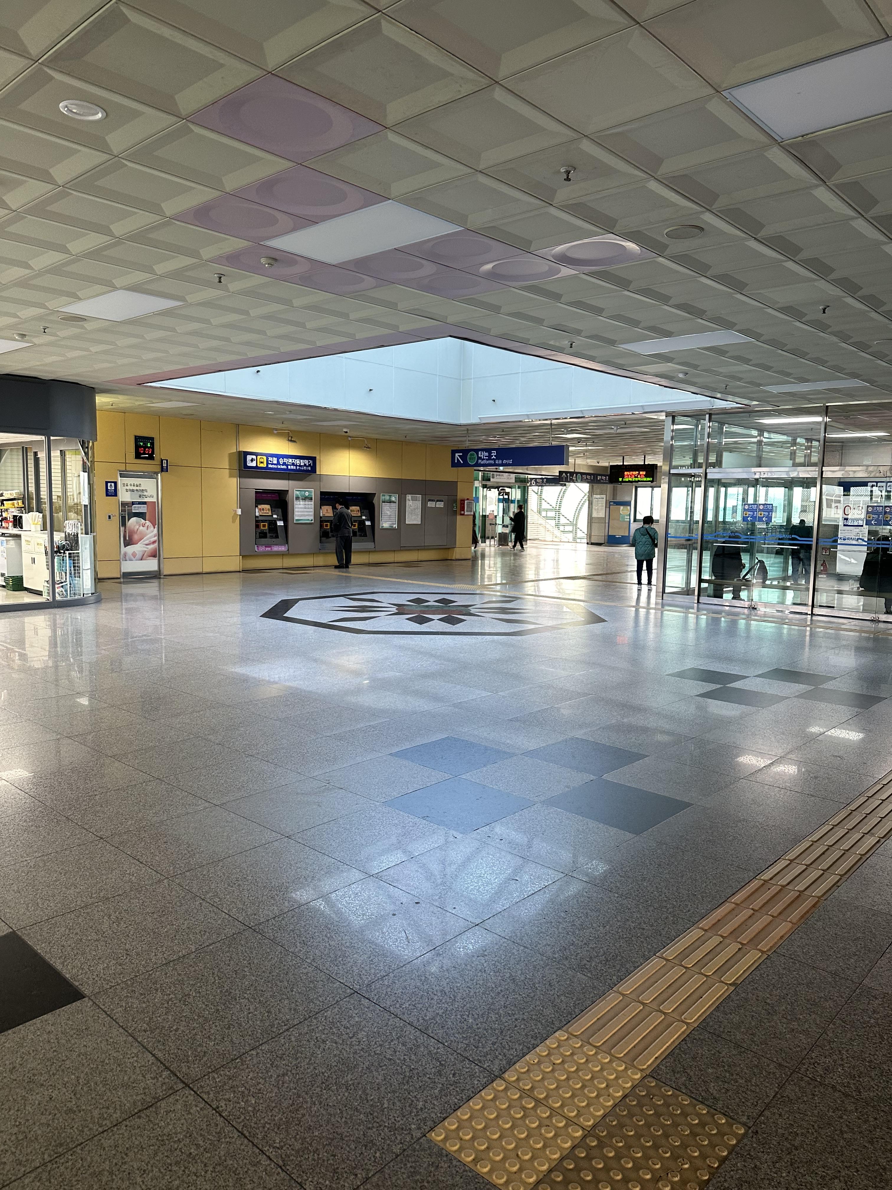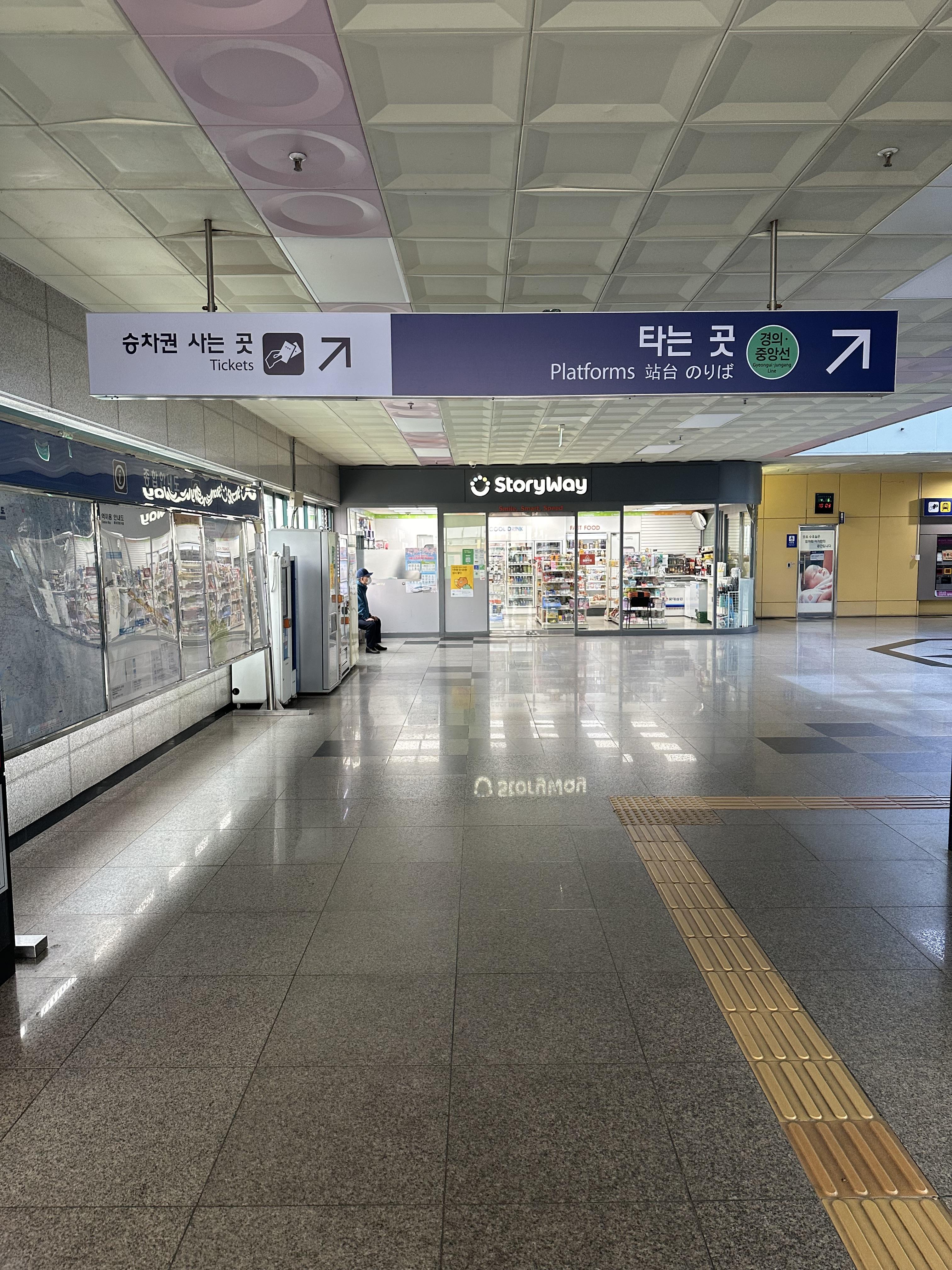 2023년 3월에는 서해선 노선이 개통 전이라 용산역에서 경의중앙선을 타고 문산역까지 2시간 30분 걸려서 도착했다면 서해선 노선의 개통으로 아침 일찍 조금 덜 힘들게 문산역까지 올 수 있었습니다. 용산역을 지나서 오는 것보다 1시간 가량 단축하여 문산역까지 도착했습니다. 파주 민통선 케이블만 탄다면 사실 좀 늦게 와도 되는데요. 군사분계선으로 가는 관광버스를 현장 예약을 해야하기 때문에 아침 일찍 아니면 작년처럼 허탕 칠 우려가 있어서 평소 출근 시간 때처럼 일찍 서해선 노선을 타고 문산역에 왔습니다. 파주 문산역은 군사분계선과도 택시로 20분이면 갈만큼 멀지 않은 지역이었습ㄴ다. 그래서 주변이 시골처럼 높은 아파트보다는 낡고 허름하고 시골느낌이 강했습니다. 문산역에서 민통선 케이블카와 군사분계선 관광버스를 타기 위해서는 문산역까지 와야 합니다. 그리고 문산역에서 하루에 얼마 다니지 않는 경의선 열차를 타고 임진강까지 가야 했는데요. 대곡역에서 경의중앙선이 좀 늦게 오는 바람에 문산역에서 경의중앙선 첫차를 타지 못하고 첫차가 출발한지 10분후에 도착했습니다. 그래서 문산역 주변에 나와서 아침밥도 못먹어 편의점에서 가볍게 밥을 먹고 다시 문산역 대합실로 올라갑니다.