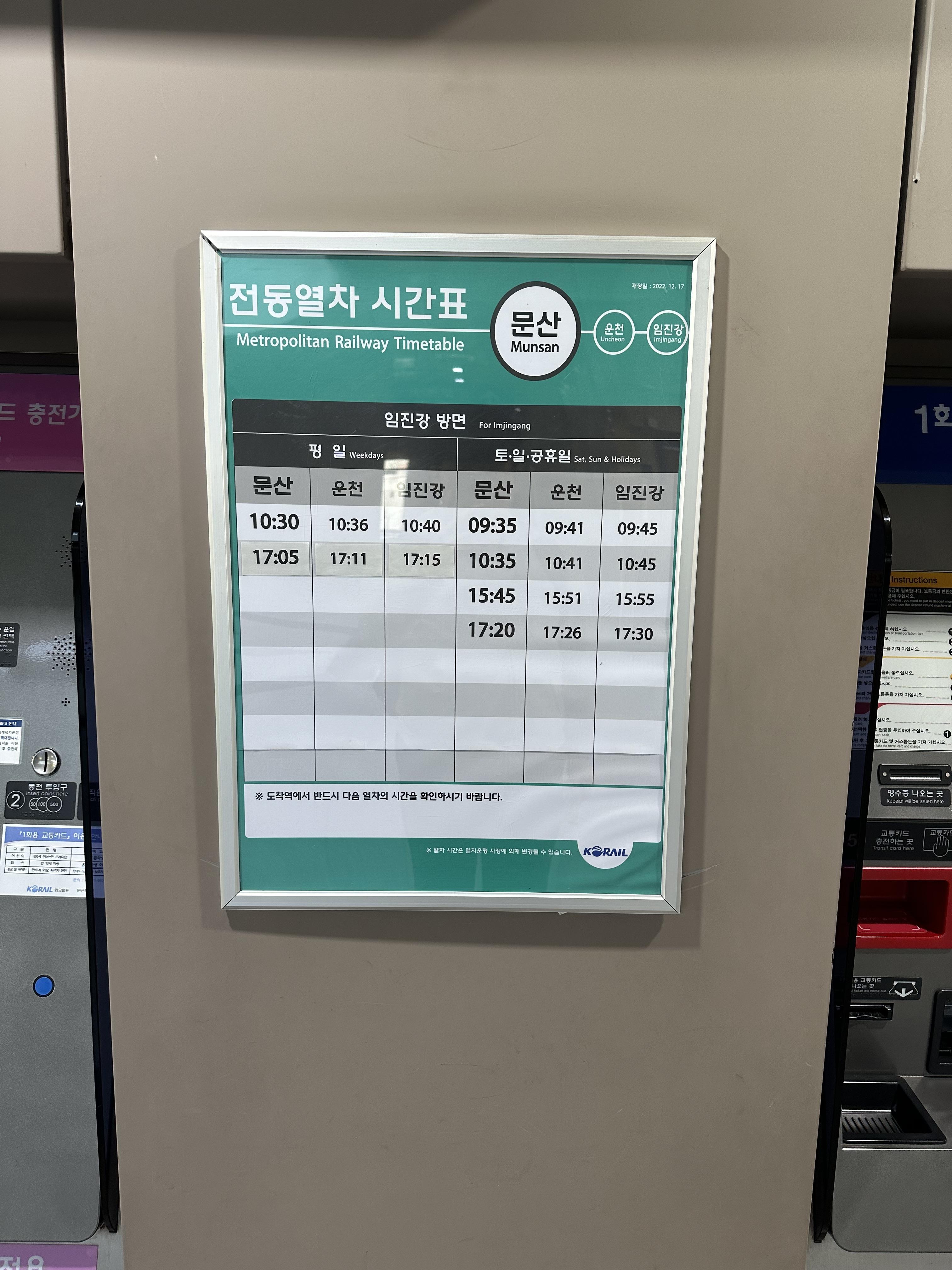 10시 35분에 맞춰 임진강역으로 가는 열차를 타러 이동합니다. 과거에는 지금처럼 전동열차가 아닌 옛 통근열차 통일호와 새마을호 열차가 임진강역을 갔는데요. 당시에는 서울역부터 시작해서 경의선을 따라 임진강역까지 갔습니다. 그러나 열차 노후화등으로 통근열차는 사라진지 오래되었고 몇년전부터 통근열차가 다니기 시작했습니다. 저도 2012년에 통근열차 타고 임진강역을 간적 있는데요.