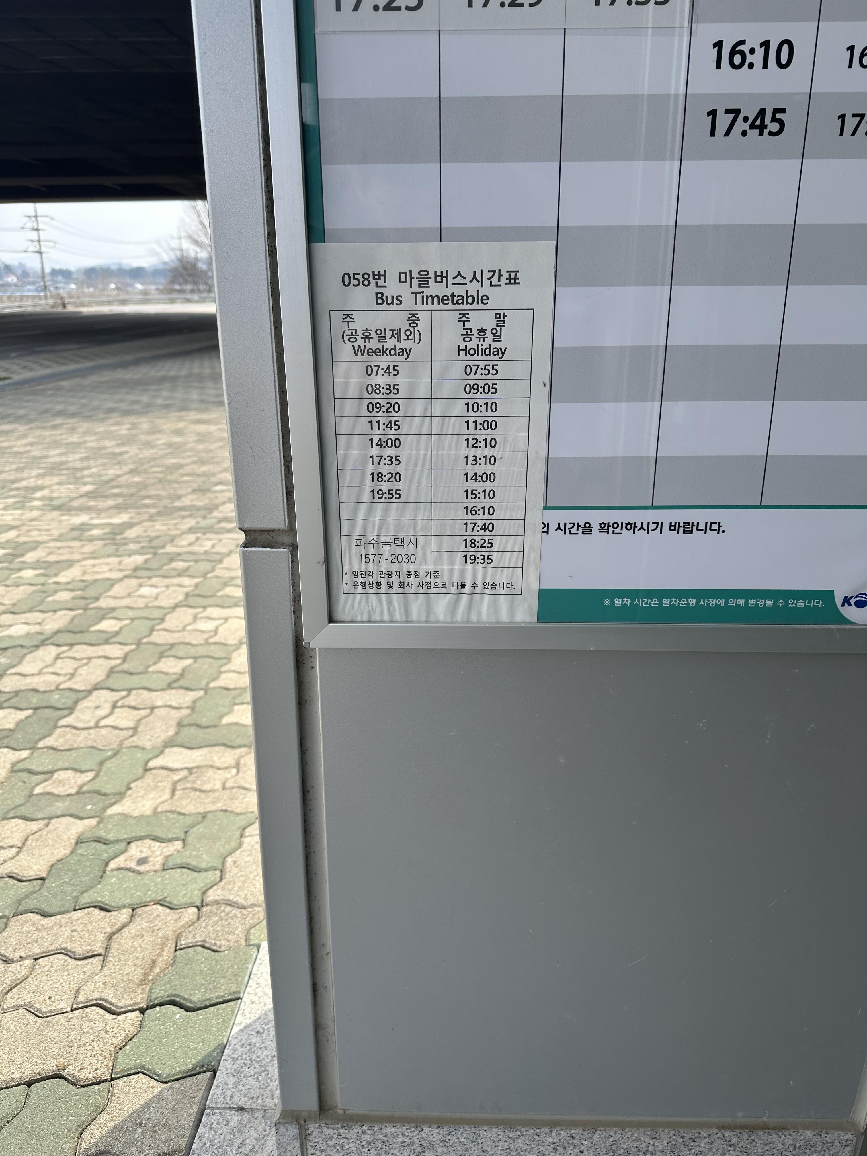 - 58번은 58A와 58B로 다니기는 하지만 자주가 아니라서 추천하지는 않습니다. 시간 맞으면 버스타고 시골풍경 느끼는것도 좋을것 같습니다.