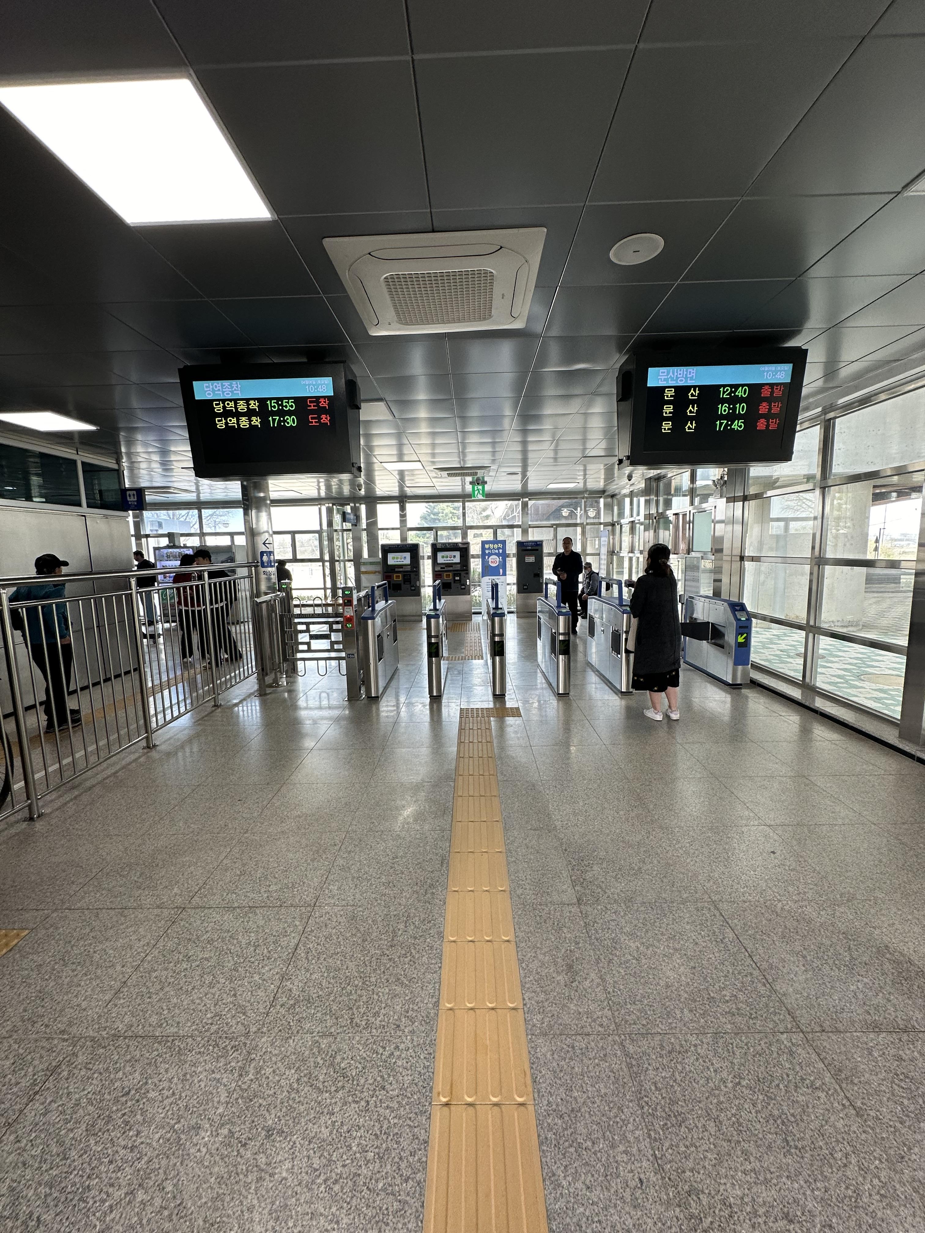경의선 타고 임진강역에 도착해서 승강장 플랫폼을 지나 역사안으로 진입했습니다. 작은 간이역입니다. 매점도 없고 개찰구와 화장실만 있습니다.직원 사무실이 있기는 하지만 직원은 그렇게 보이지 않습니다. 평일에는 왕복 2회 운영하기 때문에 역무원은 그렇게 많이 없는 것 같습니다. 남과 북이 사이가 좋아져서 도라산 관광 열차도 기대가 됩니다.