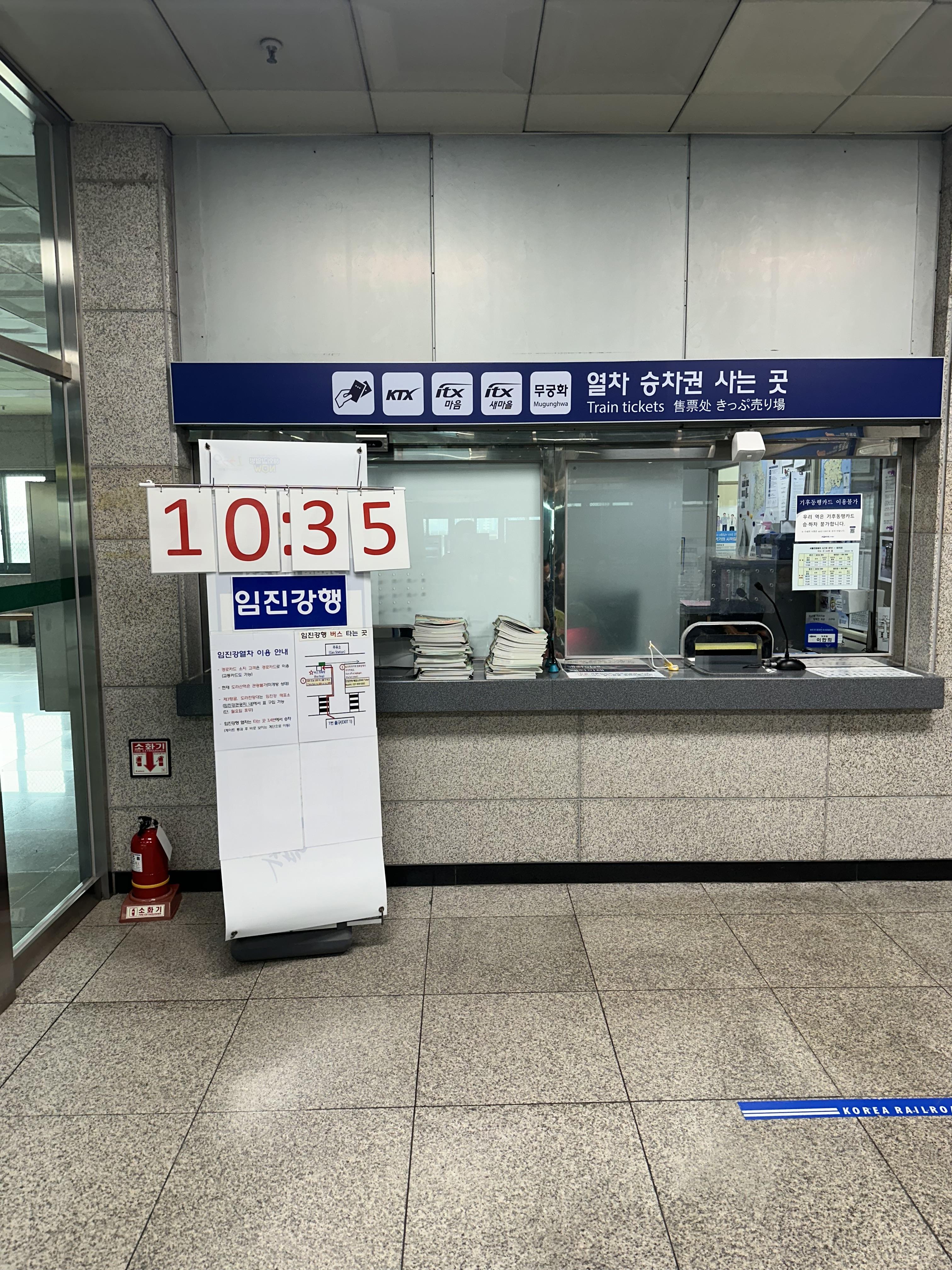문산역 앞에 편의점에서 가볍게 김밥을 먹고 올라와도 시간이 꾀 남았습니다. 대곡역에서 경의중앙선을 좀만 탔다면 한시간 전 임진강행 열차를 탈 수 있을텐데 한시간 뒤에 있는 10시 30분 임진강행 열차를 기다리고 있었습니다. 문산역 대합실 한쪽에는 열차 승차권을 판매하면서 쉼터가 있었습니다. 요즘은 대부분 교통 카드로 찍다보니 열차 승차권을 직접 사는 일은 없는 것 같습니다. KTX나 SRT를 보더라도 코레일 앱을 통해서 미리미리 예약을 할 수 있기 때문에요. 그러나 앱을 통해 쉽게 예약할 수 있더라도 직원창구를 이용해서 해야 하는 경우가 있는데요. 주말이나 성수기처럼 표를 구하기 어려운데 예약을 못했을 경우에는 입석이라도 얻어야 하는데 이런 경우는 직원 창구 이용 해야하는 것 같습니다. 또한 문산역처럼 임진강과 도라산역으로 가기 위한 관광열차 같은 경우는 주변 관광안내와 더불어 안내가 필요한 경우가 있어서 직원 창구가 필요한 것 같습니다.