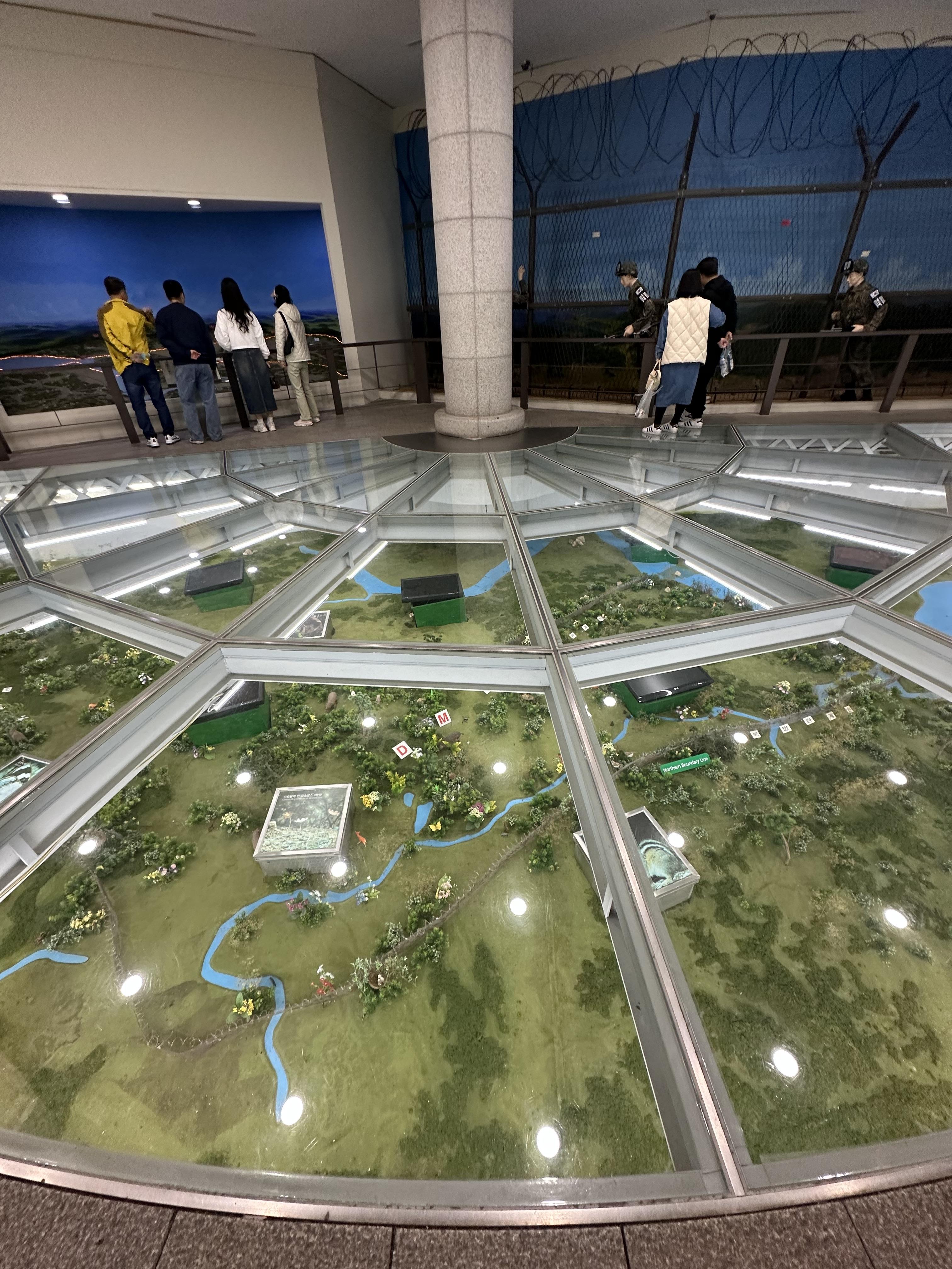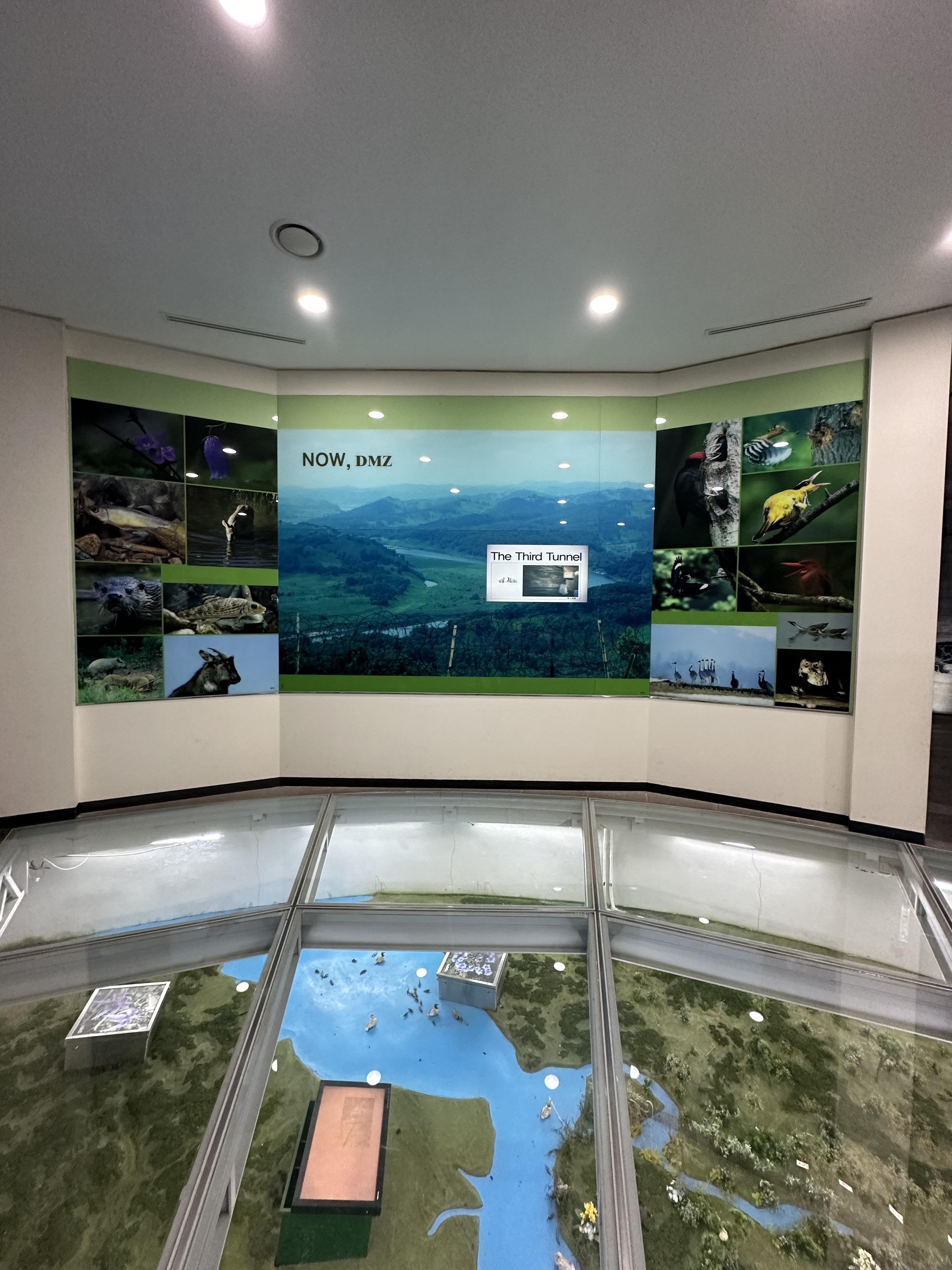 제3땅굴까지 모노레일을 통해 왕복 이동했습니다. 땅굴을 관람하고나서는 영상관으로 이동하여 북한이 땅굴에 대한 짧고 굵직한 영상 하나를 관람합니다. 지금은 땅굴보다는 북한이 계속해서 남한에 도발을 하고 있지만 과거 몇십년전에는 땅굴을 통해 침입을 하려는 흔적이 있었다고 합니다. 제3땅굴말고도 남한 여기저기에서 땅굴이 진화해서 발되었다고 합니다. 영상을 마치고 전시관을 걸어보는데요 전시관 마지막 부분 유리 바닥 아래에는 DMZ를 구현 한 것을 볼 수 있습니다. DMZ는 한반도에서 전쟁 이후 군사분계선 때문에 더 이상 개발을 하지 않아 야생동물이 발견될 정도로 청정구역이라고 해요.