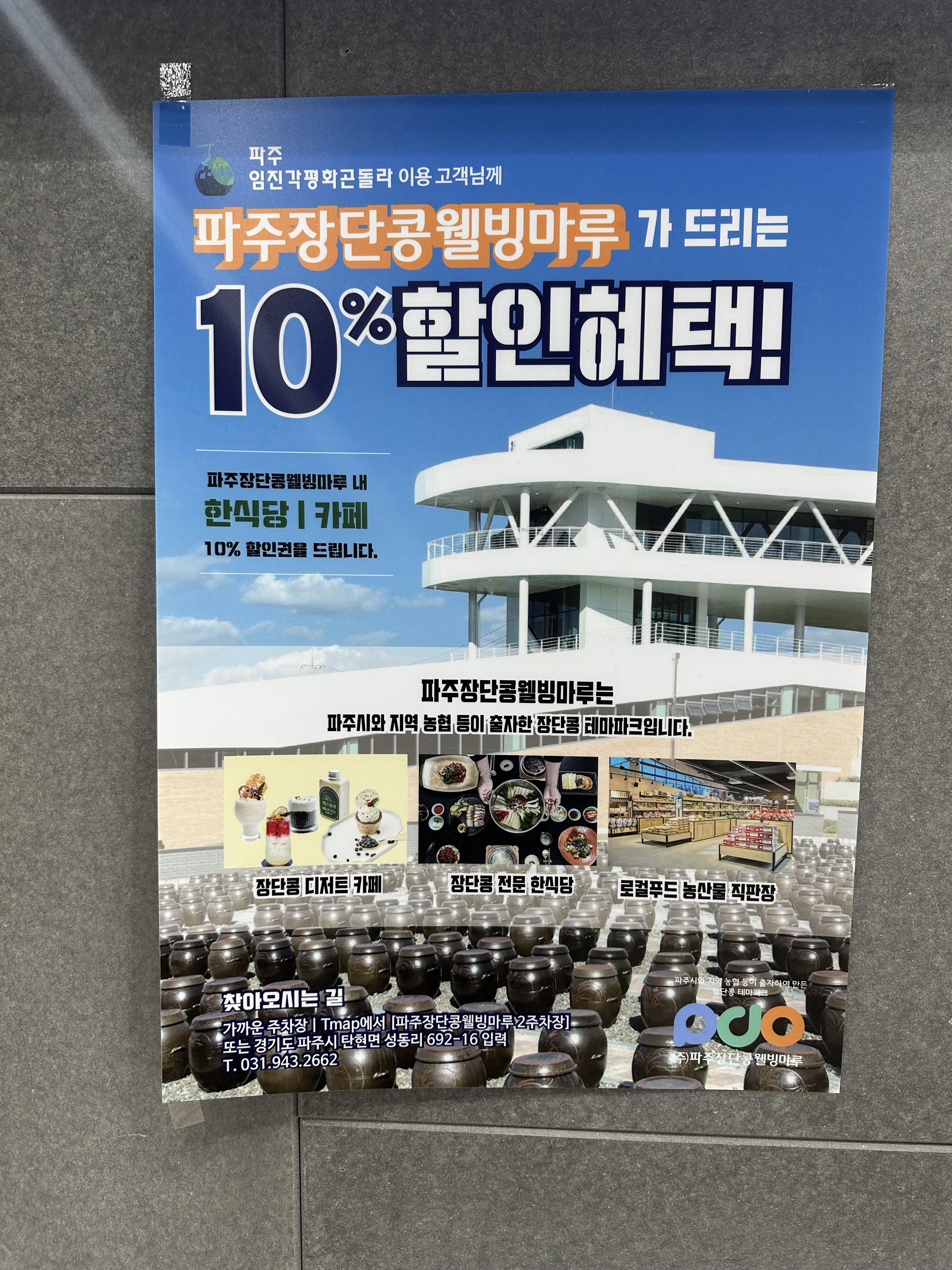 - 파주 임진각 평화 곤돌라 이용 시 파주장단콩 웰빙마루가 드리는 10% 할인 혜택이 있다고 해요