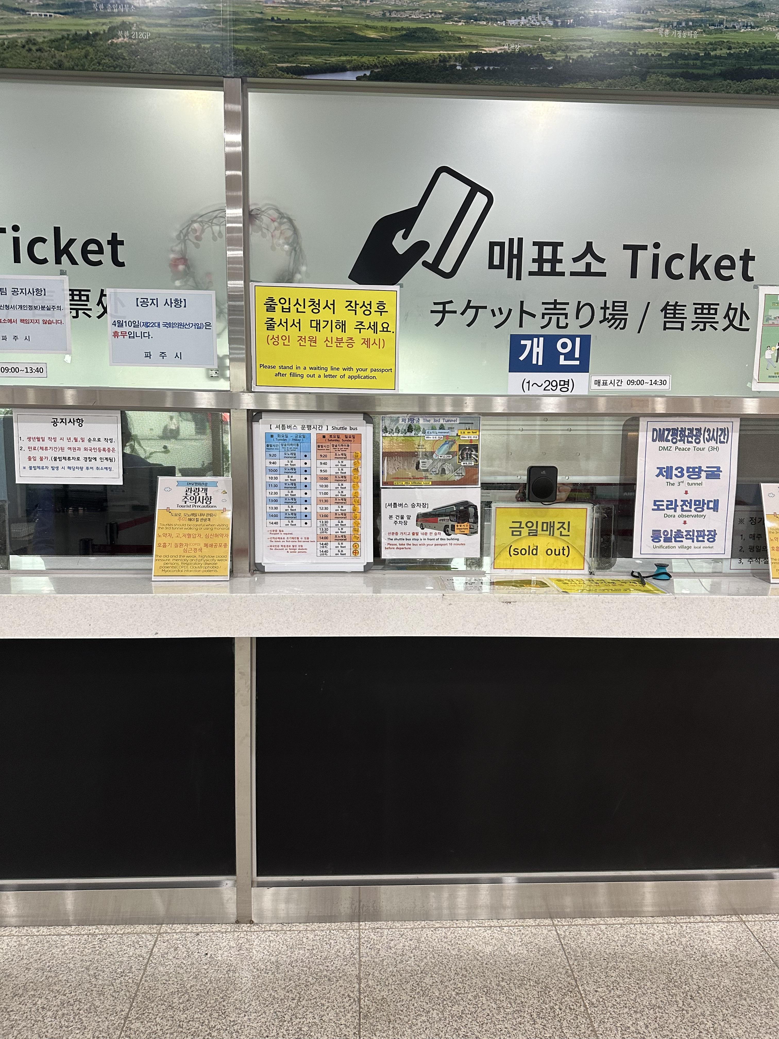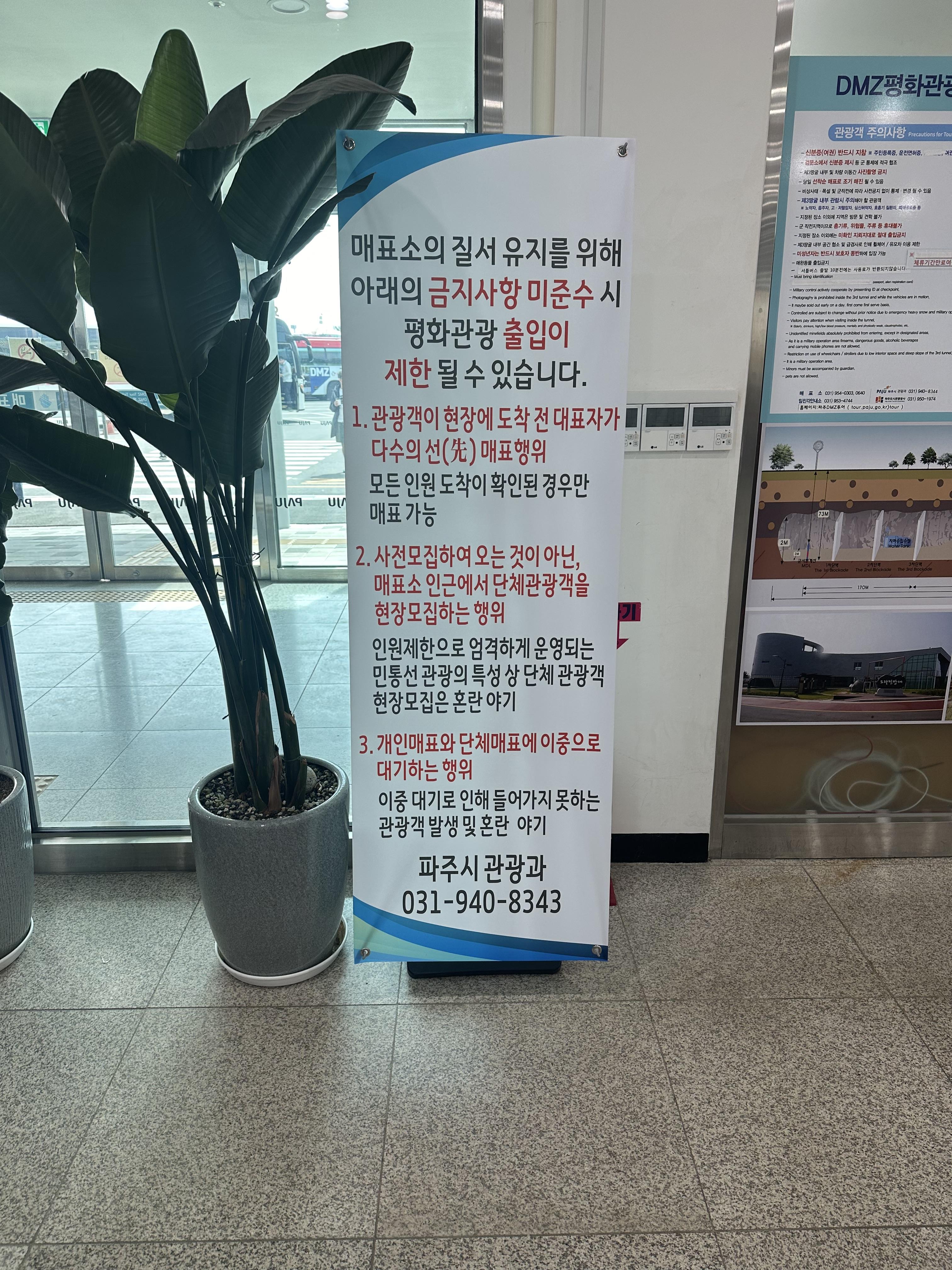 - DMZ 평화관광은 사전 예약은 없으며 당일 현장 방문하여 표를 구입해야 한다고 합니다.