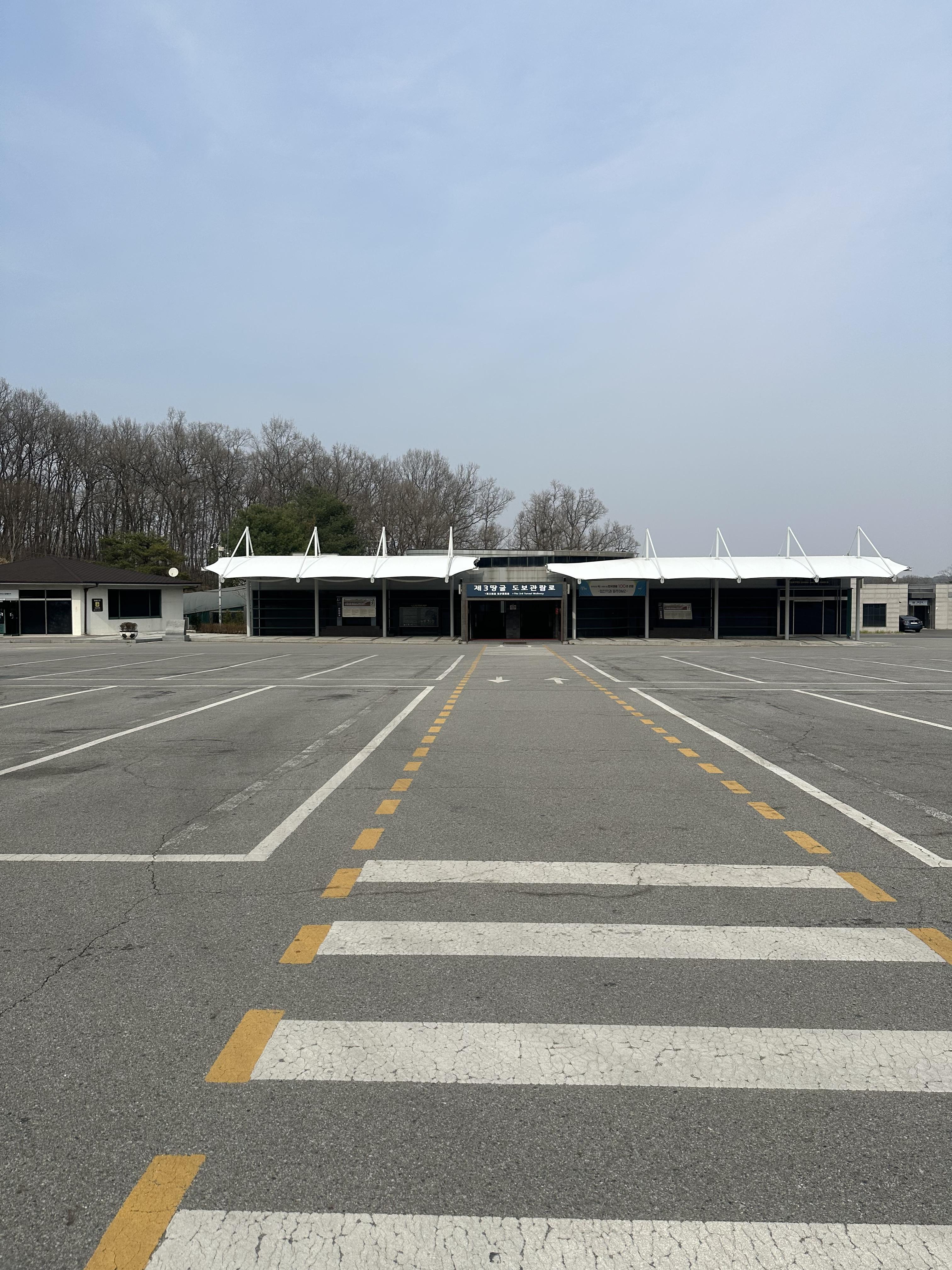 군 검문시설을 지나 얼마 달리지 않아 기사님께서 제3땅굴로 가기전에 인근에 남북출입사무소가 있다고 소개해주셨습니다. 이곳에는 오랫동안 정차 할 수 없다면서 5초정도 잠시 버스의 방향을 돌려서 사진을 찍을 수 있는 기회를 주셨습니다. 만약 DMZ 평화관광 버스 투어가 아니라 개인 자가용으로 가게 된다면 남북출입사무소앞에서는 사진 및 오랫동안 서있을 수 없다고 합니다. 참고로 남북출입사무소는 남한과 북한에서 행사가 있을 때 들르는 장소라고 하는데요. 북한에서 올림픽을 진행할 때 우리측 선수들이 남북출입사무소를 통해 갔다고 합니다. 다만 북한 갈때는 기자들을 제외하고 카메라나 핸드폰 등 모두 남북출입사무소에 반납하고 가야한다고 하더라구요. 아무튼 남북출입사무소의 역할은 남북이 교류할 때 들러서 가는 곳이라고 합니다.