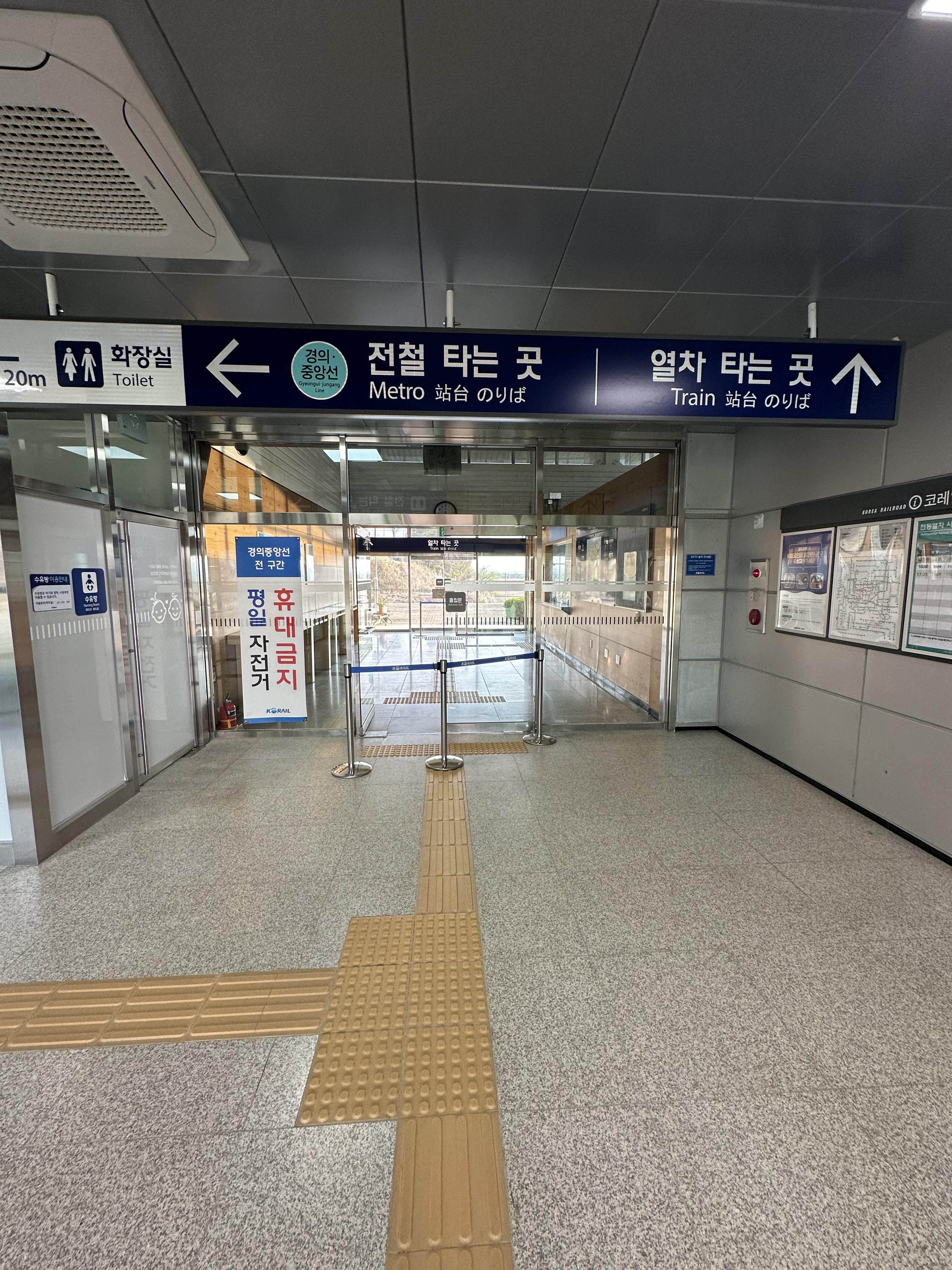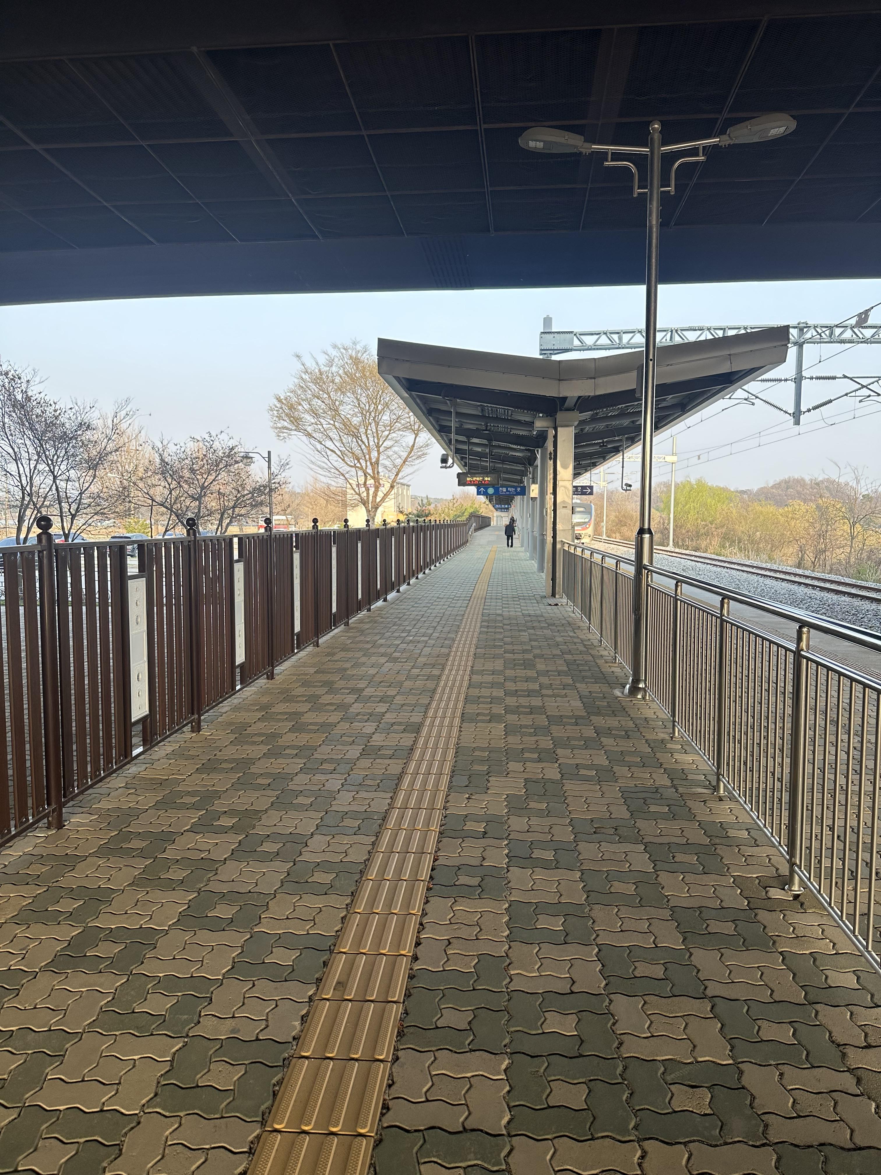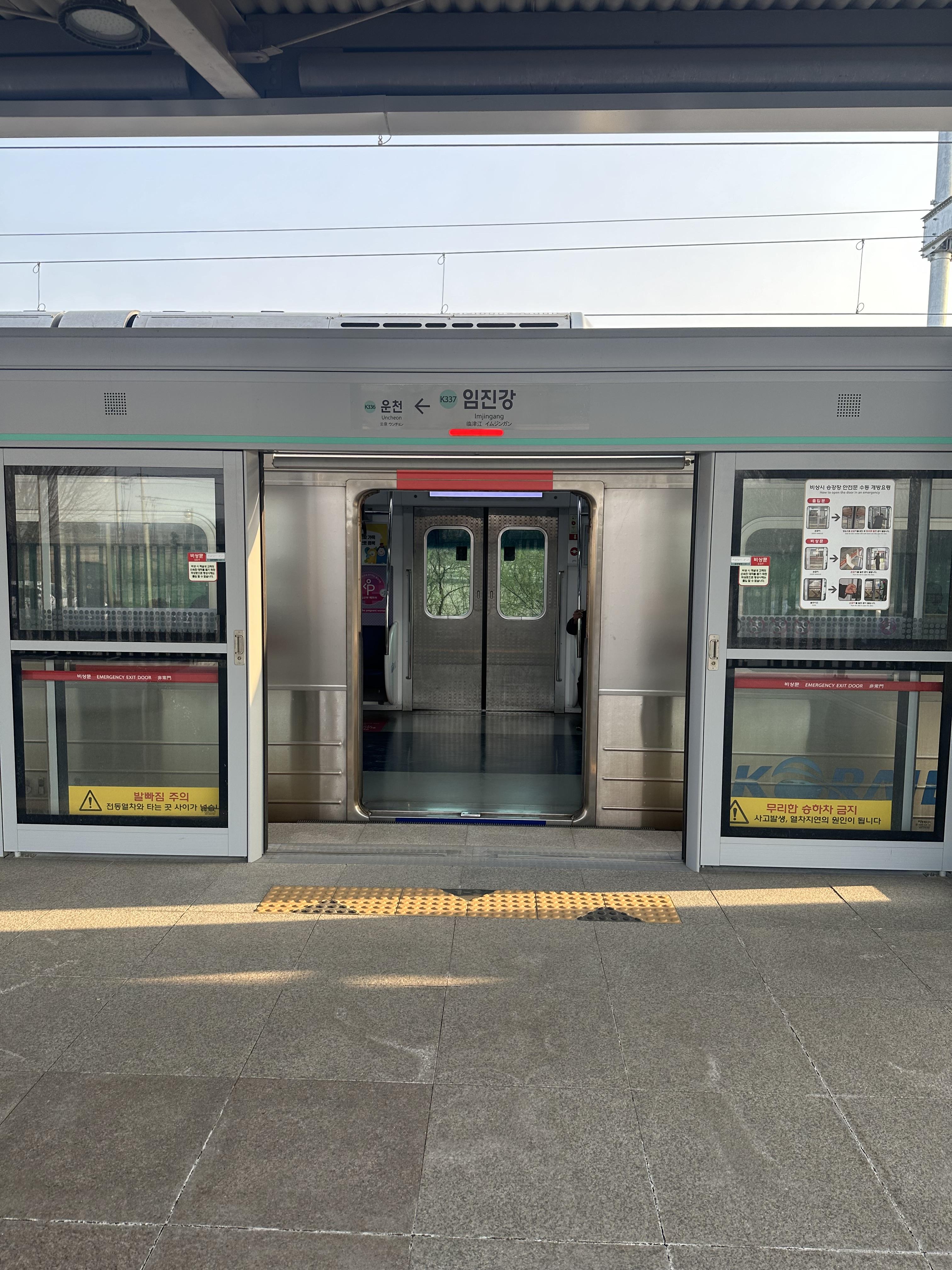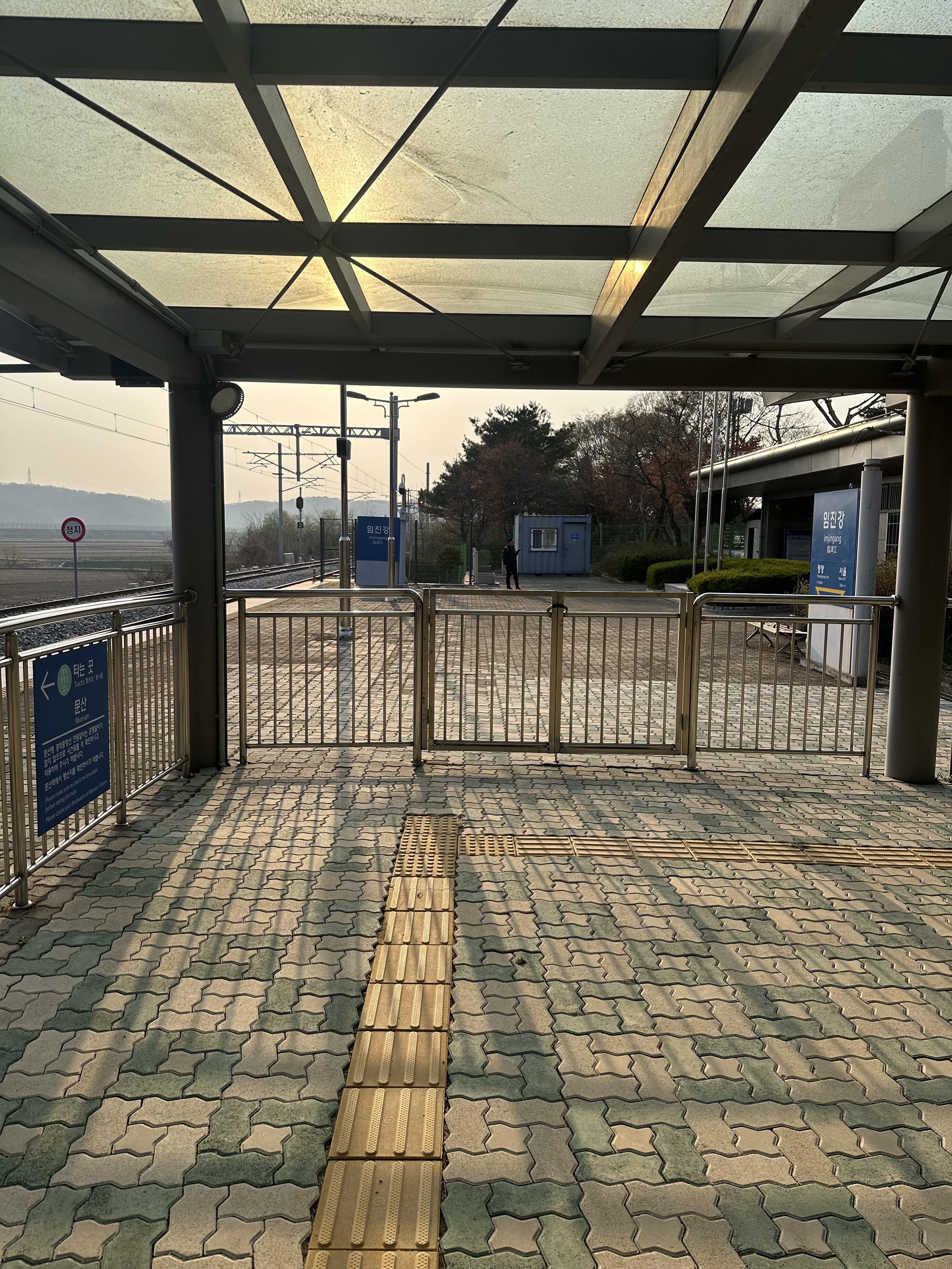 10년전에는 파주 평화누리 공원에서 민통선을 건너가는것은 생각치 못했는데요 그만큼 우리나라의 경제력과 군사성장력이 커져서 그런지 비교적 자유롭게 민통선을 돌아다닐 수 있는 것 같습니다. 그러나 아직도 우리나라는 분단 국가이기 때문에 민통선과 군사분계선을 지나갈때는 군인들의 통제하에 정해진 룰을 지키는것이 필요합니다. 임진강역에서는 평일 기준 17시 25분 막차와 주말 기준으로는 17시 45분 문산행 막차가 있습니다. 저는 당시 주말에 방문해서 17시 45분 문산행 열차에 곧 탑승합니다. 사실 평일이었다면 17시 25분이 막차여서 당시 DMZ 평화관광을 마치고 시간이 없어서 바로 열차타러 왔는데 시간상 여유가 있어서 탈수 있게 되었습니다.