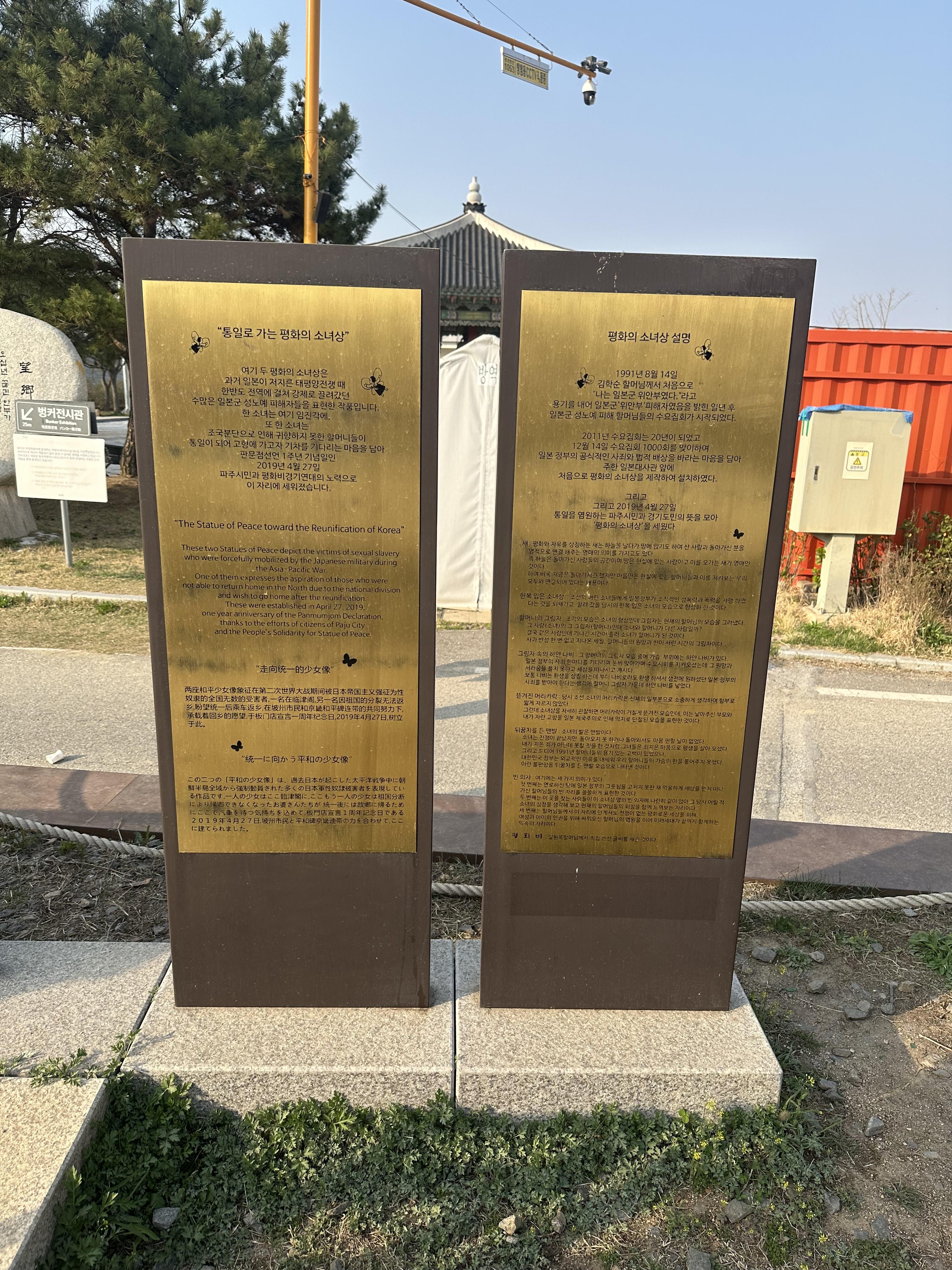 - 2019년 4월 27일 통일음 염원하는 파주시민과 경도민의 뜻을 모아 평화의 소녀상을 세웠다고 해요.