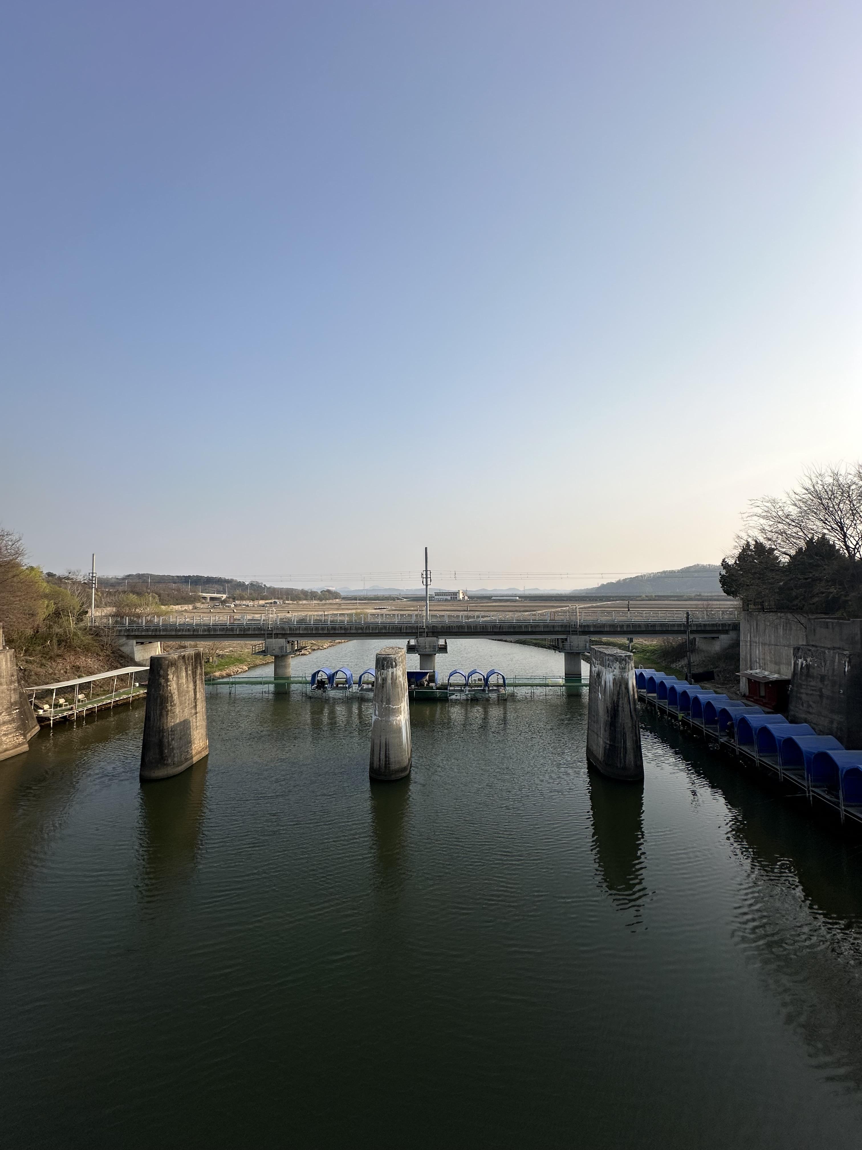 평화열차를 지나서 임진강 역이 눈앞에 보일정도면 임진강 건너편에 선로가 보입니다. 경의선은 원래 서울방향과 평양 방향으로 가는 선로가 있었습니다. 그런데 625 전쟁 이후 서울로 가는 선로는 파괴되었고 지금은 평양 방향으로 가는 선로만 있는 것을 볼 수 있습니다.