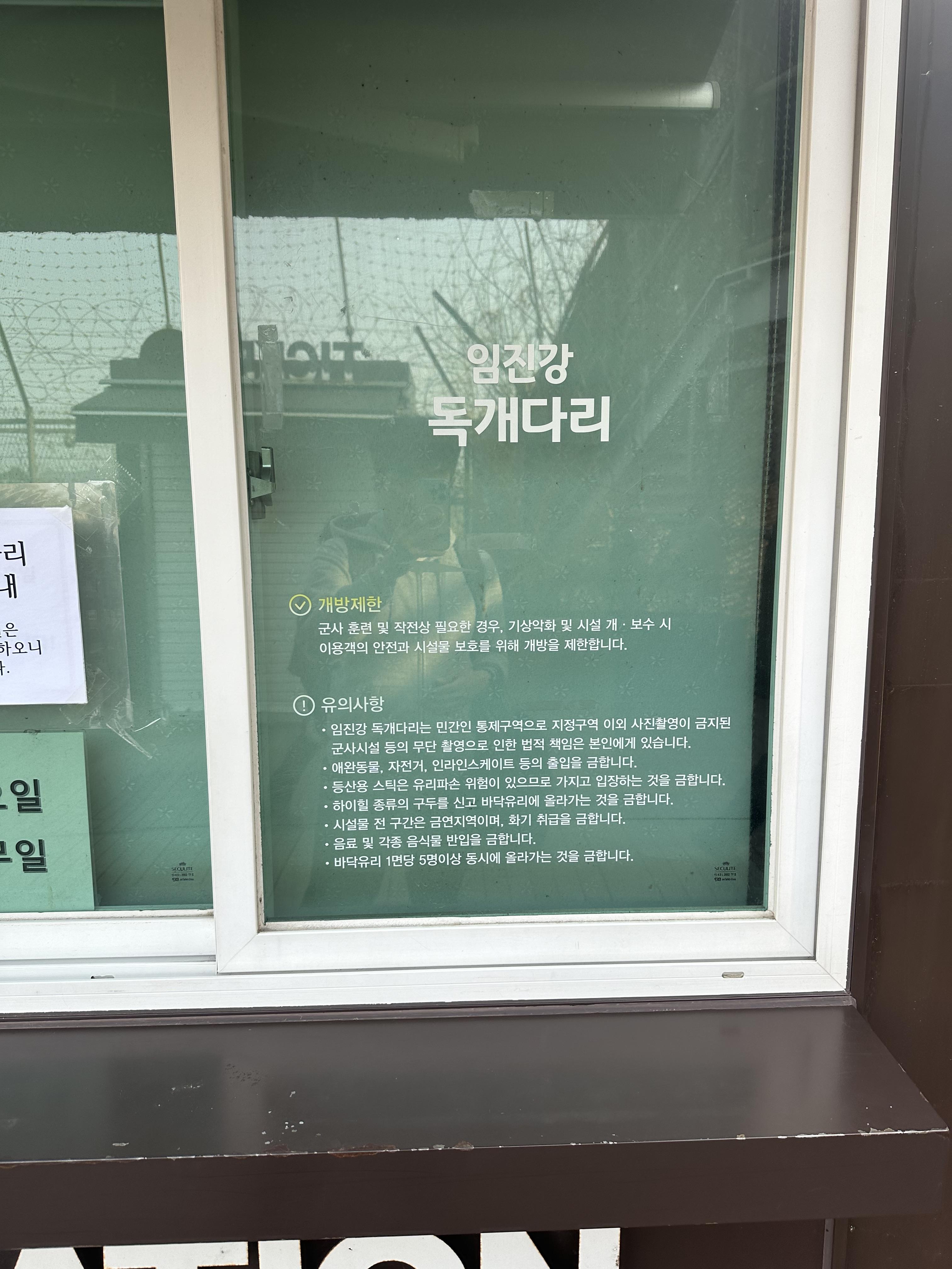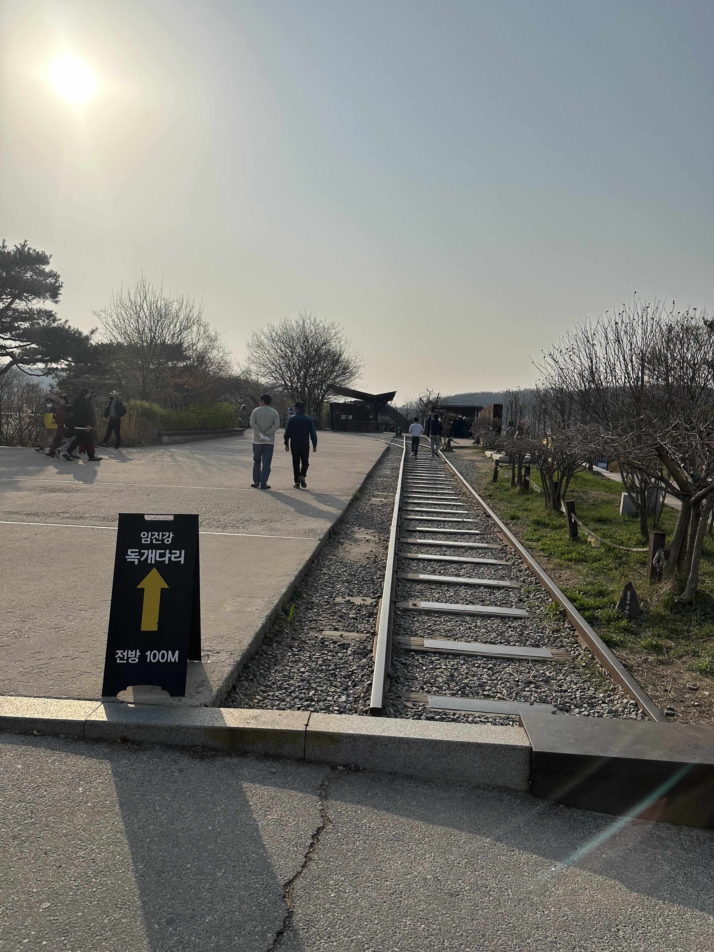 조금만 일찍 왔다면 임진강 독개다리까지 볼 수 있었을 것 같습니다. 이번 파주 임진각 여행의 목적은 DMZ 평화 관광 코스를 이용하기 위해서인데요. 그래서 아침일찍부터 표를 구할려고 했습니다. 그러나 오전에 표는 모두 매진될 만큼 인기가 많아서 오전에는 독개다리는 생각치 못하고 임진각 DMZ 평화 곤돌라 케이블카를 이용했습니다. 임진강에 언제 다시 갈지는 모르겠지만 다음에 간다면 독개다리도 한번 건너가봐야겠습니다. 이날 독개다리 갔을 때는 이미 마감을 해서 더 이상 볼 수없었는데요. 검색해서 확인해보니까 당시 선로를 그대로 두어서 관광객들이 선로 위를 걸어가며 당시 선로 위에 총탄의 흔적을 느낄 수 있는 관광상품 이였습니다.