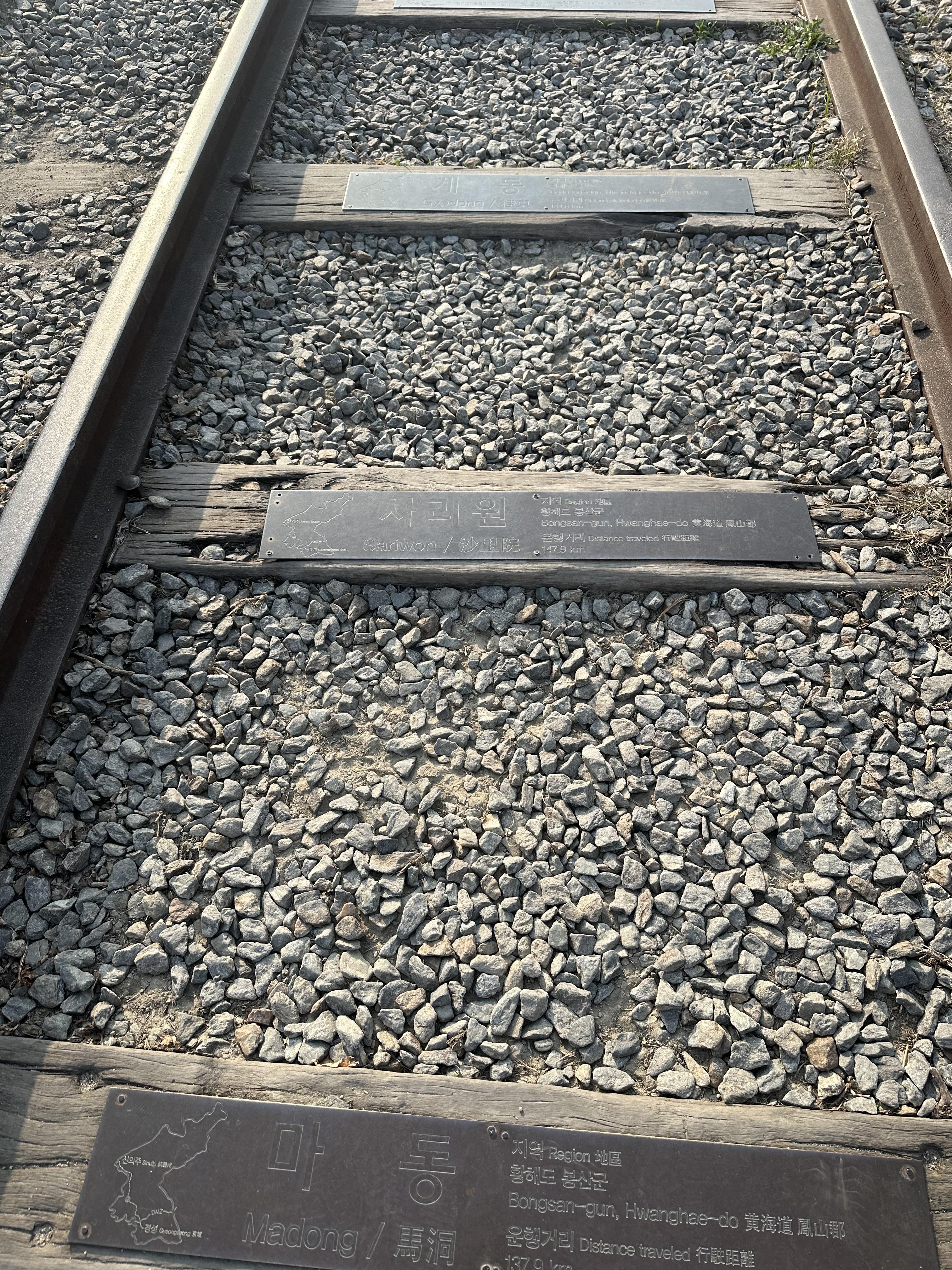 가장 먼저 임진각 독개다리로 가보게 되었습니다. 임진각 평화 곤돌라 케이블카에서도 방송으로 독개다리가 보였습니다. 그리고 DMZ 평화 관광 코스를 즐기는데 기사님이 독개다리도 가보라고 했습니다. 독개다리는 625 전쟁 때 부서진 선로입니다. 지금은 도라산역으로 가는 선로만 다시 공사하여 놓았지만 서울과 문산방향으로 가는 선로를 전쟁 때 부서진 이후 그대로 인 모습을 볼 수 있습니다. 독개다리로 가기 위해 경의선 선로가 보이는데요. 경의선 손리 위에는 사리원, 마동 등 북한의 철도역사 이름이 적혀 있었습니다.