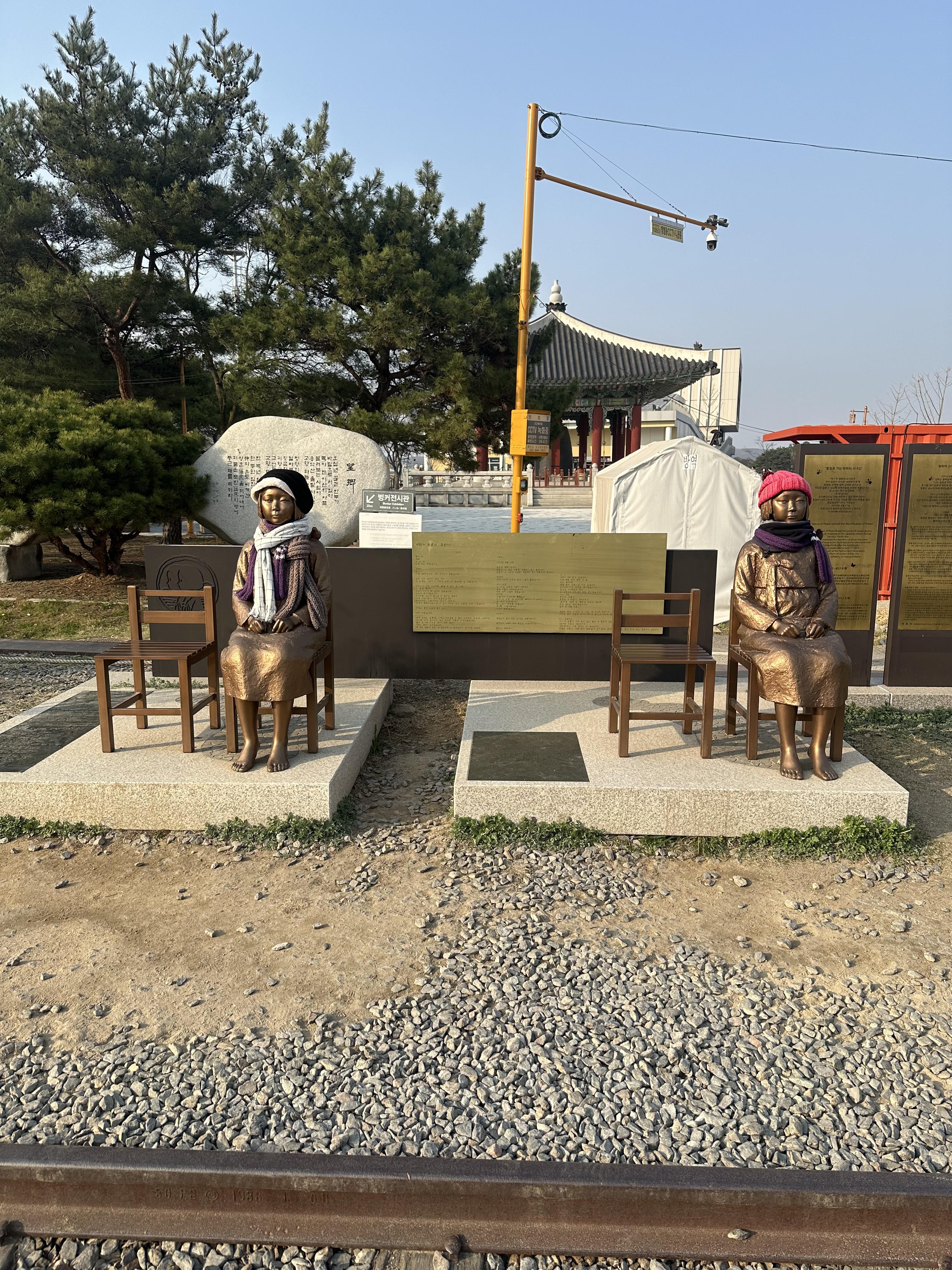 - 한 소녀는 여기 임진각에, 또 한 소녀는 조국분단으로 인해 귀향하지 못한 할머니들이 통일이 되어 고향에 가고자 기차를 기다리는 마음을 담아 판문점 1주년 기념일인 2019년 4월 27일에 파주시민과 평화비경기연대의 노력으로 이 자리에 세워졌다고 합니다.