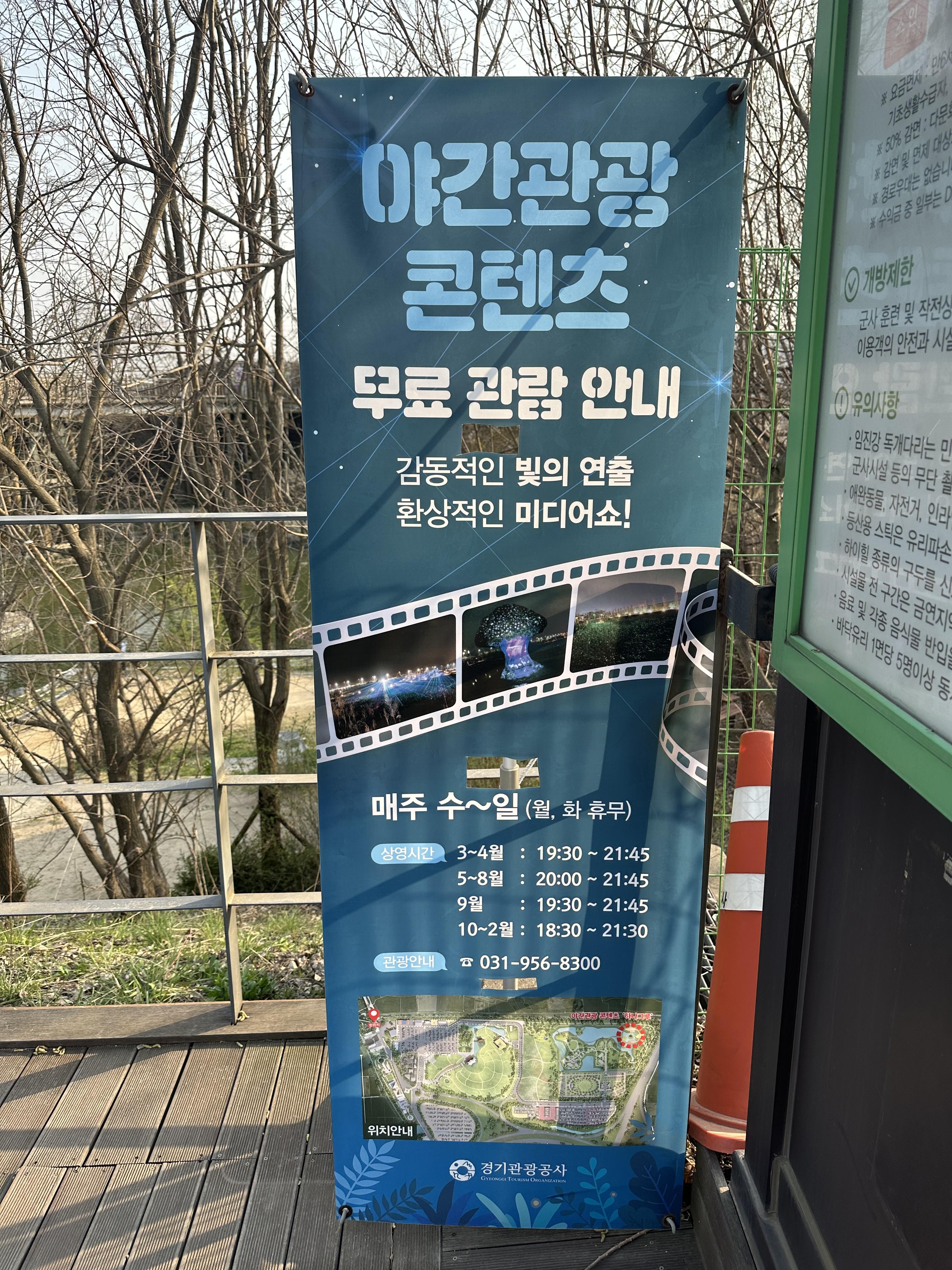 임진각에는 야간 관광 콘텐츠도 있었습니다. 감동적인 빛의 연출과 함께 환상적인 미디어 쇼를 볼 수 있다고 합니다. 봄 여름 가을 겨울 4계절 내내 즐 길 수 있다고 합니다. 다만 계절별로 운영시간이 다르니 참고 하시길 바랍니다. 임진각 야간 관광 콘텐츠의 경우에는 독개다리 입구 앞에 있었습니다.