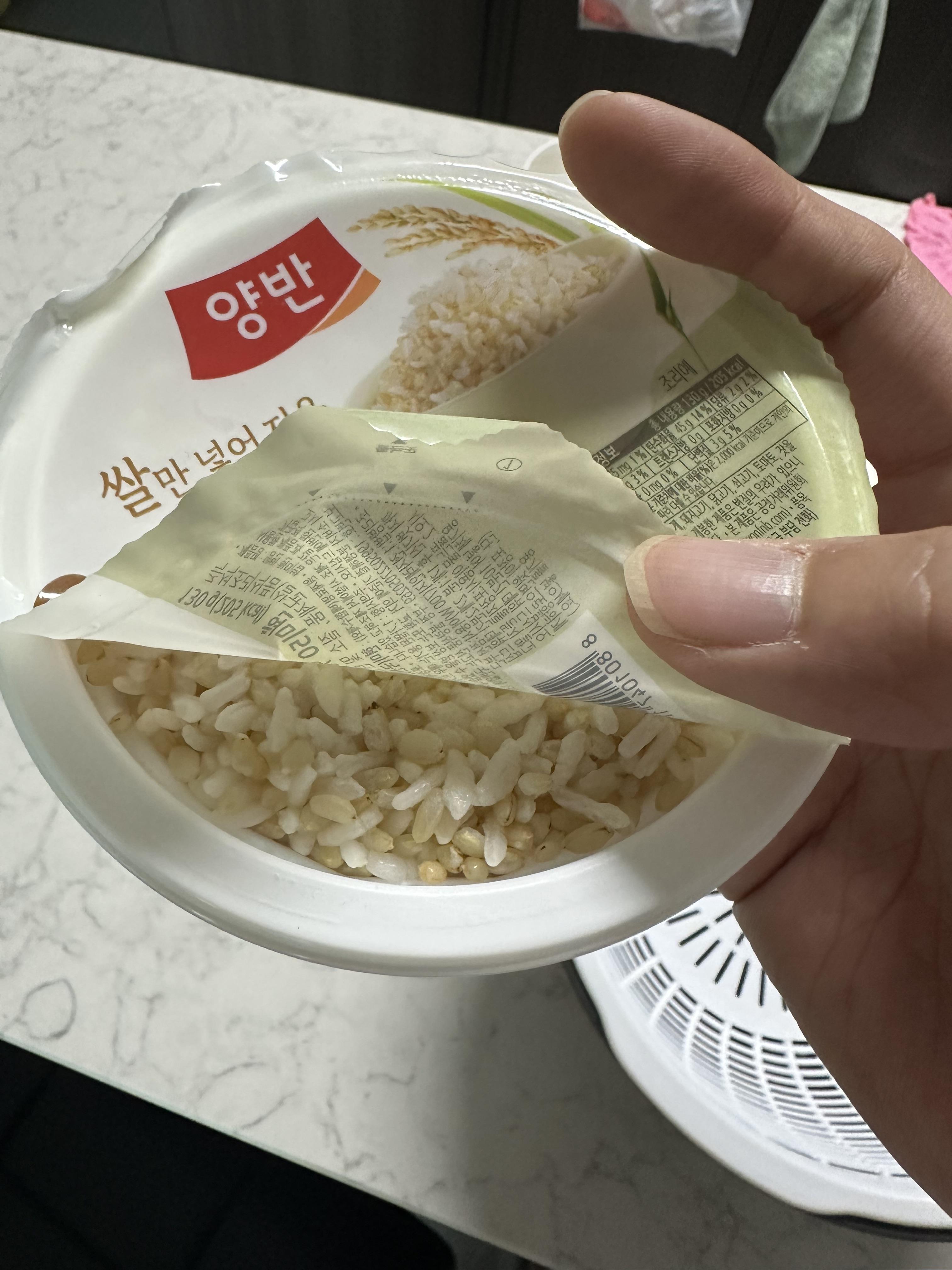이제 그럼 소용량 햇반 양반 현미밥 130g을 먹어보도로 하겠습니다. 다른 햇반과 마찬가지로 조금만 뜯어서 전자레인지에 1분동안 조리 하시면 햇반이 완성됩니다. 편의점에서 판매하는 일반적인 햇반은 2분에서 3분정도는 돌려야 하는데요. 소용량 햇반은 소용량이다보니 전자레인지 1분이면 금방 데워서 먹을 수 있습니다. 특히 혼자 살다보면 늦게 일어나서 밥을 못먹고 갈 수 있는데 1분만 데우면 되기 때문에 부담없이 즐겨먹을 수 있습니다.