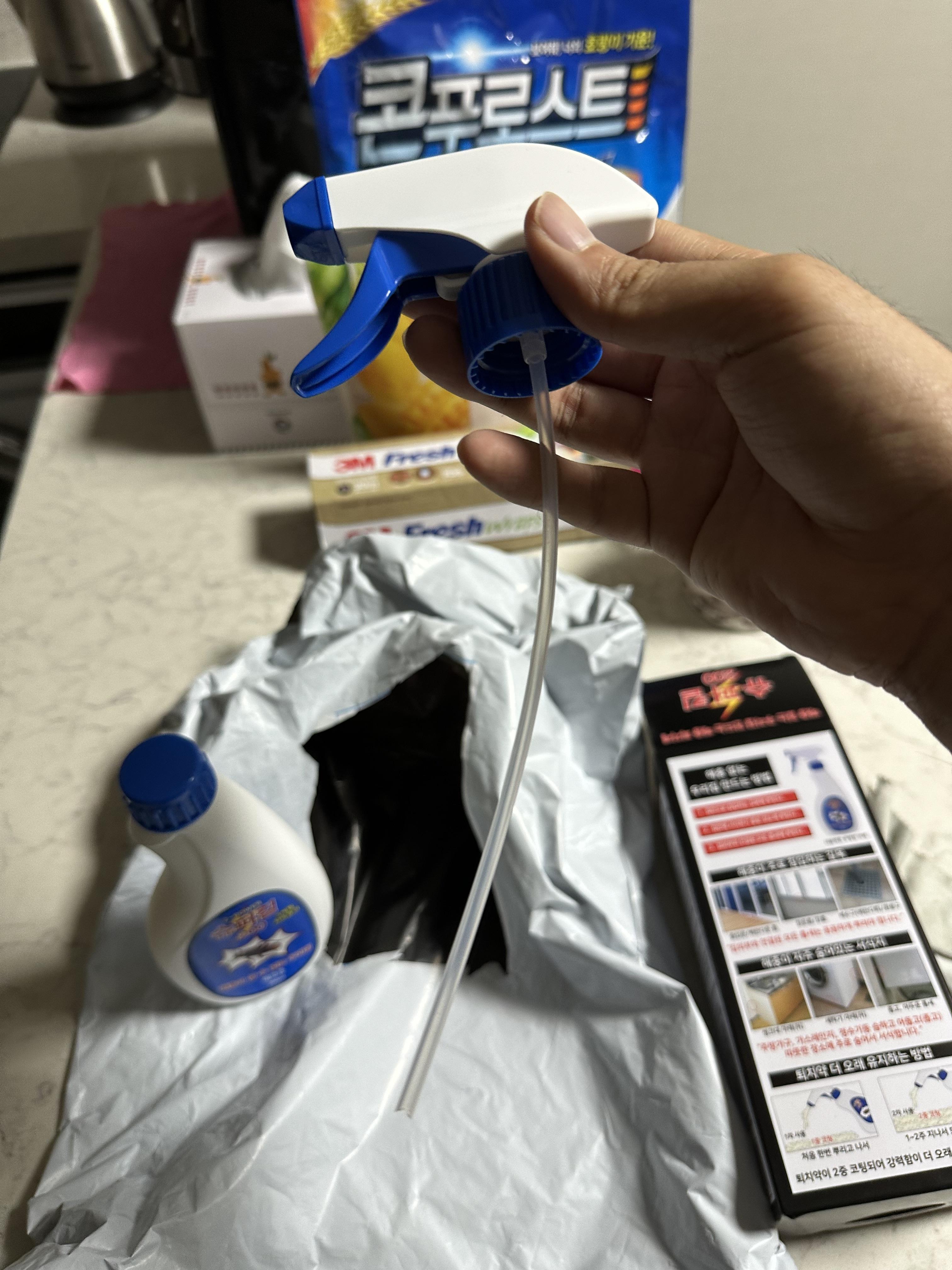 제품 상자에서 제품을 개봉했습니다. 뿌리는 바퀴벌레 퇴치약이라서 분무 할 수 있도록 분무기가 동봉 되어 있었습니다. 보통은 분무기가 약재에 직접 꽂혀있는데 해당 제품은 분리가 되어있었습니다. 기본적으로 분무기는 스탑 상태로 제품과 연결해도 나오지 않을 것입니다.