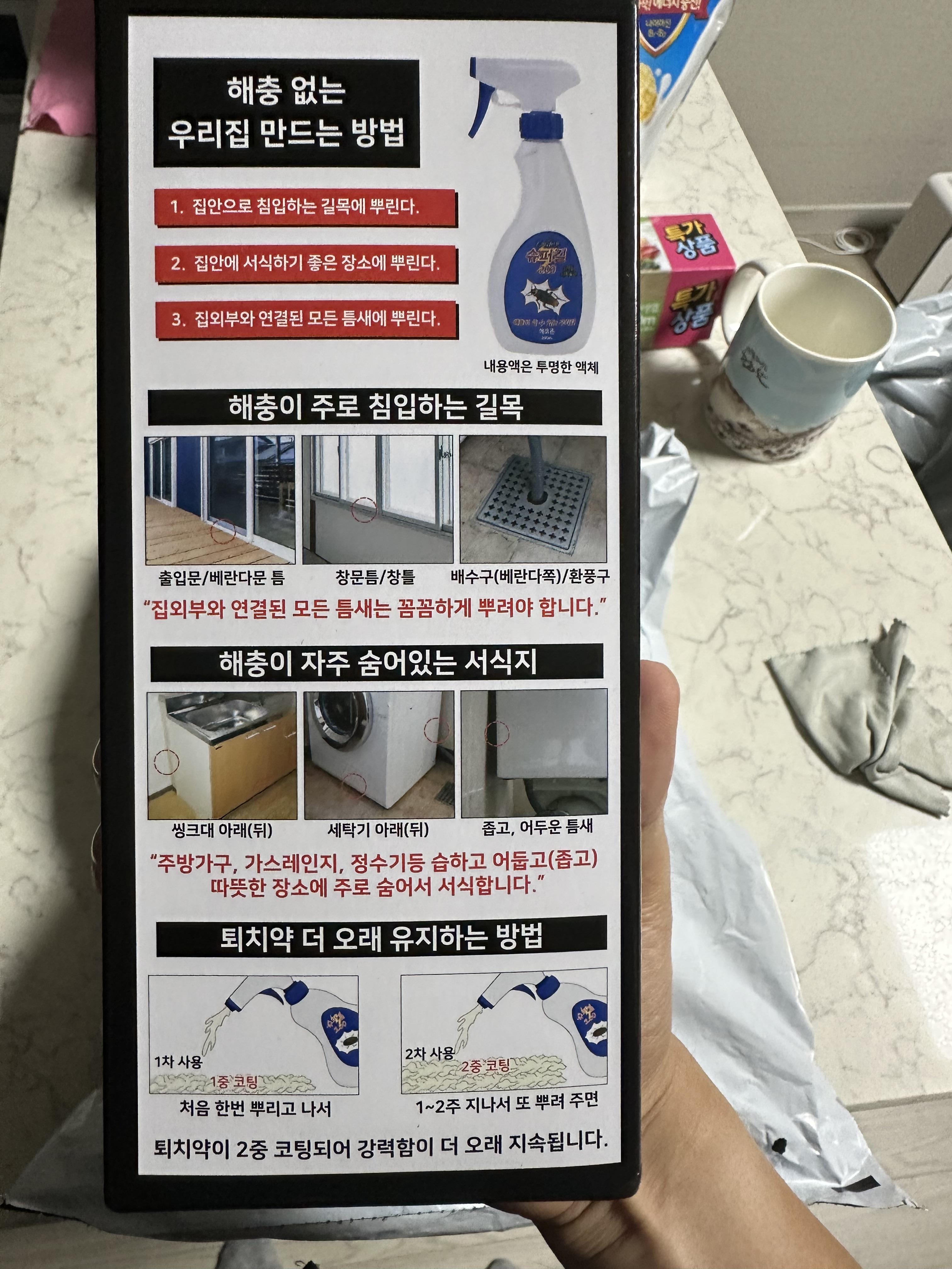 - 일주일 뒤에 퇴치된 벌레만 나온다면 남은 1개는 2~3개월 뒤에 한번 더 뿌려서 확실하게 방어 합니다.